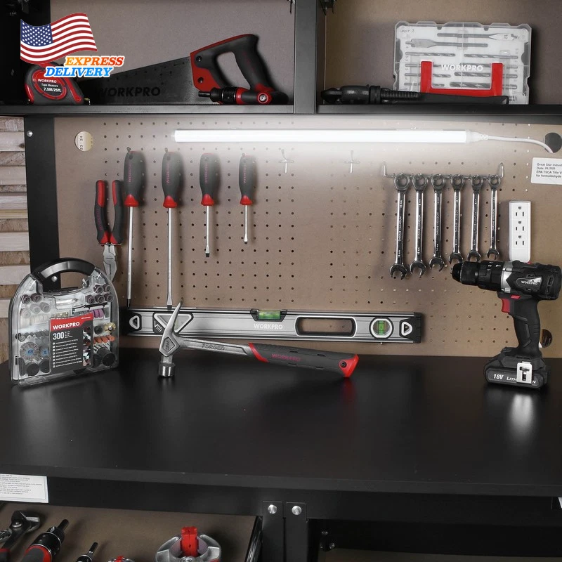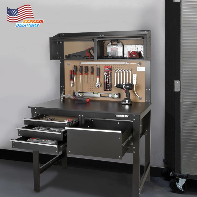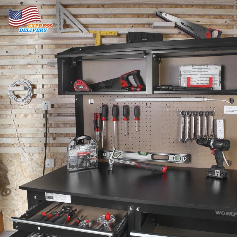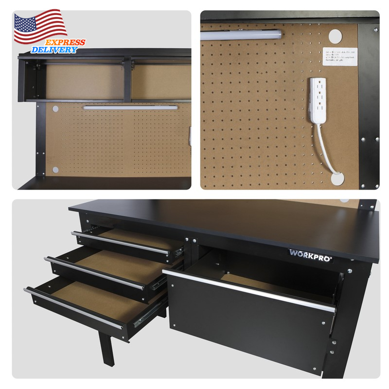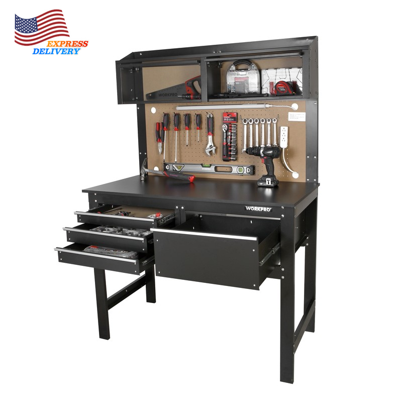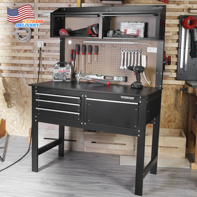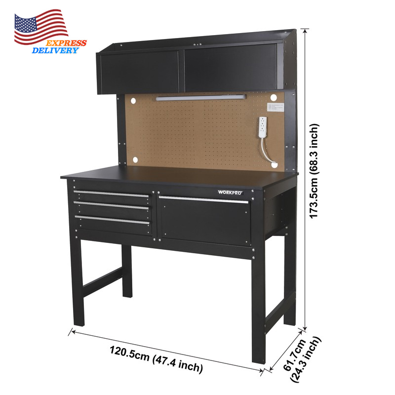 This WORKPRO 2-in-1 48-Inch Workbench and Cabinet Combo with Work Light is designed to help you get the job done. This workbench is built tough and features everything you need to keep your workspace organized and functioning smoothly. This heavy duty workbench has an all steel frame with a rust resistant surface, so you can feel confident that this workbench will live through the work it is put through. It has four drawers that adds the extra storage space to hold all the tools needed to complete the job at hand. Additional storage is available with the overhead cabinets to really give you all the space you need for your tools and parts. The workbench has a 5W tube work light that is ETL Certified as well as an attachable power strip. The maximum capacity of this Heavy Duty workbench is 558 lbs. This workbench is the perfect addition to your garage or workshop. It serves as both a workbench for all your DIY projects as well as a cabinet for your garage storage all in one compact unit. Handle the Heavy Load of Tool Storage. All-Steel Frame Rust-Resistant Surface Power Strip Attached to the Workbench WORKPRO 5W Work light Included Can hold up to 558 lbs. 4 Drawers and 2 Cabinets for Extra Storage Peg Board Backer for Various Peg Board Accessories Great for a Garage or Workshop