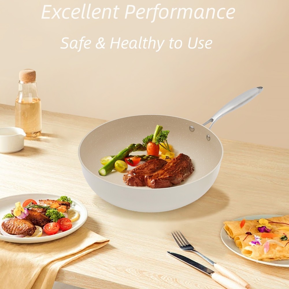 Specification Material: Aluminum, Stainless Steel, Silicone Color: Milky White Process: Medical Stone Coating Style: Modern Assembly Required: No Mounting Type: Tabletop Capacity: 4.8L/162.33oz Mouth Diameter: 30cm/11.81in Depth: 9.5cm/3.74in Lid Height: 15cm/5.9in Applicable Number of People: 4-6 Package Size: 54*37*14cm/21.26*14.57*5.51in Gross Weight: 2.6kg/5.73lbs Net Weight: 2.4kg/5.29lbs Package Included 1* Frying Pot with Lid 1* Spatula Notes 1.Please do not allow the oil temperature to rise above 392℉. 2.Please do not use hard materials such as steel wire balls to clean the cookware. 3.The pot is dry in the first stage, it is recommended not to cook noodles or starchy food, and the operation will be better in the later stage. It is recommended that you control the fire when 4.8L Nonstick Frying Pot Skillet With Lid Healthy Chef Pot Efficient Cooking Description Traditional iron or stainless steel frying pots can cause your food to stick to the pots, but our non-stick pot is a good solution to this problem. It is an efficient cooking tool that combines natural medical stone coating with modern non-stick technology, combining natural beauty and practicality, aiming to bring you a healthy and relaxing cooking experience, whether it's sauteing, stir-frying, or stewing. Key Features Made to Last: Our product consists of a high-quality aluminum pot with a stainless steel handle, treated with a medical stone coating that is sturdy and heat-resistant, non-stick and stain-resistant, ensuring long-term beauty and practicality. Excellent Performance: This product uses a high-fold heat circulation layer, a heat-conducting alloy layer, a sturdy wear-resistant base layer, and pebble-suspended microparticles to make it heat up quickly, and it also achieves a double non-stick effect inside and out. Efficient Cooking: Without the steam outlet on the lid of this product, this product makes a stronger seal between the lid and the pot, forming a good seal and internal circulation mechanism for steam, which can cook food evenly and quickly while also maintaining the temperature of the food and preserving its flavor. Large Capacity: The 3.74-inch deepening pot and large capacity of 162.33oz can cook enough food for 4-6 people at one time, thus satisfying you and your family's eating needs. Safe & Healthy to Use: This product is PFOA-free to reduce the hazards of grease and smoke, making it convenient for you to prepare safe and healthy food while maintaining its non-stick properties. Exquisite Appearance: The smooth milky white surface and smooth lines with silver handles and a pebble-shaped cover bead make it elegant and classy, adding a bright landscape to your kitchen as well. Effortless Cleaning: Its smooth surface and non-stick coating make it less likely to accumulate grease, making it easy for you to clean and maintain. Ideal Gift: With good performance and a modern appearance, it can be used as an ideal housewarming gift for parents, friends, and lovers so that they can also enjoy more delicious and healthy food. Good Customer Service: We aim to provide quality products and services. If you have problems, please feel free to contact us. We will reply and solve the problem for you as soon as possible. Details Anti-scald Handle: The stainless steel handle has good insulation and heat resistance to improve your safety. Threaded Bottom: This design makes it more wear-resistant and non-slip, enhancing its practicality. Application This product is suitable for gas cooktops, induction cooktops, electric ceramic ovens, etc. This pot can be used for sauteing, stir-frying, braising, and boiling. Specification Material: Aluminum, Stainless Steel, Silicone Color: Milky White Process: Medical Stone Coating Style: Modern Assembly Required: No Mounting Type: Tabletop Capacity: 4.8L/162.33oz Mouth Diameter: 30cm/11.81in Depth: 9.5cm/3.74in Lid Height: 15cm/5.9in Applicable Number of People: 4-6 Package Size: 54*37*14cm/21.26*14.57*5.51in Gross Weight: 2.6kg/5.73lbs Net Weight: 2.4kg/5.29lbs Package Included 1* Frying Pot with Lid 1* Spatula Notes 1.Please do not allow the oil temperature to rise above 392℉. 2.Please do not use hard materials such as steel wire balls to clean the cookware. 3.The pot is dry in the first stage, it is recommended not to cook noodles or starchy food, and the operation will be better in the later stage. It is recommended that you control the fire when you use it, use medium fire for stir-frying vegetables, and use low fire for frying meat and sautéing things. 4.products support the use of a new induction cooker, the old induction cooker may not be recognized, the general stir-fry heat acceptance range of 1200w ~ 1800w. Due to the bottom of the pot's heat capacity, it is recommended that no more than 2000w. 5.The gas cooking stove is recommended to be used with low to medium heat. Please note that the gas stove itself has a floating fire extinguished situation, it is recommended to do dishes in a timely manner after cleaning the pot and pot surface, to avoid leaving stains in the second fire extinguished caused by adsorption to strengthen the stains caused by the difficult to clean the phenomenon. (Normal circumstances can be avoided) 6.Please put a little oil when using it to avoid empty and dry burning. Please allow the slight color difference caused by the shooting light and 1-3cm error due to manual measurement, and make sure you do not mind before ordering. Payment Delivery details Terms of sales About us Contact us Payment We accept ebay payment 。 Fees such as import duties, taxes are not included in the item price or shipping costs. These charges are the buyer's responsibility. Delivery details Shipping: 2-9 working days to: USA Terms of sales We maintain high standards of excellence and strive for hundred percent customer satisfaction. Feedback is very important to us. We hope that you contact us immediately before you give neutral or negative feedback, so that we can