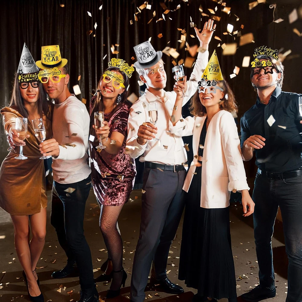 New Year Party Favors Kit: Includes 6 top hats, 9 cone hats,9 Happy New Year headbands (in classic black, gold, and silver), 24 party eyeglasses—offering a complete set of festive accessories to elevate your New Year celebrations. Quality Material: Our 2026 New Years Eve party supplies—including cone hats, headbands, and glasses—are crafted from sturdy cardstock and durable plastic-paper. safe, odor-free, and kid-friendly, perfect for New Year gatherings. Unique Design: Our nye party favors set features “Happy New Year”, reflective firework patterns, plus subtle glitter details on headbands. Under party lights, it emits a soft glow—helping everyone stand out naturally in the crowd while adding strong festive vibes to group photos. It effortlessly turns wonderful moment into unforgettable 2026 New Year snapshots. Easy to Use: The new years decor set assembles quickly without tools, features lightweight materials for comfortable wear. It includes ready-to-use noise makers, is easy to fold, store, and reuse after parties, ensuring convenience and hassle-free use throughout. Perfect for Every New Year Occasion: Whether it’s a home New Year’s Eve party, family reunion, friend get-together, or even office celebrations—this kit has all the decor you need. It’s also a great New Year gift for kids or friends, bringing joy and festive vibes to their celebrations. Product description