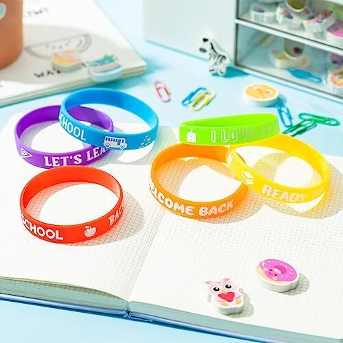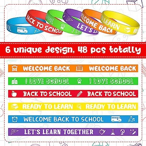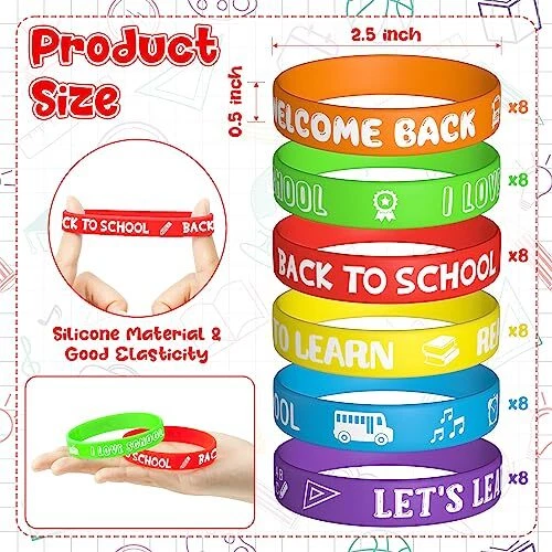 Return Policy Fast Delivery Trusted seller 48Pcs Back to School Silicone Bracelets, Colorful Happy Welcome Back to School Stretch Wristbands Rubber Bracelet Students Rewards for Party Favors Supplies Goodie Bag 6 Colors Product Description Beautiful Design: The colored silicone wristband features the words "WELCOME BACK TO SCHOOL","I LOVE SCHOOL" and graphic designs such as school bus, apples and books. 6 vibrant colors will make it even more attractive and stand out. Children can choose their favourite colour to wear, simple and cute. Huge Set: 48 pieces silicone bracelets in different colors, red, orange, green, purple, yellow and blue, each color for 8pcs, enough for a class party. Material: Back to school silicone bracelets are made of silicone, stretchable and flexible, soft and comfortable to wear, durable toughness enough to bear daily wear, easy to wear and take off. Size: The size of the silicone wristband is about 1.2 cm / 0.5in width, and 20.2 cm / 8in circumference, with a certain stretchy enough to fit most people. Gift Choice: Great gift and gift bag filler for students, classmates, friends, family or anyone celebrating of kindergarten or back to elementary school ! Shipping Returns Payment Shipping Shipping is FREE to all addresses other than APO/PO boxes in the lower 48 states. All our stock ships from US-based warehouses. Shipped via USPS or UPS (depending on location and package weight) Unless stated otherwise, all orders will ship within 24-72 hours of your payment being processed. Check our feedback to see the great reviews of FAST shipping we offer. Returns Seller does not accept returns Payment We currently accept payment via eBay managed payments only. Once payment is cleared, we will dispatch your shipment within 1-3 business days. Please refer to the "Shipping" tab for more information regarding shipping speed to your destination.