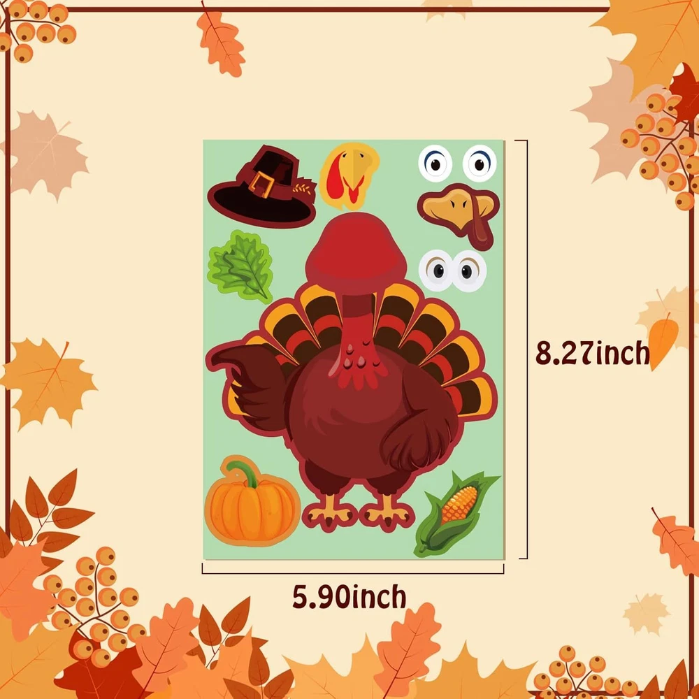 48Pcs Thanksgiving Stickers Make-A-Turkey Thanksgiving, Multicolor Product Details Brand: Dendrim Age Range (Description): Kid Color: Multicolor Theme: Games,Leaf,Pumpkin,Thanksgiving Cartoon Character: Turkey Material: Thanksgiving Seasons: All Seasons Included Components: Paper Size: Thanksgiving Number of Pieces: 48 Style: Thanksgiving Special Feature: Customizable Turkey Stickers & High-Quality Material Art Craft Kit Type: Sticker Turkeys Manufacturer: Dendrim Package Dimensions: 8.27 x 5.98 x 0.47 inches Item Weight: 12.6 ounces 48pcs Thanksgiving Stickers: Package come with 8 different turkey stickers, 6 piece/per style. Contains rich thankgiving characteristic, such as maple leaf, pumpkin, mushroom, corn, apple, dessert, hat and more. Make a Turkey Stickers: All thanksgiving stickers comes with two or three types of eyes and mouths, so kids can design their own turkey. Can stimulate children's imagination and creativity. Suitable Occasion: Autumn stickers can be as thanksgiving games, thanksgiving crafts for kids, thanksgiving party favors, thanksgiving class project, thanksgiving gifts for kids. Thanksgiving stickers can be stick on gifts boxes, gifts bags, greeting cards, envelopes. High Quality: Thanksgiving crafts is made of high quality paper, strong stickiness. The size is 8.27x 5.9inches, can be put into goody bags easily. Easy to Stick and Peel:Fall stickers are easy to stick and tear and without leaving marks. Can be stick repeatedly. Cute turkey shape and bright colors designed, thanksgiving stickers for kids will bring more fun to your kids.