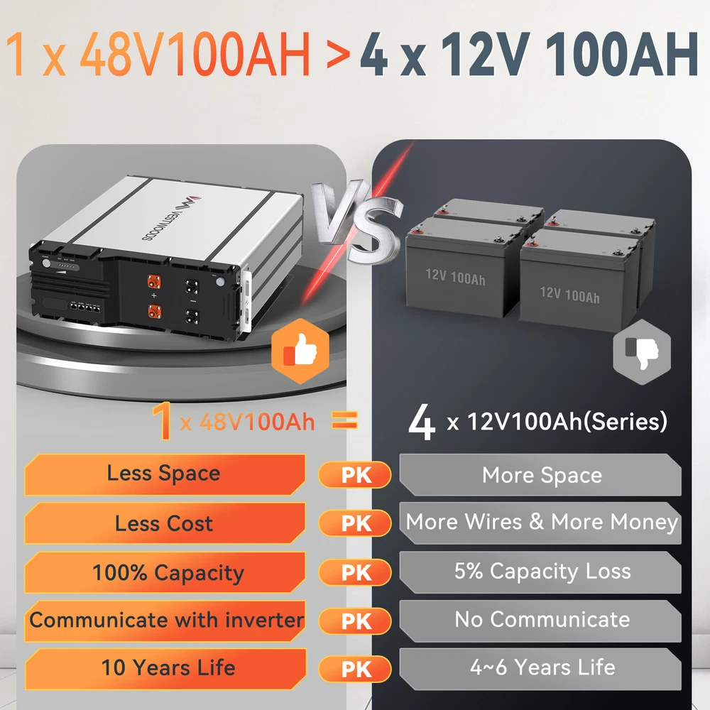 Vestwoods newest 48V 100Ah solar lithium battery. It uses an aluminum alloy shell, which is more durable and lighter. It can be installed in a rack or mounted on the wall. The item includes a wall mount . Vestwoods 48V 100Ah battery is IP54 waterproof, allowing it to be installed outdoors under eaves, or in large RVs, yachts, and overnight trucks. The item includes a set of waterproof cable. The 48V battery contains 16Pcs high-quality LiFePO4 cells from CATL. The battery can provide 100Ah 5120Wh capacity. The battery life is up to 10-15 years, 6000+ deep cycles, Max. 15000 cycles. Vestwoods 48V 100Ah LiFePO4 battery has a built-in 100A BMS and can continuously provide 5120W of power. The battery supports communication with some models of inverters via CANBUS and RS485. The battery can also work normally without communication. Rated Charge Voltage: 57.6V Rated Capacity: 100Ah, 5120Wh Support Low-temp Cutoff Max. Continuous Discharge Current: 100A Max. Continuous Charging Current: 100A Allowed Humidity Range: ≤95% RH Temperature Range of Charge: 32~140° F Temperature Range of Discharge: -4~140° F On Nov 12, 2024 at 17:27:19 PST, seller added the following information: On Dec 19, 2024 at 16:29:59 PST, seller added the following information: