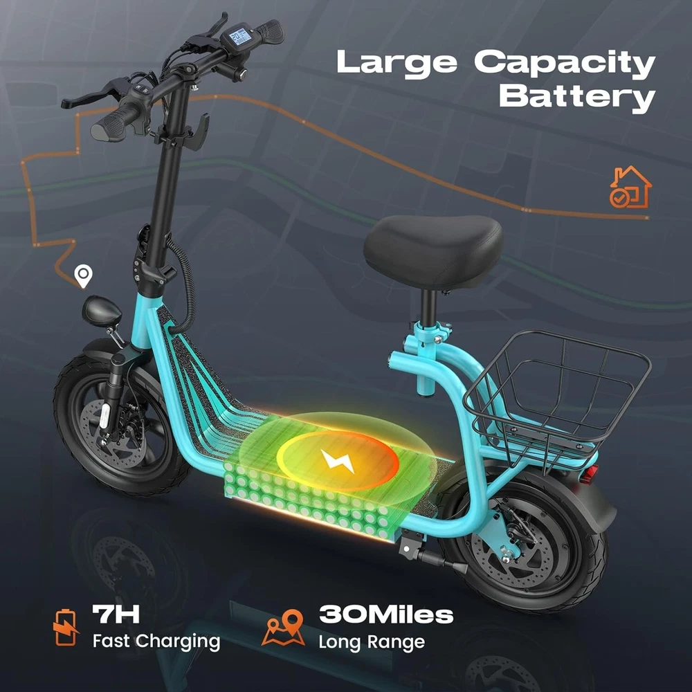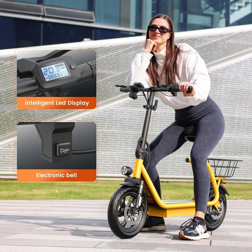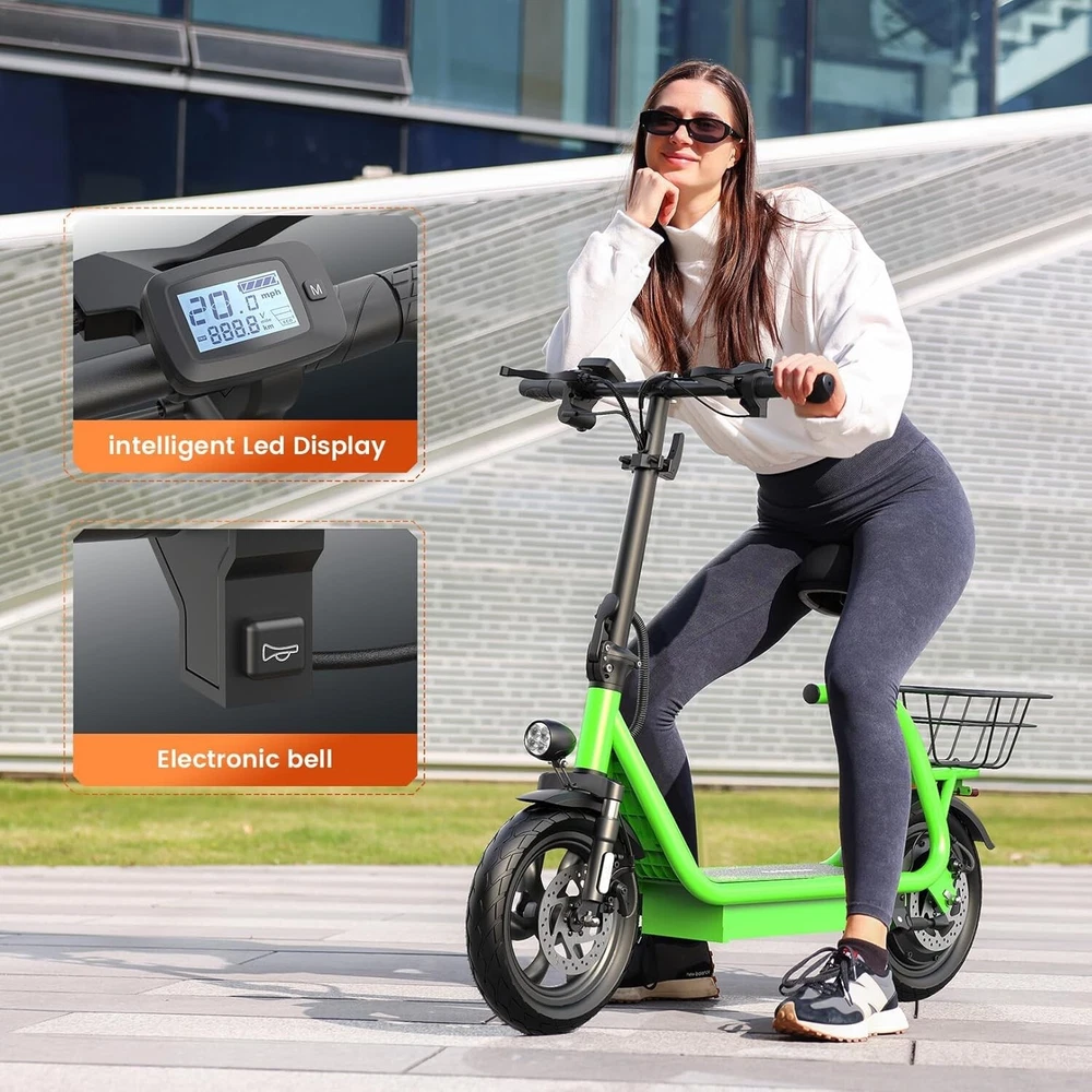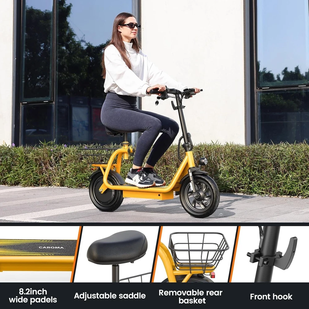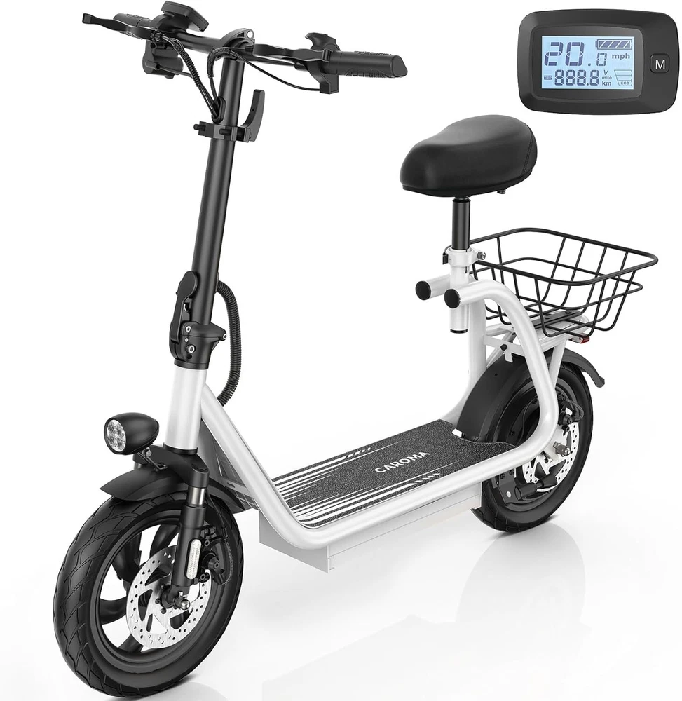 Product Description About this item 【48V Battery and Peak 1200W Powerful Motor】The electric scooter for adults is equipped with a 48V/10.4Ah battery, which can last for a long time without frequent charging, with a maximum range of up to 30 miles and a maximum speed of 20mph, and it only takes 7 hours to fully charge. The motor has a peak power of up to 1200W and can easily climb a 30-degree slope, making it very suitable for short-distance commuting 【LED Display and 3 Speed Modes】The electric scooter adults is equipped with an LED high-definition display, which can clearly display: speed mode, battery power, current speed, and mileage during the day and at night. The caroma scooter uses a half-turn handlebar design, getting rid of the traditional full-grip speed control mode to ensure riding safety; the scooter has 3 different speeds for you to choose, giving you a better riding experience 【Excellent shock-proof suspension and brake system】This electric scooter with seat for adults has an excellent shock absorption system composed of headlights and taillights, electronic horns, front forks and sensitive double disc brakes, which can brake quickly, safely and stably; durable one-piece wheels and thick steel frame can withstand high-intensity pressure, with a maximum load-bearing weight of 265 pounds, suitable for heights of 3'11"-5'11" 【 Foldable Electric Scooter with Seat】Caroma electric scooter is equipped with an 8.27-inch wide deck, a soft seat that can be adjusted according to different heights, and a storage basket on the back seat; the front of the vehicle is compact and foldable, making it easy to store in a car trunk or other small space 【Caroma Electric Scooter After-Sales Support】Caroma electric scooter with Seat is UL 2272 certified. This detachable electric scooter is 90% assembled and comes with instructions and installation tools, making installation very easy. If you encounter any problems, such as motor failure, charging problems, or missing accessories, please contact us in time