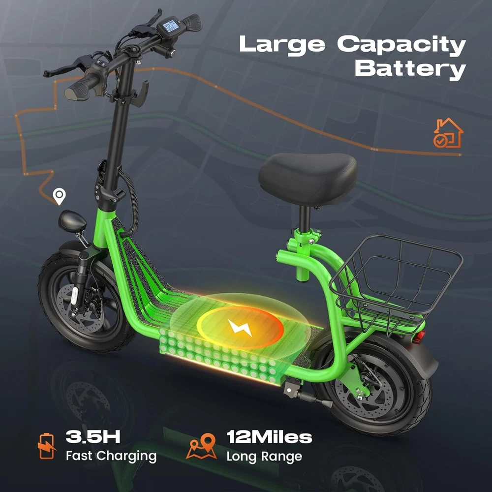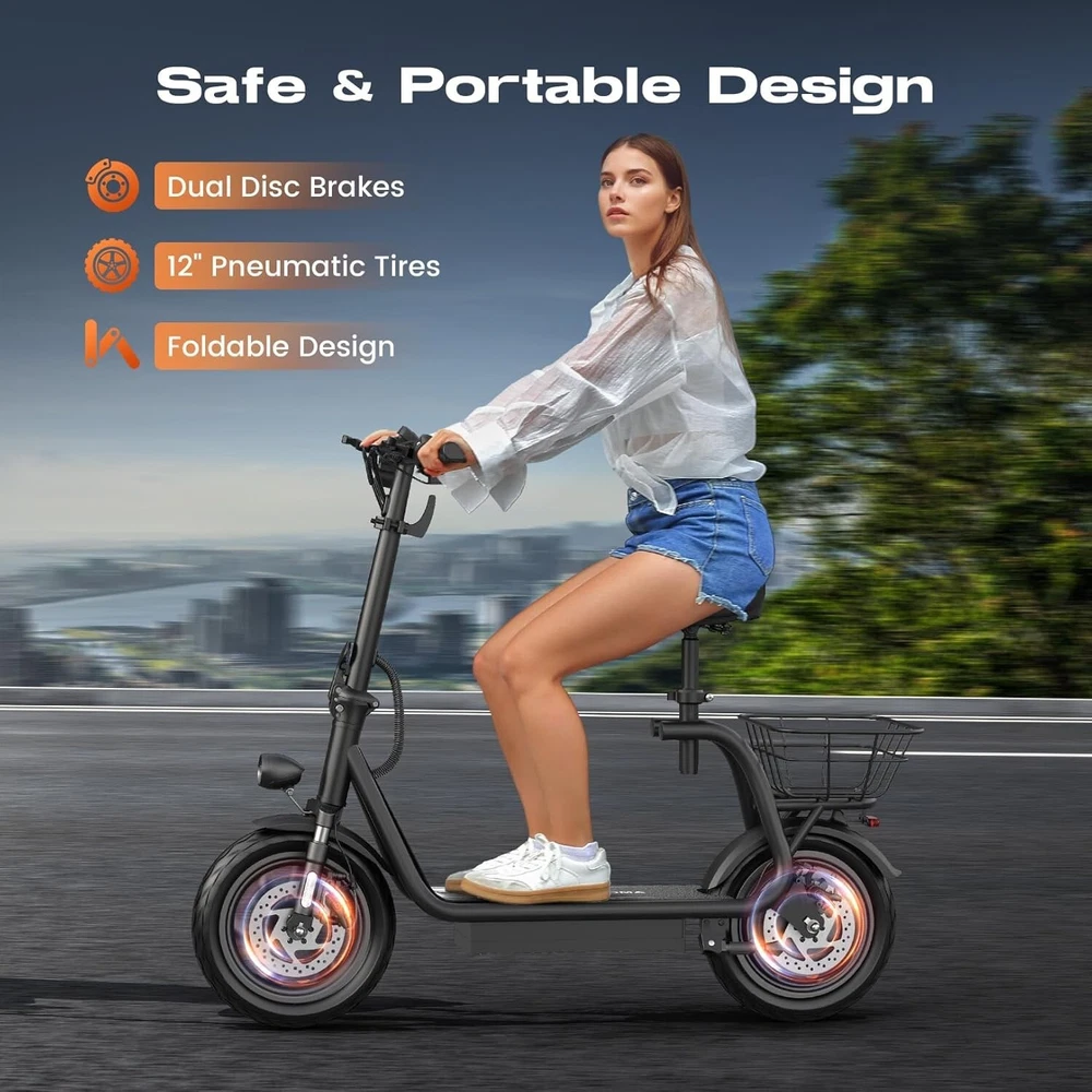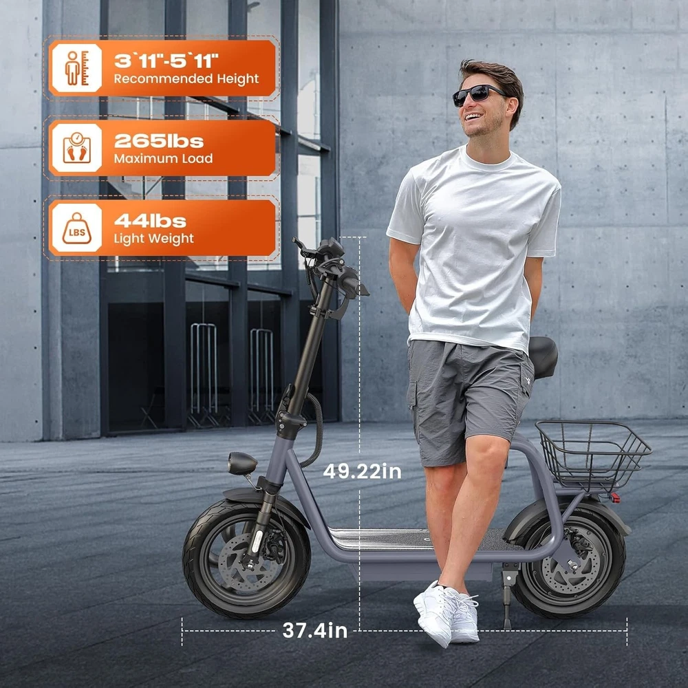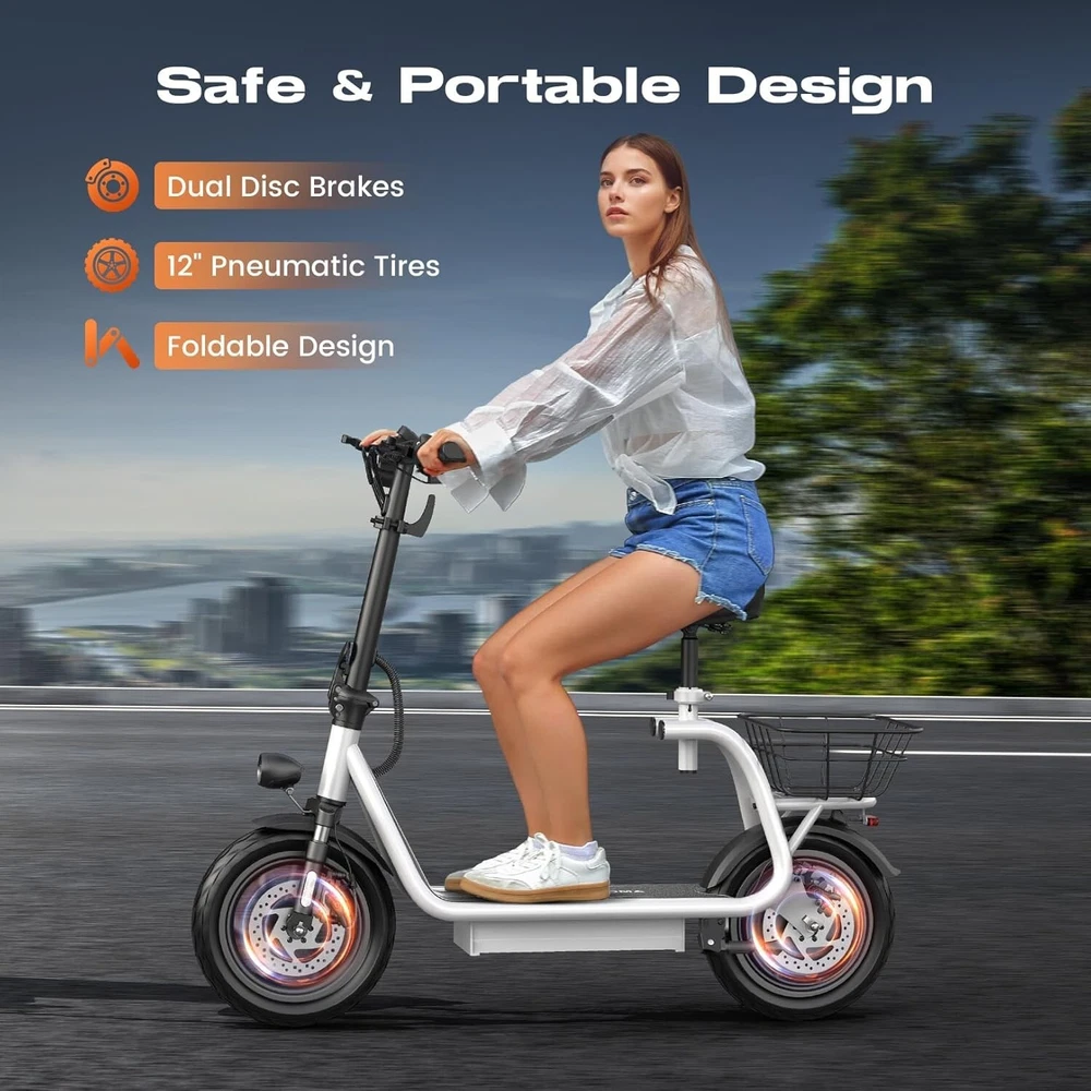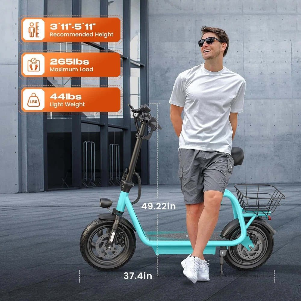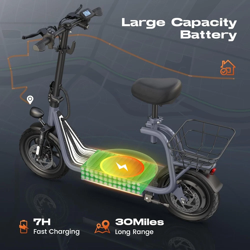 Product Description About this item 【48V Battery and Peak 1200W Powerful Motor】The electric scooter for adults is equipped with a 48V/10.4Ah battery, which can last for a long time without frequent charging, with a maximum range of up to 30 miles and a maximum speed of 20mph, and it only takes 7 hours to fully charge. The motor has a peak power of up to 1200W and can easily climb a 30-degree slope, making it very suitable for short-distance commuting 【LED Display and 3 Speed Modes】The electric scooter adults is equipped with an LED high-definition display, which can clearly display: speed mode, battery power, current speed, and mileage during the day and at night. The caroma scooter uses a half-turn handlebar design, getting rid of the traditional full-grip speed control mode to ensure riding safety; the scooter has 3 different speeds for you to choose, giving you a better riding experience 【Excellent shock-proof suspension and brake system】This electric scooter with seat for adults has an excellent shock absorption system composed of headlights and taillights, electronic horns, front forks and sensitive double disc brakes, which can brake quickly, safely and stably; durable one-piece wheels and thick steel frame can withstand high-intensity pressure, with a maximum load-bearing weight of 265 pounds, suitable for heights of 3'11"-5'11" 【 Foldable Electric Scooter with Seat】Caroma electric scooter is equipped with an 8.27-inch wide deck, a soft seat that can be adjusted according to different heights, and a storage basket on the back seat; the front of the vehicle is compact and foldable, making it easy to store in a car trunk or other small space 【Caroma Electric Scooter After-Sales Support】Caroma electric scooter with Seat is UL 2272 certified. This detachable electric scooter is 90% assembled and comes with instructions and installation tools, making installation very easy. If you encounter any problems, such as motor failure, charging problems, or missing accessories, please contact us in time