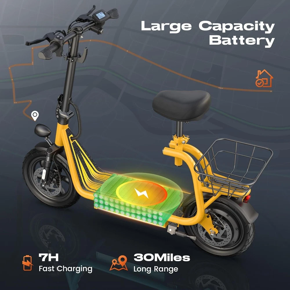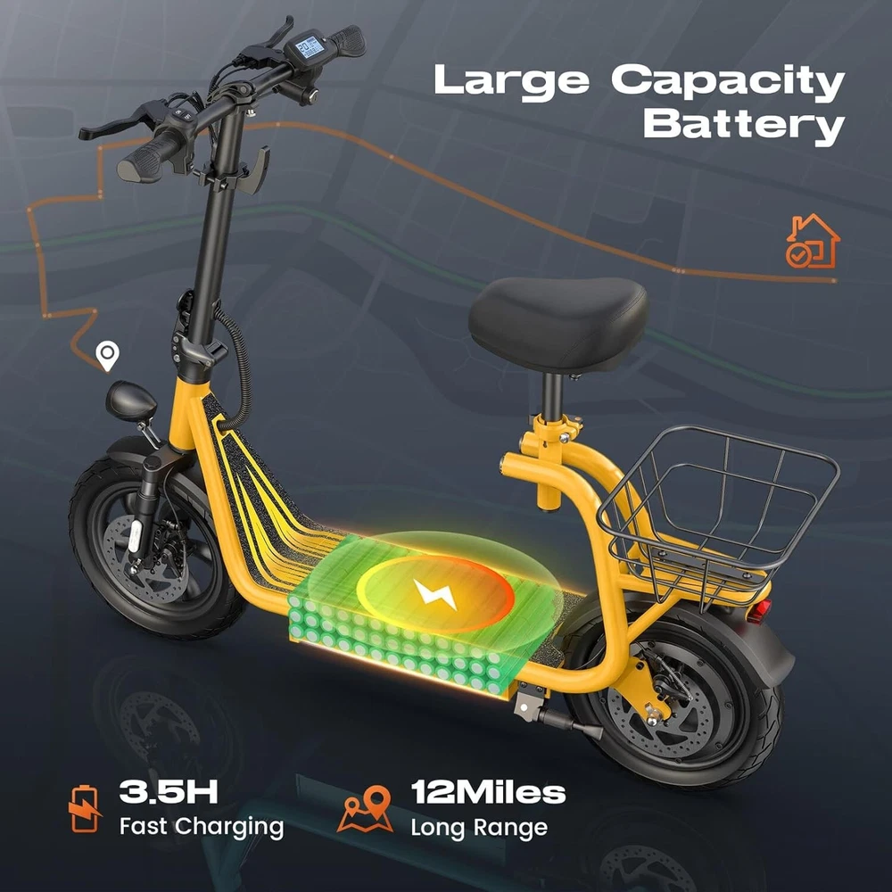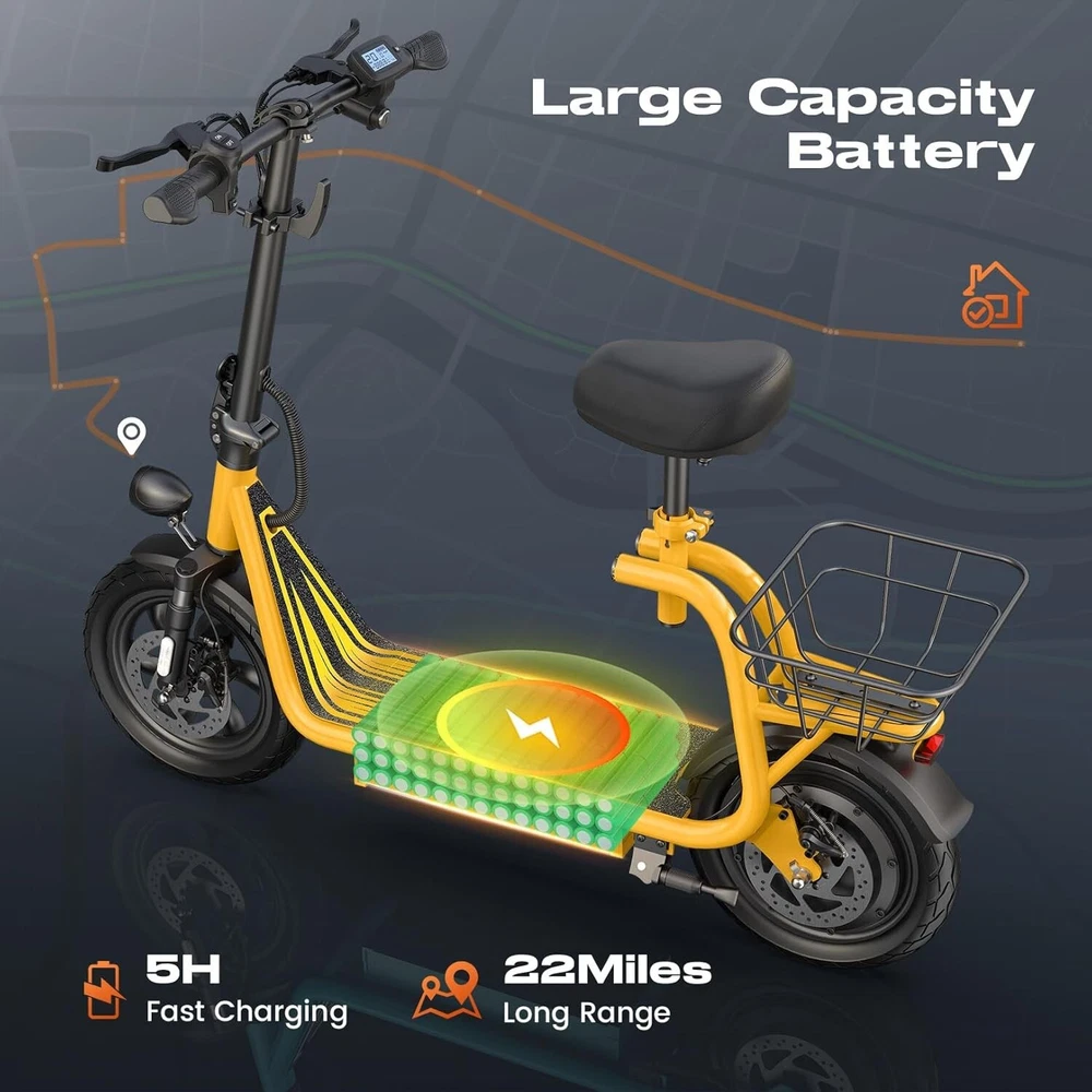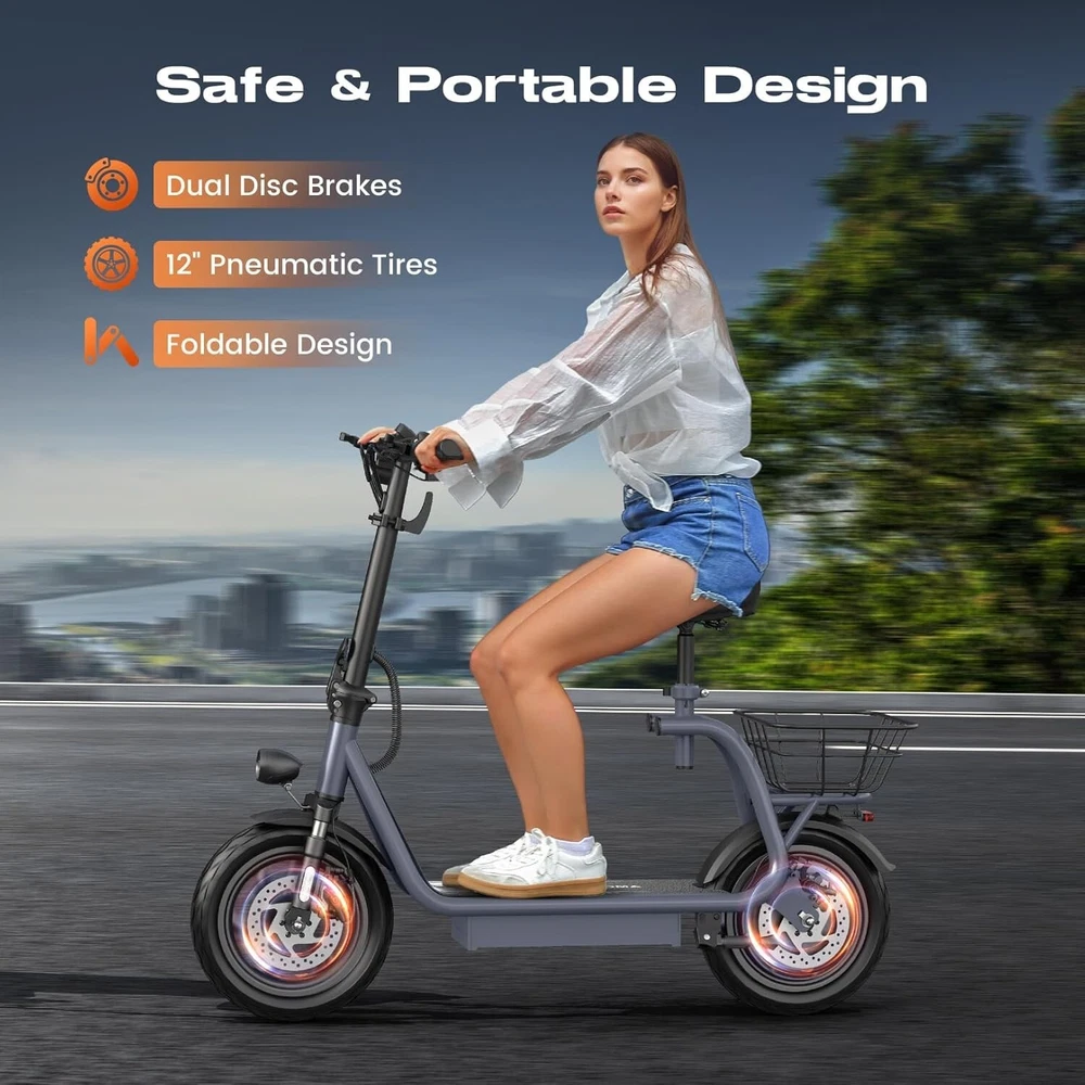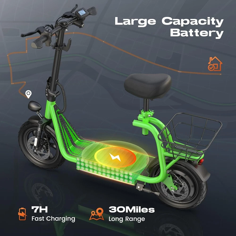 Product Description About this item 【48V Battery and Peak 1200W Powerful Motor】The electric scooter for adults is equipped with a 48V/10.4Ah battery, which can last for a long time without frequent charging, with a maximum range of up to 30 miles and a maximum speed of 20mph, and it only takes 7 hours to fully charge. The motor has a peak power of up to 1200W and can easily climb a 30-degree slope, making it very suitable for short-distance commuting 【LED Display and 3 Speed Modes】The electric scooter adults is equipped with an LED high-definition display, which can clearly display: speed mode, battery power, current speed, and mileage during the day and at night. The caroma scooter uses a half-turn handlebar design, getting rid of the traditional full-grip speed control mode to ensure riding safety; the scooter has 3 different speeds for you to choose, giving you a better riding experience 【Excellent shock-proof suspension and brake system】This electric scooter with seat for adults has an excellent shock absorption system composed of headlights and taillights, electronic horns, front forks and sensitive double disc brakes, which can brake quickly, safely and stably; durable one-piece wheels and thick steel frame can withstand high-intensity pressure, with a maximum load-bearing weight of 265 pounds, suitable for heights of 3'11"-5'11" 【 Foldable Electric Scooter with Seat】Caroma electric scooter is equipped with an 8.27-inch wide deck, a soft seat that can be adjusted according to different heights, and a storage basket on the back seat; the front of the vehicle is compact and foldable, making it easy to store in a car trunk or other small space 【Caroma Electric Scooter After-Sales Support】Caroma electric scooter with Seat is UL 2272 certified. This detachable electric scooter is 90% assembled and comes with instructions and installation tools, making installation very easy. If you encounter any problems, such as motor failure, charging problems, or missing accessories, please contact us in time