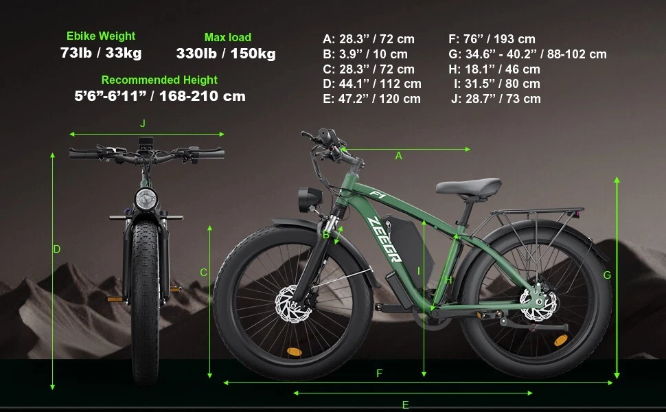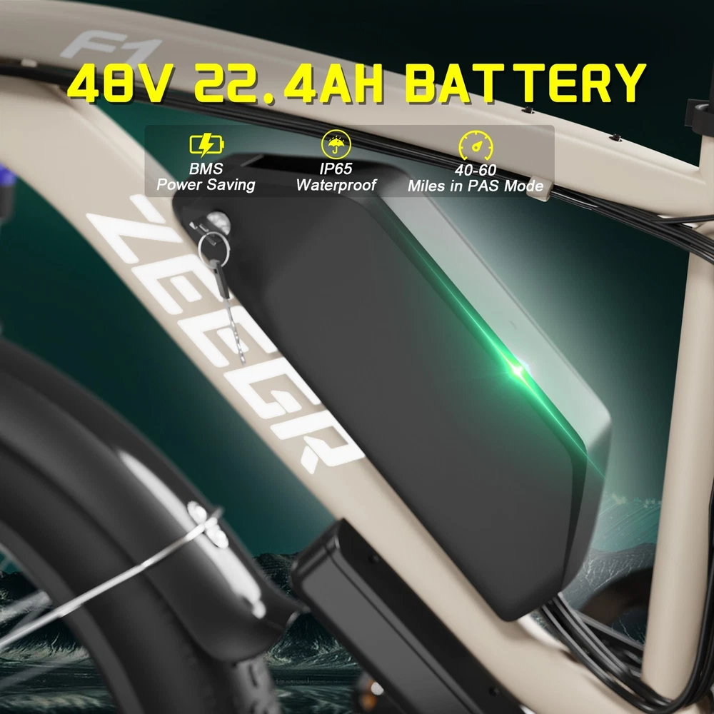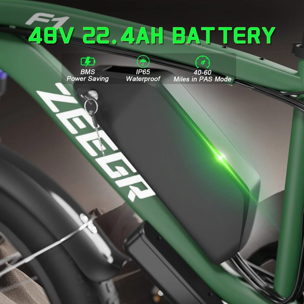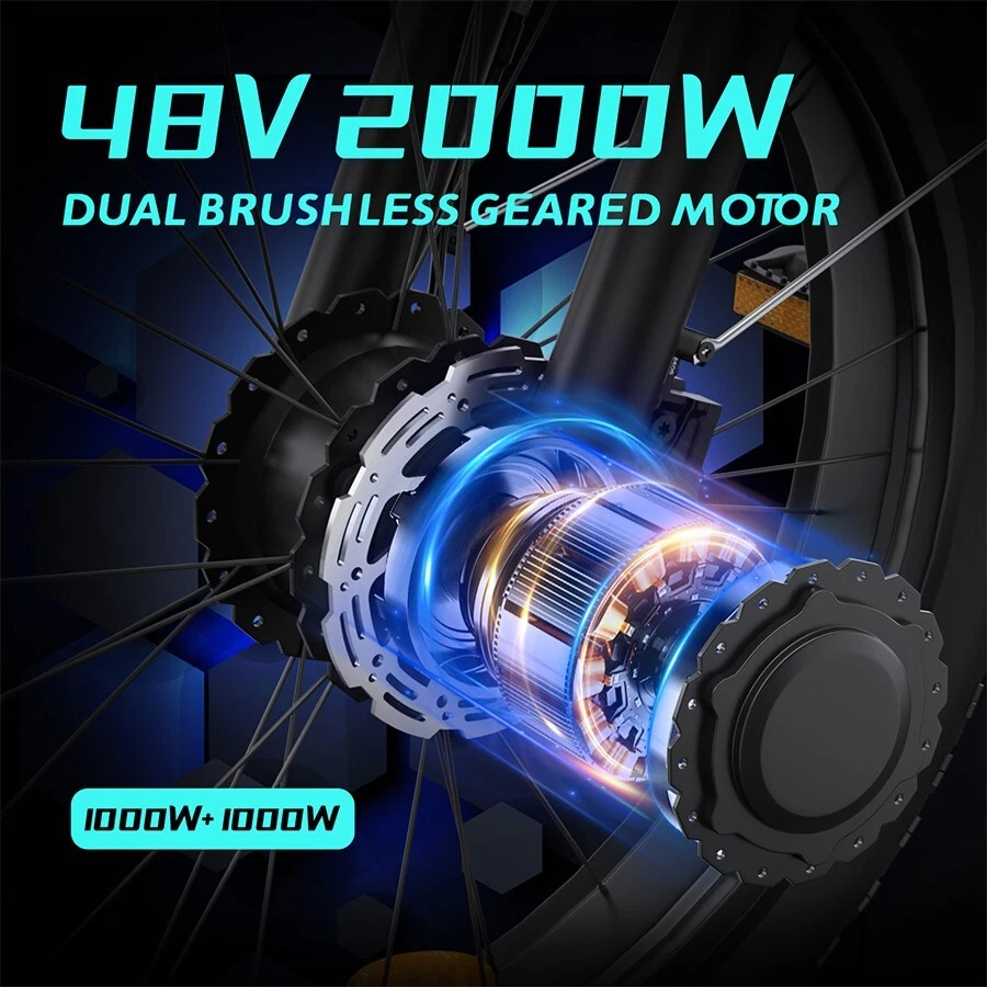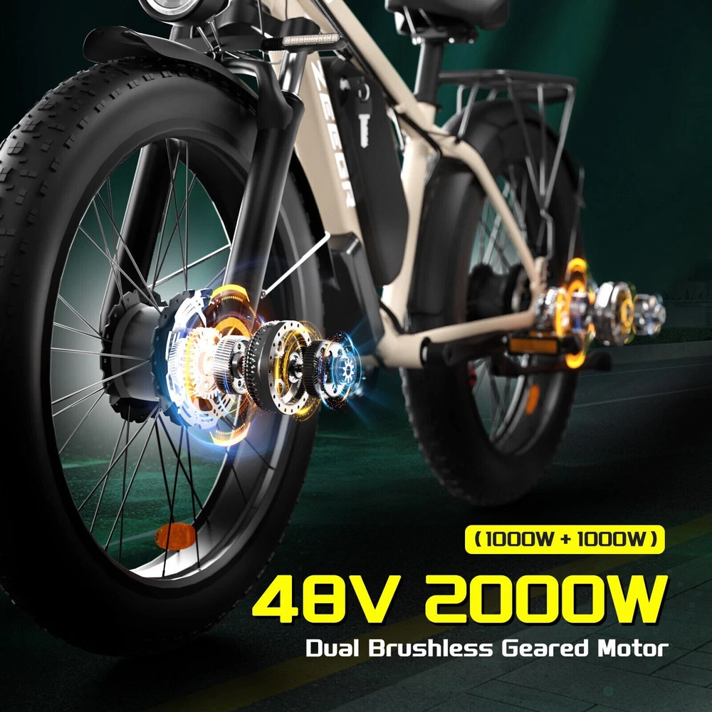 Why choose this 2000W fat tire electric bike F1/B1? 【Powerful 2000W 35MPH Motor】 Zeggr electric bike is equipped with a 2000W (3000W Peak) power motor, which allows the e bike to reach 2000W 35MPH top speed and conquer 35° slope effortlessly with 80 Nm torque. It can give you pleasant riding experience. Our e-bike is with 26x4.0"" fat tires perfect for snow roads. Road, grass, snow, sand or mountain, all terrains. 【48V 22.4AH 1075.2W BMS Lithium Battery】 Zeggr electric bike is equipped with a large capacity 2000W 48V 22.4AH battery, allowing you to enjoy the fun of riding without worrying about running out of power.With throttle mode, it covers up to 18-20Miles. Utilizing pedal assist, the range extends to an impressive 40-60Miles.The removable battery with a key lock makes charging more convenient whether you are at home or in the office. (Calculation based on rider's weight of 75kg. Range varies according to road condition, weather, rider's weight etc.) 【5 Working Modes】 Dual Motors with 5 Riding Modes: dual motors electric, single motor electric, pedal assist, cruise, and normal bike mode. With 5 levels of assist, the bike can reach speeds up to 35 mph, depending on battery charge, load, and road conditions. Choose from speeds of 12, 18, 24, 29, or 35 mph. this electric mountain bike can meet your daily commuting needs and outdoor needs, whether you are exploring new trails outdoors, exercising or rushing to work. When reach the desired speed, keep this speed and long press the minus button (about 4 seconds) to enter the cruise mode. And just press the brake handle to exit cruise mode. 【Dual Hydraulic Disc Brakes & Shimano 7 Speed】 Front and Rear hydraulic disc brakes have the strongest braking capacity and responsive braking system, dual hydraulic disc brakes provide you with a safer driving experience.The Shimano 7-speed gear system electric bike offers smooth and precise shifting, allowing you to optimize your pedaling effort and conquer various terrains with ease. 【26" x 4" Fat All Terrain Fat Tire & Front Suspension Fork】 Our electric mountain bike for adults wit bigger tires and added padding, puncture-resistant 26""X4.0 fat tires provide good grip and excellent shock absorption for greater durability, allows you to ride smoothly in snow, beaches, rugged mountain roads and cities, etc.Enjoy a smoother ride with the front suspension fork, which absorbs shock and vibrations from uneven terrain. 【New Upgraded Lights for Night Riding】 The color LCD display keeps track of real-time speed, battery level, pedal assist level and mileage. This electric bicycle comes with an upgraded bright headlight & & Turn Signal lights & rear brake light WITH braking and Turn signals, designed to maximize riding safety at night! 【UL & Assembled 】 Our e-bikes are factory safety tested and UL tested, every e-bike is inspected by our quality inspector before leaving the factory. 85% are pr-assembled, all you need to do is to install the handlebar, seat, and other parts to the frame.Please refer to the installation videos on our product page. Any questions just contact us and we will respond within 24 hours. Specification Motor Dual motors,brushless front 1000W & rear 1000W motors Battery 48V 22.4AH lithium-ion battery Display Multifunctional color LCD Display Frame 6061 aluminum alloy Transmission Shimano 7 speed Fork Suspension fork Brake Hydraulic disc brakes Charger 54.6V 3A US Standard Throttle Twist throttle Light Front light & rear brake light & turn signals Tire 26" * 4.0" fat tires 4 Working Modes Pure electric, pedal-assist (5 levels), cuise mode, normal bike mode Max Load 330lb (150kg) Range (PAS mode) 40-60 miles (65-95km) Max Speed 35MPH (56KM/H) Charging Time 5-8 hours Bike Size 76.0"*28.7"*44.1" (193*73*112CM) Package Size 58.3"*11.4"*30.3" (148*29*77CM) Bike Weight 73 lbs (33 kg) Package Weight 93 lbs (42 kg) The item is UL 2849 certified with a link to the UL Product iQ < https://productiq.ulprospector.com/en >