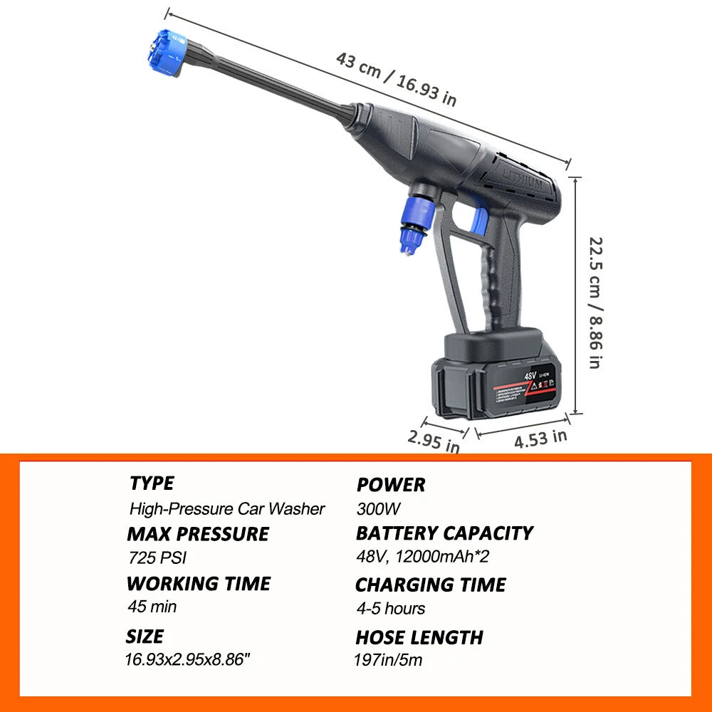 Store Categories Store Categories US Clothing US Shaper Tops US Shaper Belt US Shaper Pants/Leggings US Full Body Shaper US Health & Beauty US Posture Corrector US Compression Socks US Thigh Support Brace US Home & Garden US Swimming Pool Cleaning Tool US Garage Door Remote US Insect Killer Lamp US Electric Lunch Box US Stick Vacuum US Solar Charge Controller US Solar Panel US Essential Oil Diffuser US Gas Stove Range Knobs US String Trimmer Head US Grill Cover US High Pressure Washer US Selfie SticK US Reading Glasses US Studio Light Box US Business & Industrial US Metal Detector US Pool & Spa Salt Chlorinator Pool Brush & Net with Pole Floating Chlorine Dispenser Pool Vacuum Pool Fountains Pool Equipment Parts Pool Pump US Sauna Heater Steam Generator Ebay Motors LED Golf Cart Light Kit US Golf Cart Cover Other High Pressure 725PSI Power Car Washer Gun Wand Lance Spray Nozzle and Hose Kit Product Description Featu r e s: 【Cordless Pressure Was her】 The Cordless pressure washer has a cordless and lightweight design that makes it easy to carry and work anywhere. Equipped with a powerful motor, it has a click speed of 20000rpm, a flow rate of 360L/H. Strong power and convenient cleaning. 【High efficiency and durability】 12000mAh battery provides stable power for the normal operation of the car washing machine, and the battery has a long service life. Fast charger with Long battery life. Batteries are suitable for most power tools of the same model. 【W idely Application】 Portable Pressure washer can not only be used to clean all kinds of cars, bicycles, motorcycles, etc., but also can clean balconies, Windows, exterior walls, floors, fences, house walls, furniture and so on. 【Multifunctional Nozzles】 6 Water types adjustable, you can change and adjust different water discharge modes simply by rotating the nozzles.and use with foam buckets to meet your various cleaning tasks. Descrip tio n: Material : ABS, Copper Power Supply: 48 V, Lithium battery Chargin g Plug: US Battery Capacity: 2x 12000mAh Power: 300W Maximum Pressure: 50 BAR Maximum Flow Rate: 360 L/H Spraying Range: 8 meters Water Ho se Length: 5m/16.4ft Water Sour ce: Bucket / Faucet Self-priming Motor: Pure copper induction motor Scope of app lication: Car wa shing, watering flowers, watering vegetables, spraying, garden cleaning, etc. Packaging Inclu de s: 1 x Washer Gun 2 x 12000mAh Lithium Battery 1 x Charger (US) 1 x Water Hose (16.4ft) 1 x 6-in-1 Nozzle 1 x Quick Connector 1 x Lance 1 x Filter 1 x Foam Pot 1 x Manual Attentio n : 1. Due to manual measurement, please allow an error of 1-3 centimeters. Please ensure that you do not mind before bidding. 2. Due to different monitors, the colors may vary. Please understand. 3. Don't point at humans. 4. Do not disassemble, open, or cut the battery pack. 5. Do not short-circuit the battery pack. Do not casually place the battery in a box or drawer to avoid short circuits between the battery and other metal objects. 6. Do not expose the battery to high temperatures or open flames. Avoid storing in direct sunlight. 7. Do not remove the battery from its original packaging before use. 8. Do not use mechanical impact on the battery. Payment Policy Shipping Policy Feedback Payment Policy 1 . We accept Credit or debit card, Apple Pay, Google Pay, and PayPal. 2 . Payment should be completed within 2 (Two) days of auction closing. Or unpaid dispute will be filed for closing auction. 3 . Sales Tax of 9% will be applied for orders shipped within the state of California 4 . We will leave a positive feedback immediately after payment is received. We appreciate a positive feedback as much as you do. If for some reason there is any issue with the purchase, please contact us prior to leaving feedback, and we will be glad to work with you to have it resolved. Shipping Policy 1 . We Ship to United States ONLY. 2 . Ship from two warehouses and only to eBay ADDRESS. Package handling only takes 1 business day at our warehouse, so please make sure entering correct payment and shipping information before checking out. Once your payment is completed, pls leave ebay note if the changes are needed before we send the product. 3 . Truck company: 3-8 business days. | USPS: 2-6 business days. | UPS/FEDEX: 3-5 business days. 4 . Local pick up is available. Feedback 1 . Any problem after receiving our goods, please contact us before leaving Neutral/Negative feedback. We promise to help you solve it asap, and make you feel satisfied absolutely. 2 . Please DO NOT leave negative feedback without asking for help. Please do not leave negative or neutral feedback if you haven't received item in 30 days, because we have mentioned the shipping time repeatedly. Copyright © 2021 Dianxiaomi
