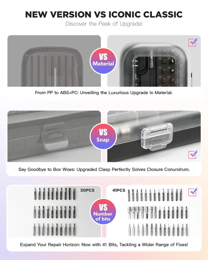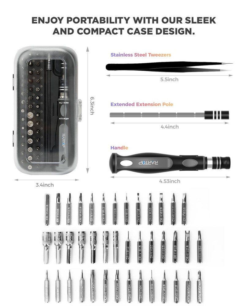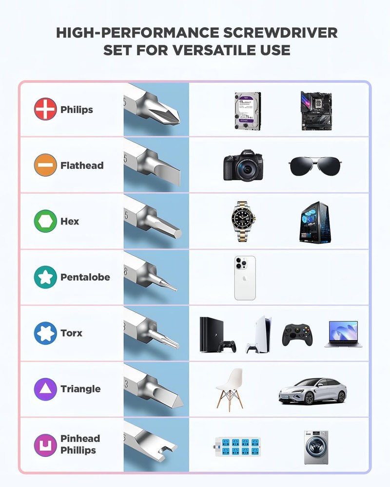 Screwdriver Set – Precision Screwdriver Bit Sets 130 in 1, Mini Hex Phillips Torx Slotted Screwdriver Bit Set with Tool Box, Ideal for Electronics, Laptop, iPhone, Jewelers and More 【Versatile Repair Tool】 precision screwdriver set is an essential toolkit for electronics repair enthusiasts. With 41 screwdriver bits and a comprehensive selection of screwdriver types and sizes, including Phillips, Flat Head, Pentalobe, SAE/Metric Hex, Star, Triwing, Triangle, Torx screwdriver set and more, and precision bits, it's perfect for repairing various electronic devices such as computers, laptops, iPhones, MacBooks, PCs, game consoles, eyeglasses, and more. 【Premium Quality Construction】This mini screwdriver set includes bits crafted from high-quality CRV steel, ensuring durability and resistance to wear and tear. This guarantees longevity and reliability of the screwdriver bit set.The magnetic design of the screwdriver tips facilitates easy handling and manipulation of small screws, while the ergonomic handle provides a comfortable and secure grip during use. 【Convenient and Portable】This precision screwdriver set comes with a sturdy and compact case, making it easy to store, organize, and transport. Each screwdriver bit is securely stored in its designated slot, preventing loss or misplacement. The clip latch close firmly, adding security to the precision screwdriver kit for you. The portable design ensures convenient usage for on-the-go repairs, and its compact size also makes it a pocket screwdriver set. 【Wide Application】 Whether you're a professional technician or a DIY enthusiast, this screwdriver set is suitable for a wide range of repair tasks. From replacing components in electronic devices to assembling furniture and appliances, it's versatile enough to handle various repair and maintenance projects with ease. 【Lifetime Warranty】guarantees the quality of our premium screwdriver sets and electronic toolkits with a lifetime warranty and a 30-day money-back guarantee. Contact our customer service for any assistance or refund requests. Shop confidently with us.