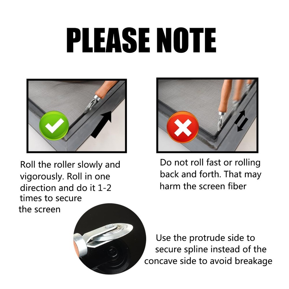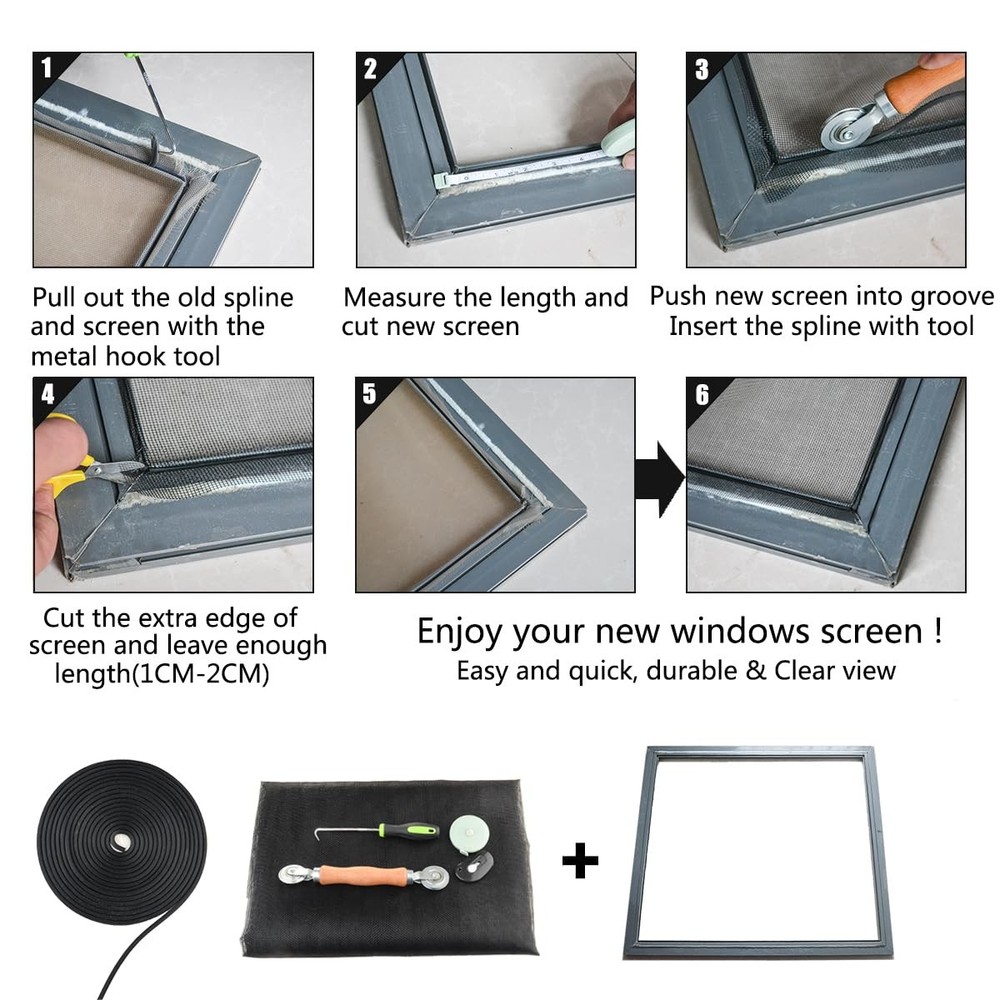 Package include:Window screen, rolling screen tool, screen retainer spline, knife, spline remover hook All your need in one kit: Upgrade your window screens with this screen replace kit, which includes window screen, rolling screen tool, screen retainer spline, knife, spline remover hook, and a tape measure. Keep your home insect-free and enjoy fresh air without any hassle. Perfect for easy DIY window screen replacement. The Size of Premium Quality Fiberglass Mesh Screen is 48" x 118" ,and the diameter of screen retainer spline is 0.157". With the knife comes with the kit you can cut the screen to the size and shape you need Wide applications: The repair kit is perfect for various screening applications such as :window screen repair, screen door, porch screen, patio screening, pet screen,sliding door screen and courtyards. Removes the old screen and broken mesh that scratched by pats and enjoy your new one with good ventilation and visibility, which also provides some daytime privacy Please feel free to contact us if you have any problems during installation. We can provide professional advice.If there is any quality problem when you receive the product, we will give you a satisfactory solution