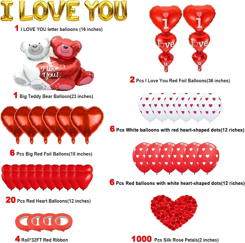 The product is a set of 49 Valentine's Day balloons and a teddy bear, featuring a romantic theme perfect for decorating for the occasion. The balloons are made of aluminum, latex, and polyester in a red color, measuring 8.9 x 7.68 x 2.2 inches. The set also includes a teddy bear character, adding an adorable touch to the decorations. This item is lightweight at 8.4 ounces, making it easy to set up and display in your home for a romantic Valentine's Day celebration. Romantic Decorations for Special Night - Do you want to organize a surprise party on Valentines Day to show your love to her/him? Light up the event with this I love you balloons and heart balloons set! Create a romantic moment for your lover enjoy a sweet anniversary! Valentines Day Balloons Set - Include I LOVE YOU Letter Foil Balloons, 1PCS 23’’ Big Teddy Bear Balloon, 6PCS 18’’ Red Foil Heart Balloons, 2PCS 36’’ I Love U Foil Balloons, 20PCS 10’’ Red Heart Balloons, 6PCS 12’’ Red Balloons, 6PCS 12’’ White Balloons, 4 Rolls Red Ribbons and 1000PCS Silk Rose Petals. Meet your romantic decor needs and start a deluxe Valentine's Day party. 1000 PCS Silk Rose Petals - Made of high quality polyester silk material. Petal measure is 2'', Durable and not fade. Realistic Rose Petals is important supplement to your Valentine's Day, anniversary, wedding, and romantic special night, enhancing the romantic atmosphere even more. High Quality Balloons - These Valentines Day balloons are made of reliable aluminum film or latex material that will not leak easily. All balloons support helium gas filling. Red ribbon is used to tie the balloons, Heart-shaped balloons float on the ceiling to create an unforgettable romantic special night for you. I Love You Balloons and Heart Balloon Set perfect for Valentines Day, romantic special night, wedding, anniversary or proposal decoration. With heart balloon and petals to realize your planned romantic party space to surprise her/him.