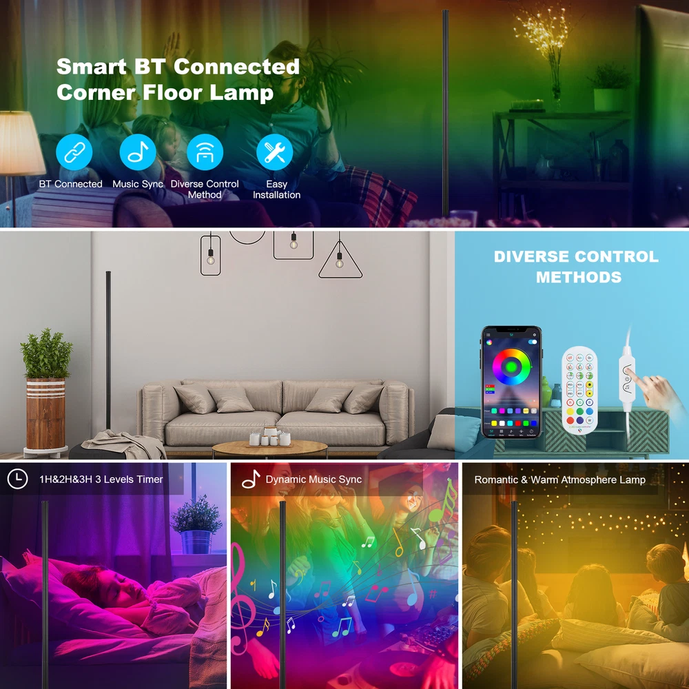 49" RGB Corner Floor Lamp Color Changing Music Sync with Remote APP Control J4S5