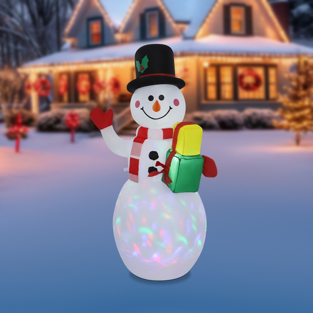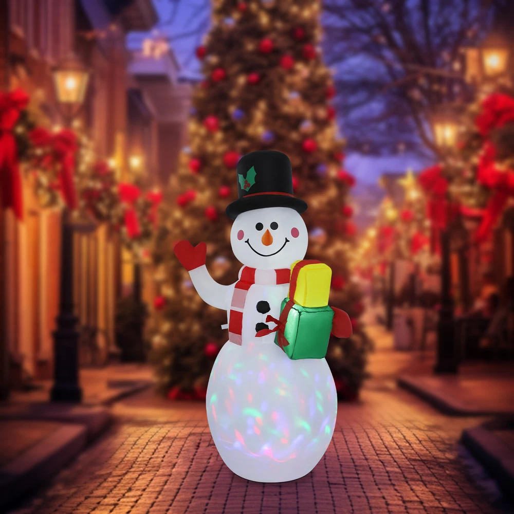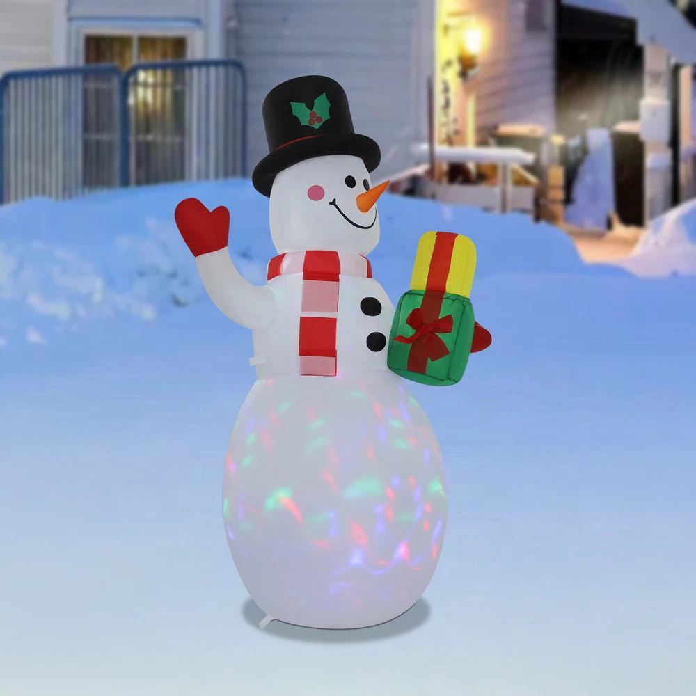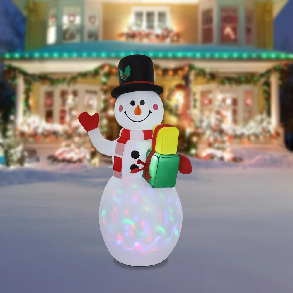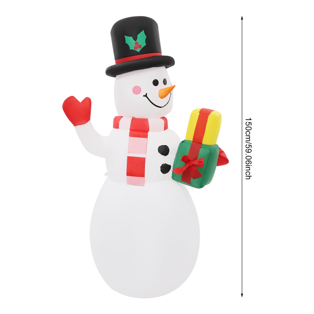 1.5m Christmas Inflatable Snowman Family w/LED Light Blowup Lawn Yard Decoration Description Are you looking for a way to add a touch of charm to your event or space? Look no further than this inflatable snowman with illuminating lights! With its cute snowman appearance, it's ideal for creating a n attractive and joyful atmosphere in any setting. Whether you're sprucing up your home for the holidays, planning a fun-filled party, or adding some festive cheer to your business, this snowman fits the bill. Key Features High-class Materials: The snowman is made of tear-resistant 210T polyester fabric with a screen printing process, the blower and ground stakes are made of impact-resistant ABS, and the pull rope is made of nylon, all the premium materials ensure the product a long service life. Cute Appearance: Its shape is a snowman, who holds the gift box, wears a hat and a beautiful scarf, and has a sweet, warm smile just as he welcomes guests. It can instantly add a festive and joyful atmosphere, making it an excellent decoration for various occasions. It not only attracts the attention of both children and adults but also helps to enhance the overall aesthetic appeal of the place where it is placed. Low-Noise Operation: Made of ABS, the blower features high speed and low noise and provides efficient air without disturbing the surrounding area , creating a quiet and peaceful environment for you and your family. Charming Illumination: The product is equipped with two white LED lights and one RGB rotating colored light, which brings a dynamic and captivating visual effect. This unique element adds an extra layer of charm, making it not only a static decoration but a lively and engaging centerpiece. Safe to Use: Both the LED lights and r otating colored light are 12V, which reduces the risk of electric shock, making it suitable for various settings and ensuring a secure and enjoyable experience for everyone. Convenient to Use: With a premium built-in blower, it only takes about two minutes to inflate the snowman, which is time-saving and effort-saving. Ideal Gift: With its cute and childlike appearance, it can be given as a great Christmas or birthday gift for your children. Buy with Confidence: We stand behind all our guests and look forward to assisting you with your purchase. It is our pleasure to answer your confusion and questions. Details Dipping Painting Transformer: The process increases insulation performance and strength, thus ensuring stable operation and extended lifespan of the transformer. Ground Stakes: They can easily be inserted into the ground and firmly anchor the snowman, preventing it from being swept away by the wind and ensuring stability. Wind-resistant Nylon Pull Ropes: They attach securely to the snowman and fixed points, which can withstand strong winds and safeguard the product. Application It is suitable for gardens, lawns, patios, children's rooms, party venues, shopping malls, front doors, yards, lawns, Christmas event decorations, New Year celebrations, family gatherings, and community events. Specification Material: 210T Polyester Fabric, ABS, Nylon Process: Screen Printing, Dipping Painting Style: Modern Mounting Type: Floor Standing Interior Lighting: 2* LED Lights(12V), 1* Rotating Colored Light (12V) LED Light Color: White Rotating Colored Light : RGB Plug Type: US Standard Input: 100-240V~50/60Hz 0.7A Output: 12V-1250mA 15W Power Cable Length: 2m/ 6.56ft Inflation Time: About 2min Package Size: 25*24*7cm/ 9.84*9.45*2.76 in Product Height: 1.5m/ 4.92ft Gross Weight: 0.8kg/ 1.76 lbs Net Weight: 0.45kg/ 0.99 lbs Package Included 1* Inflatable Snowman 4* Ground Stakes 2* Pull Ropes 1* English Manual Notes Please check the product size carefully before purchasing. Please pay attention to waterproofing when using . Please note that this product needs to be plugged in continuously to keep the fan blowing. Please allow the slight color difference caused by the shooting light and the 1-3 cm error due to manual measurement, and make sure you do not mind before ordering.