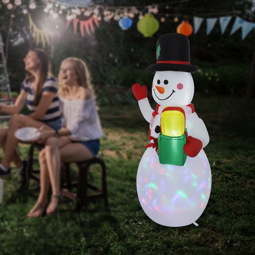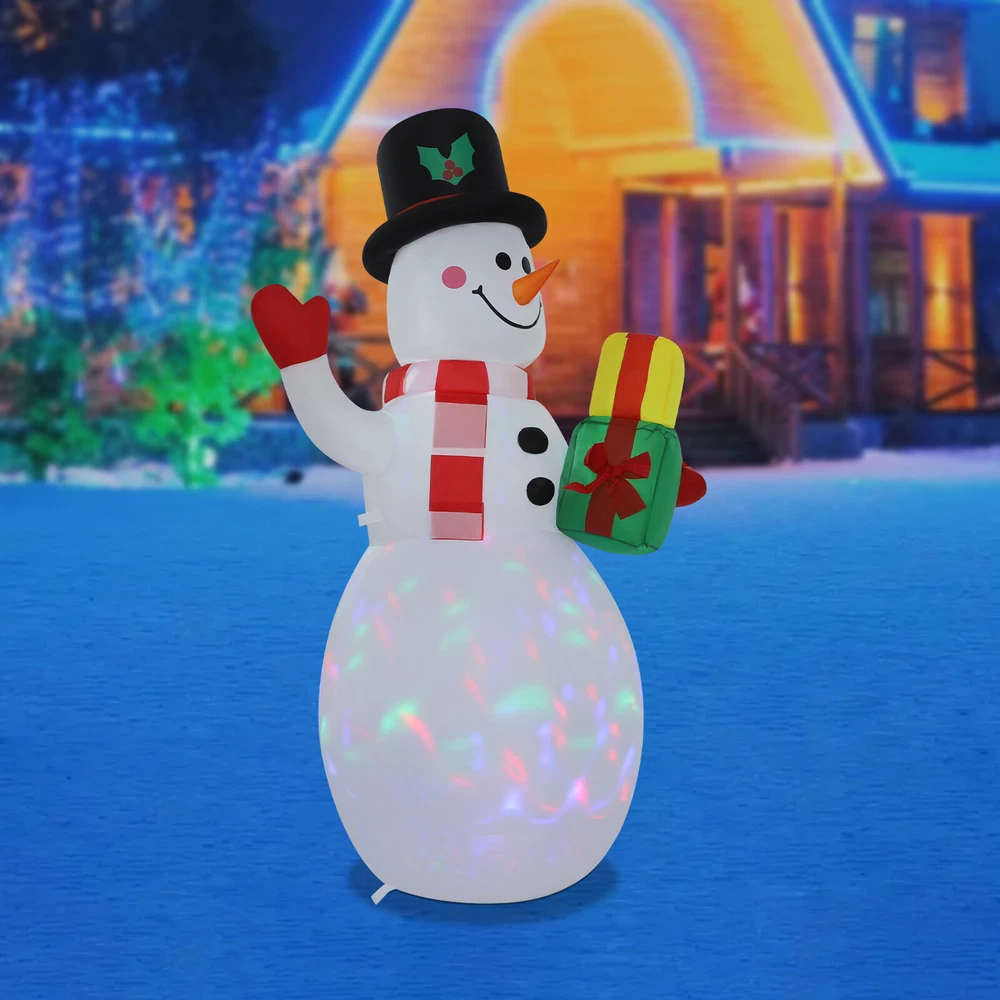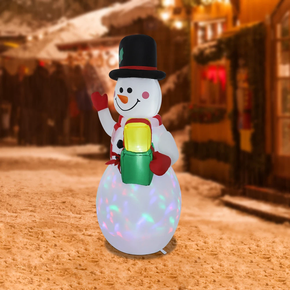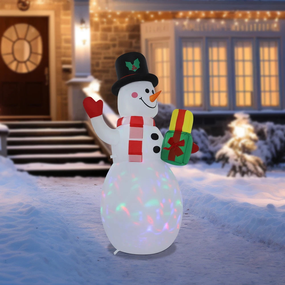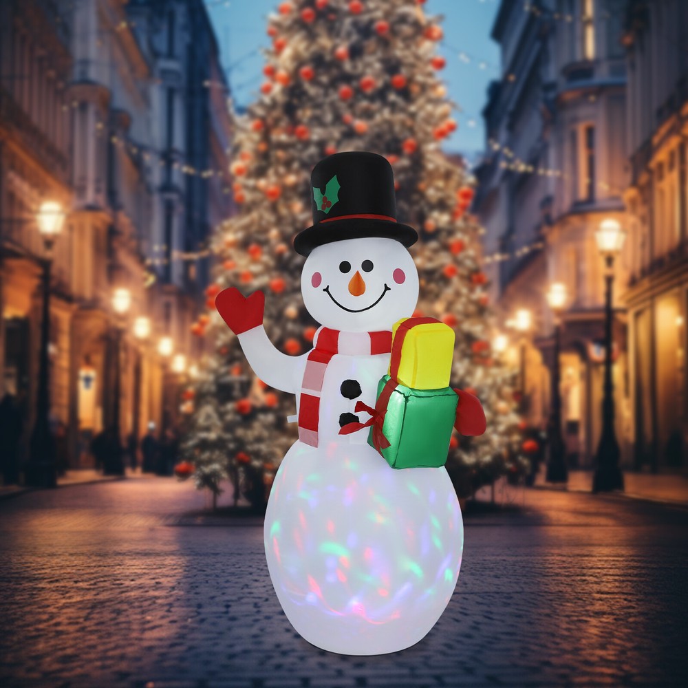1.5m Christmas Inflatable Snowman Family w/LED Light Blowup Lawn Yard Decoration Description Are you looking for a way to add a touch of charm to your event or space? Look no further than this inflatable snowman with illuminating lights! With its cute snowman appearance, it's ideal for creating a n attractive and joyful atmosphere in any setting. Whether you're sprucing up your home for the holidays, planning a fun-filled party, or adding some festive cheer to your business, this snowman fits the bill. Key Features High-class Materials: The snowman is made of tear-resistant 210T polyester fabric with a screen printing process, the blower and ground stakes are made of impact-resistant ABS, and the pull rope is made of nylon, all the premium materials ensure the product a long service life. Cute Appearance: Its shape is a snowman, who holds the gift box, wears a hat and a beautiful scarf, and has a sweet, warm smile just as he welcomes guests. It can instantly add a festive and joyful atmosphere, making it an excellent decoration for various occasions. It not only attracts the attention of both children and adults but also helps to enhance the overall aesthetic appeal of the place where it is placed. Low-Noise Operation: Made of ABS, the blower features high speed and low noise and provides efficient air without disturbing the surrounding area , creating a quiet and peaceful environment for you and your family. Charming Illumination: The product is equipped with two white LED lights and one RGB rotating colored light, which brings a dynamic and captivating visual effect. This unique element adds an extra layer of charm, making it not only a static decoration but a lively and engaging centerpiece. Safe to Use: Both the LED lights and r otating colored light are 12V, which reduces the risk of electric shock, making it suitable for various settings and ensuring a secure and enjoyable experience for everyone. Convenient to Use: With a premium built-in blower, it only takes about two minutes to inflate the snowman, which is time-saving and effort-saving. Ideal Gift: With its cute and childlike appearance, it can be given as a great Christmas or birthday gift for your children. Buy with Confidence: We stand behind all our guests and look forward to assisting you with your purchase. It is our pleasure to answer your confusion and questions. Details Dipping Painting Transformer: The process increases insulation performance and strength, thus ensuring stable operation and extended lifespan of the transformer. Ground Stakes: They can easily be inserted into the ground and firmly anchor the snowman, preventing it from being swept away by the wind and ensuring stability. Wind-resistant Nylon Pull Ropes: They attach securely to the snowman and fixed points, which can withstand strong winds and safeguard the product. Application It is suitable for gardens, lawns, patios, children's rooms, party venues, shopping malls, front doors, yards, lawns, Christmas event decorations, New Year celebrations, family gatherings, and community events. Specification Material: 210T Polyester Fabric, ABS, Nylon Process: Screen Printing, Dipping Painting Style: Modern Mounting Type: Floor Standing Interior Lighting: 2* LED Lights(12V), 1* Rotating Colored Light (12V) LED Light Color: White Rotating Colored Light : RGB Plug Type: US Standard Input: 100-240V~50/60Hz 0.7A Output: 12V-1250mA 15W Power Cable Length: 2m/ 6.56ft Inflation Time: About 2min Package Size: 25*24*7cm/ 9.84*9.45*2.76 in Product Height: 1.5m/ 4.92ft Gross Weight: 0.8kg/ 1.76 lbs Net Weight: 0.45kg/ 0.99 lbs Package Included 1* Inflatable Snowman 4* Ground Stakes 2* Pull Ropes 1* English Manual Notes Please check the product size carefully before purchasing. Please pay attention to waterproofing when using . Please note that this product needs to be plugged in continuously to keep the fan blowing. Please allow the slight color difference caused by the shooting light and the 1-3 cm error due to manual measurement, and make sure you do not mind before ordering.