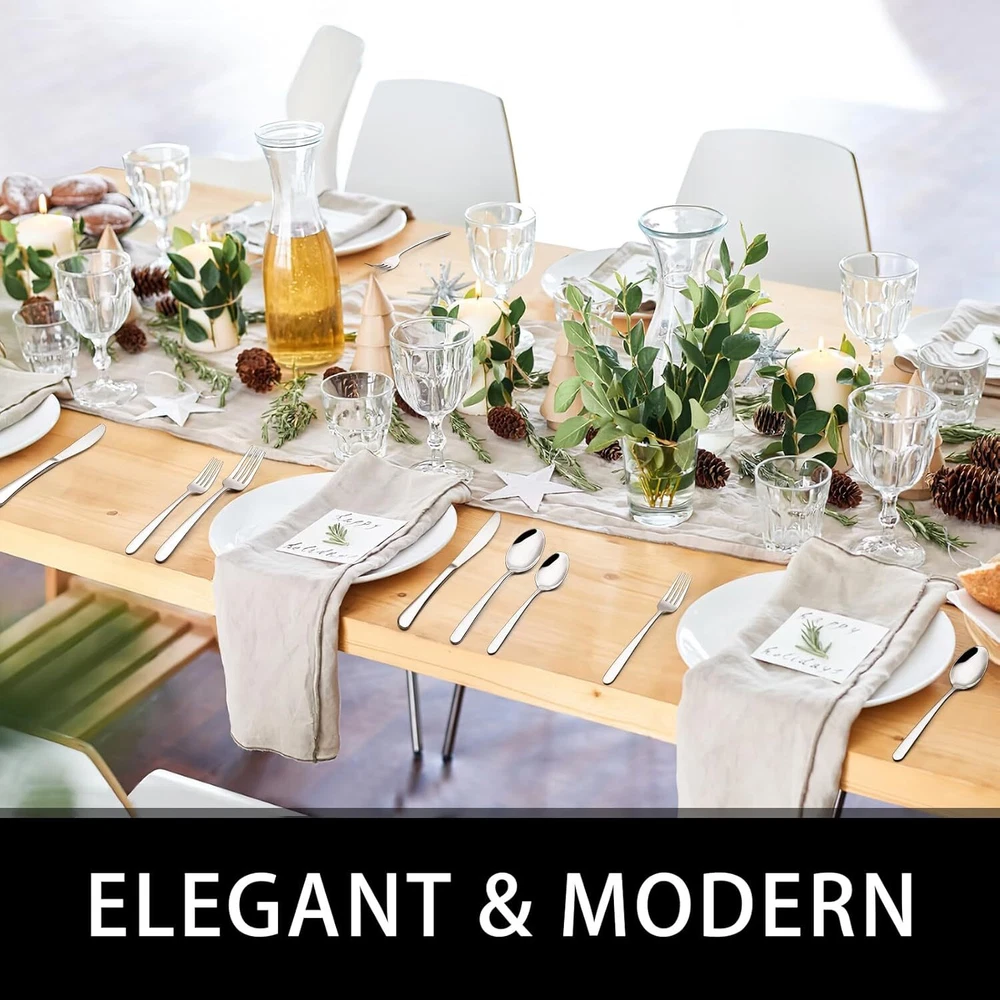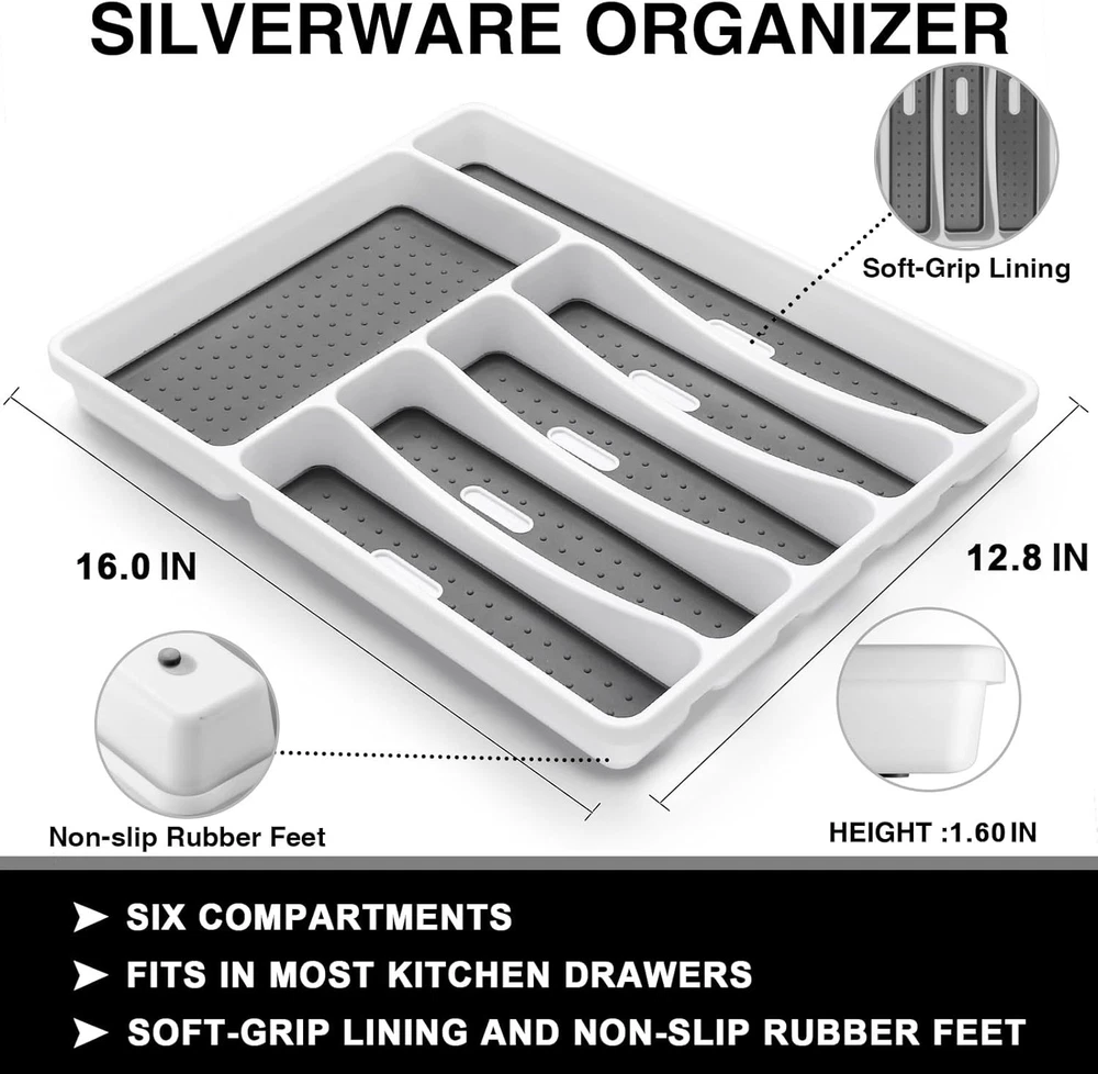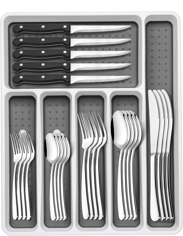 49-Piece Silverware Set with Organizer, Heavy Duty Stainless Steel Silver Product Details Brand: EWFEN Number of Pieces: 49 Material: Stainless Steel Color: Silver Product Care Instructions: Dishwasher Safe Recommended Uses For Product: Travel Special Feature: Rust Resistant Finish Type: Polished Included Components: Flatware,8 Dinner Forks,8 Salad Forks,8 Dinner Knives,8 Dinner Spoons,8 Teaspoons,8 Steak Knives Style: Heavy Duty Item Weight: 6 Pounds Is Stain Resistant: Yes Is Dishwasher Safe: Yes Manufacturer: EWFEN Package Dimensions: 17.36 x 13.54 x 2.72 inches Item Weight: 6 pounds Department: unisex-adult Item model number: xike-0054US 【49-PIECE SILVERWARE SET FOR 8】: This cutlery set with organizer come with 8 dinner forks, 8 salad forks, 8 dinner knives, 8 dinner spoons, 8 teaspoons, 8 steak knives and a silverware drawer organizer with 6 compartments. Ideal for Restaurant, weddings, catered events, party, family reunion, upscale catering, or home dinner, and much more. 【COMFORTABLE DESIGN】: This flatware set has a classic silhouette with clean lines and polish-finish surface in all silver, a good choice to go with your existing tableware. The smooth edge of the handle is pleasure to hold, appropriate weight and perfect balance are added to ensure maximum comfort during use. 【HEAVY DUTY】: 1.5 to 2 times the thickness of ordinary flatware set, thick construction will not bend or flimsy after heavy use, heavy-weight feel with exceptional balance, each eating utensil is a pleasure to hold. 【HIGH-QUALITY STAINLESS STEEL】: Made of premium food-grade stainless steel, providing the longest term value and the best properties, it offers nice resistance to rust and corrosion to get the most sturdy and healthy experience while using, never bend in daily use. 【DRAWER ORGANIZER INCLUDED】: This five compartments drawer organizer provides a great solution to your cutlery. Measures 12.8" x 16", fits in most kitchen drawers. Made from durable plastic that is sturdy to withstand normal wear and tear. Soft-grip lining and non-slip rubber feet ensure that items stay in their place.