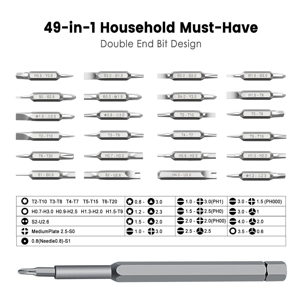 We are dedicated to providing high-quality tools that cater to the needs of professionals and DIY enthusiasts alike. Our mission is to create innovative, reliable, and user-friendly products that make everyday tasks easier and more efficient. With a focus on precision and durability, we strive to deliver tools that exceed expectations and stand the test of time. 【49-in-1 Household Must-Have】 The small screwdriver set comes with 48 different bits (Phillips, Flat, Torx, Torx Security, Pentalobe, Hex, etc.), ensuring you have the smallest but most complete set of repair tools. This mini screwdriver set has everything you need to disassemble, repair, and reassemble phones, consoles, wearables, laptops, desktops, tablets, and more 【Double End Bit Design】 Experience quick bit changes for various tasks with our innovative double end bit design. These precision screwdriver set bits offer exceptional strength and extended service life. Perfect for precision work, this feature enhances the efficiency of your toolkit 【Ergonomic Handle】 The screwdriver handle is made of durable aluminum alloy, ensuring strength and durability. The handle prevents slipping and rolling, offering you a comfortable and secure grip. The swivel cap enhances the screw turning experience, providing smooth, quick, and precise movements 【Easy to Carry】 Compact and organized, the small magnetic box ensures you can easily find the right screwdriver head every time. It securely holds all tools, preventing them from falling off or getting lost, ensuring safe storage and easy transportation 【Torx Screwdriver Set】 Perfect for IT professionals, engineers, and DIY enthusiasts. Great for birthdays, holidays, or any special occasion. Show you care with a versatile and handy magnetic screwdriver set