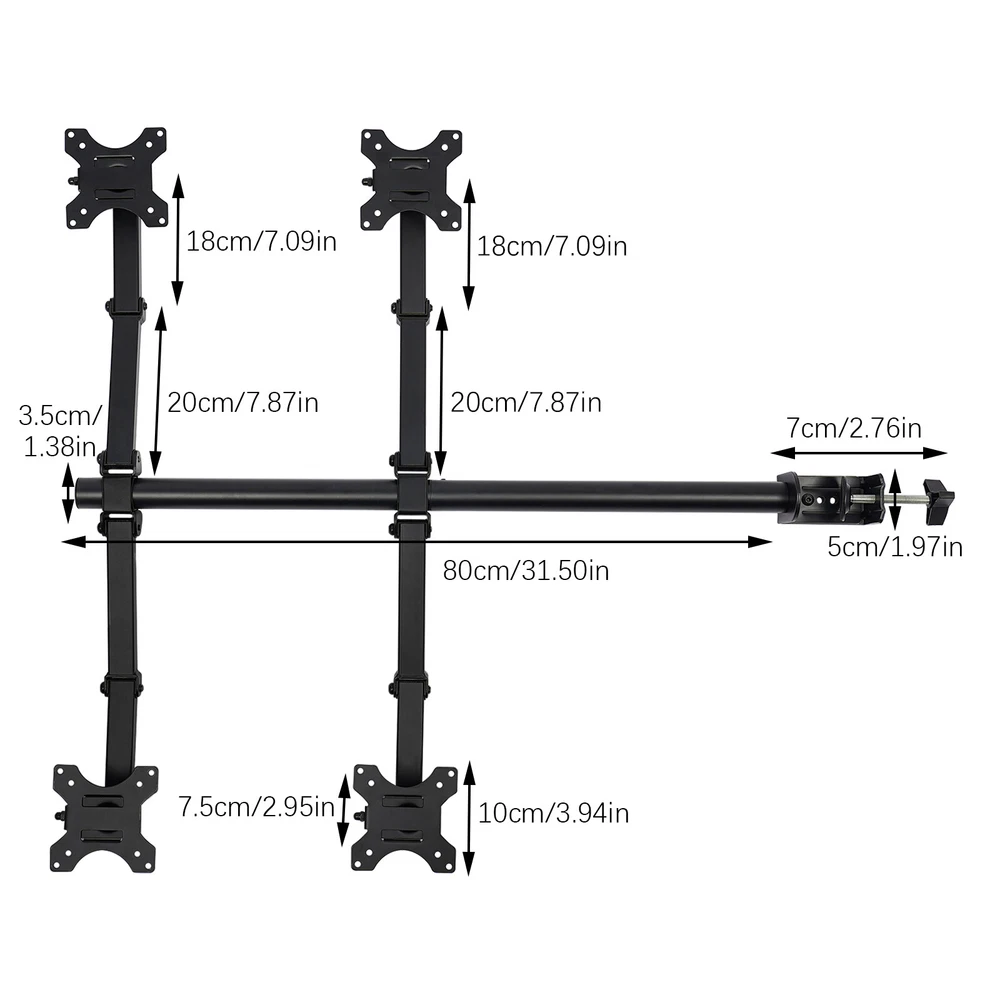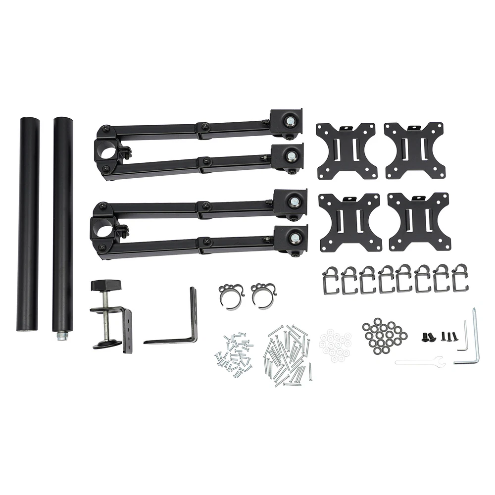 4-arm Heavy Load Screen Bracket 10-27 inch Screen Display Monitor Stand Mount Description Are you still struggling with neck pain caused by long hours of computer-watching at work? Our display bracket can solve your troubles. The combination of high-quality material and exquisite craftsmanship makes it sturdy and durable. Its height and tilt angle can be adjusted, making it comfortable for you to work. It can install 4 displays and allows you to freely choose multiple screen combinations, allowing you to work efficiently. The powerful load-bearing capacity allows you to use it with confidence. Anyway, it's your office assistant! Key Features Sturdy and Durable: Made of cold-rolled steel with an electrostatic spraying process, this product is corrosion-resistant, wear-resistant , and sturdy, ensuring your long-term use. Comfortable User Experience: The height is adjustable from 0 to 15.75 inches, the horizontal and vertical screens can rotate 360°, and the tilt angle can be adjusted up to ± 90°, allowing you to find a comfortable sitting position and relieve neck pain and eye fatigue. Multiple Combination Methods: You can choose multiple screen combination methods (vertical+vertical, horizontal+horizontal, vertical+horizontal, both inside and outside). It can install 4 display s (not included), allowing you to type code, read documents, check data, and work efficiently at the same time. Strong Load-bearing Capacity: The thickened steel pipe and reinforced joint head enable each arm to firmly support 19.84 lbs without shaking, allowing you to use it with confidence. Assembly in a Breeze: The simple structure and complete accessories allow you to easily and quickly assemble this product, which is easy. Easy to Clean: It has a smooth surface and a simple structure, so you only need to wipe the dust with a towel after use. Protective Packaging: The sponge provides comprehensive protection for products to ensure that it is fully delivered to you to the greatest extent possible. Nice Gift: This practical product is a great holiday or housewarming gift for family, friends, and lovers so that they can enjoy more convenient work. Details Small Clamp: It supports the stability of the product and effectively saves desktop space. Smooth Edge: The rounded and smooth edges not only add to the aesthetics of the product but also improve the safety of use. Application It is suitable for fixing displays in offices. It is suitable for 10-27-inch displays with 75x75mm and 100x100mm mounting holes. It is suitable for children, women, men, office workers, students, etc. Specification Style: Modern Color: Black Material: Cold-rolled Steel Process: Electrostatic Spraying Assembly Required: Yes Mounting Tyрe: Tabletop Mount Compatible Devices: Monitor Fit Number of Monitors: Four Adjustable Angle(Up and Down): ±90° Horizontal and Vertical Display Rotation Angle: 360° Each Arm Load-bearing Capacity: 9kg/19.84lbs Adjustable Height: 0-40cm/0-15.75in Applicable Display Size: 25.4-68.58cm/10-27in Applicable Maximum Desktop Thickness: 12cm/4.72in Display Installation Hole Spacing : 7.5*7.5cm/2.95*2.95in, 10*10cm/3.94*3.94in Table Clamp Size(L*H): 5*7cm/1.96*2.76in Middle Pole Size(D*H): 3.5*80cm/1.38*31.5in Package Size: 84*14.7*8cm/33.07*5.79*3.15in Gross Weight: 4.8kg/10.58lbs Net Weight: 4.5kg/9.92lbs Package Included 1* Display Bracket 2* Allen Keys Other Accessories for Installation Notes The product can rotate 360° when unloaded, but due to differences in display size and weight specifications, the rotation angle may vary. About the desk, we recommend wooden desktops. Please do not pull monitors too far forward or backward unless the stand is bolted down, as this will cause stability issues. The product design angle is 90°, but due to factors such as display size and installation environment, the actual adjustable angle is less than 90°. Please note that this product does not include a display. Please note that the applicable standards for flat/curved displays depend on whether there ia standard hole spacing on the back of the displays (75x75mm and 100x100mm mounting holes). Please allow the slight color difference caused by the shooting light and 1-3cm error due to manual measurement, and make sure you do not mind before you order. Payment Delivery details Terms of sales About us Contact us Payment We accept ebay payment 。 Fees such as import duties, taxes are not included in the item price or shipping costs. These charges are the buyer's responsibility. Delivery details Shipping: 2-9 working days to: USA Terms of sales We maintain high standards of excellence and strive for hundred percent customer satisfaction. Feedback is very important to us. We hope that you contact us immediately before you give neutral or negative feedback, so that we can address your concerns. It is impossible to address issues if we do not know about them! About us Your satis faction is our ultimate goal. We work hard to earn your trust and future business. Our certified technicians have tested each item before shipping. The unit comes with 1 year limited warranty on all manufacturing defects. a) If you receive a defective item, you may return it or ask for a discount. Please contact us within 14 days after you receive the package. b) What you returned must be intact and in its original packaging as re? u. Customer is responsible for shipping costs of the returned item. c) We will cover the cost of shipping back t with the shipping rate indicated in the registration page. We will send you a new unit or refund the full payment you paid. Thank you. Contact us Business Hour Business Hour: Monday To Friday: 8:30 AM to 5:00 PM (Beijing China time) Due to time zones, our reply to your questions may not be immediately. But within above working time, we will reply your email within 24 hours. If it's non-workdays, please kindly be patient and wait till Monday. Please contact us with ebay message. Please feel free to contact us if you