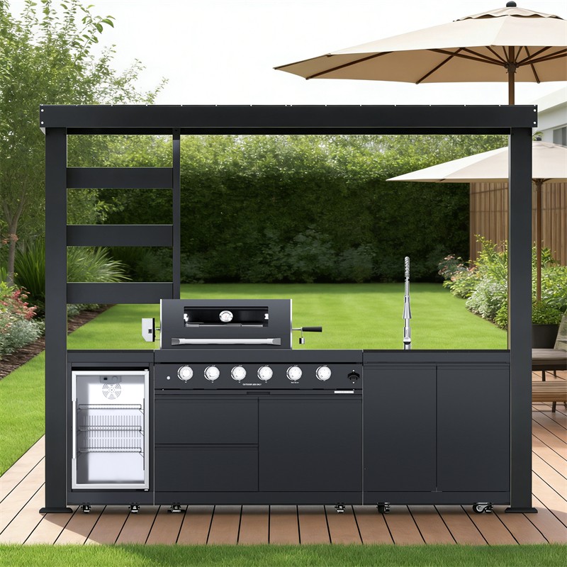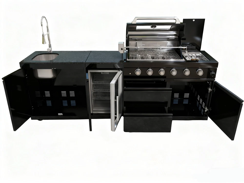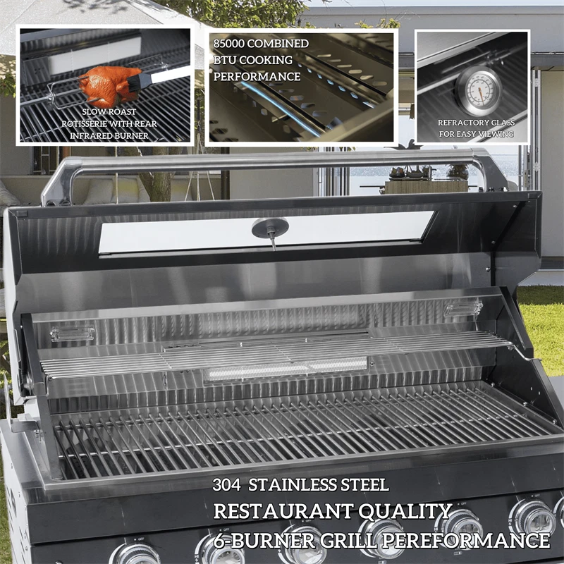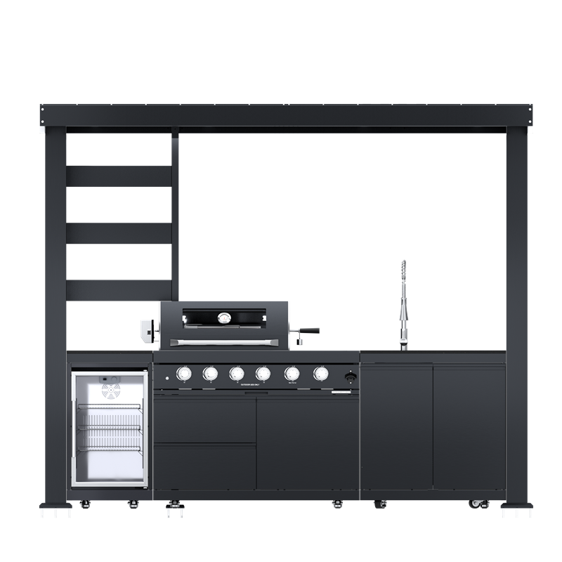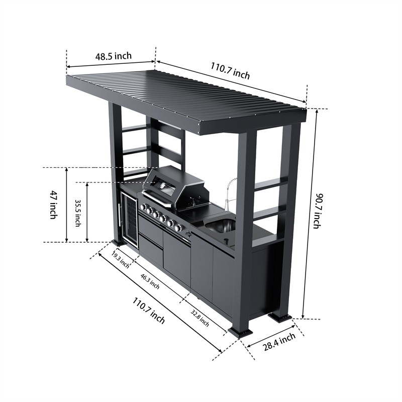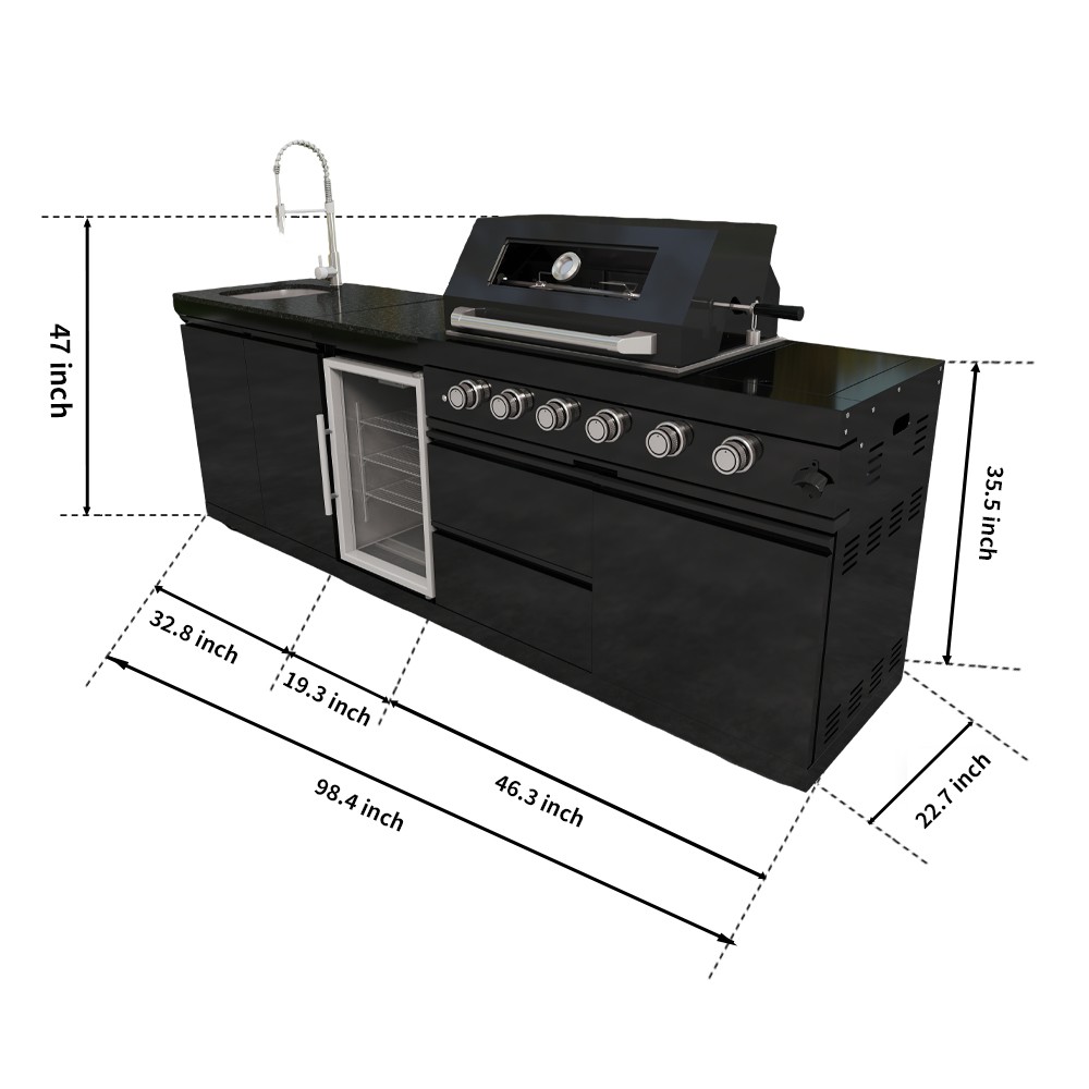 110-Inch 4-Burner 72000 BTU Deluxe S tainless Steel Gas Outdoor Kitchen Bar Barbecue Island Grill +Roof+ Wine Cooler Compact Refrigerator + Rotisserie + Granite Countertops + Storage Cabinets & Drawers Product Features ISLAND FEATURES -The SP2611A 94-inch island gas grill arrives almost fully assembled and features 6 tubular stainless steel high efficiency burners with a rear ceramic infrared rear burner and a standalone side burner that produce 85000 BTU’s of heat output. The grill also features a stainless steel warming rack, 8mm stainless steel cooking grids and a generous cooking area of 38-inches x 18-inches (684 square Inches of total cooking area). All-Weather Durability: Pro-Tect tested and proven to withstand up to 2,400 pounds or 32 inches of snow load, and winds up to 120 mph* with a full coverage galvanized steel roof . ADDITIONAL FEATURES - A double lined grill hood with temperature gauge is standard for maximum heat retention. The grill has two cooking surface halogen lights, On/off red/white changing control knob lights, a bottle opener, electronic ignition, easy access full front pull-out grease tray for easy cleaning, black granite countertops, plus storage drawers and cabinets. Your outdoor kitchen will also come with gliding castor wheels for smooth and easy-to-maneuver movement and increased stability. STAINLESS STEEL CONSTRUCTION - This modular outdoor kitchen is made of 304 marine grade stainless steel, a high-quality material that is known for its durability & resistance to corrosion & rust that also adds sleek, modern, and stylish addition to your backyard or patio. High consistent heat output are made possible by the stainless steel burners, allowing you to cook a variety of food and meals with ease. The stainless steel components also make the grill easy to clean and maintain. REFRIGERATOR FEATURES - The outdoor rated ONRUN refrigerator is made with heavy duty 304 stainless steel construction for durability and resistance to the elements. It comes with a stylish glass door for easy viewing of contents and interior blue lighting as well to improve visibility and overall user experience. Additional features include temperature control, adjustable shelves, and a lockable door to secure contents and prevent unauthorized access. Dimensions - 18 1/2” x 18” x 26 1/2” Description Fully Functions of Outdoor Kitchen Grill Double grill design offers a larger cooking area with 484 sq. in. of total space—perfect for grilling multiple dishes at once. Portable refrigerator with adjustable shelves holds up to 60 cans, offering flexible, spacious cooling for all your outdoor essentials. Black marble countertop offers oil resistance and easy cleaning, providing a sleek, durable surface for convenient food prep outdoors. Swivel faucet with 360° rotation and built-in stainless steel sink offers convenient, flexible cleaning for all your outdoor cooking needs. Six-burner with ceramic infrared rear burner provide 85,000 BTU total power—perfect for high-heat searing and rotisserie cooking. 120V 4W heavy-duty rotisserie kit supports slow roasting, holding up to 25 lbs for tender, evenly cooked meats every time. Built-in temperature gauge offers precise heat monitoring, helping you cook with accuracy for perfect grilling results every time. LED knobs glow red when ignited, paired with dual internal lights to ensure precise grilling visibility—even during nighttime cooking. Features a front-access grease tray for easy cleanup—just slide out, empty, and keep your grill clean with minimal effort. Independent round side burner offers flexible heat zones for side dishes or sauces, enhancing your outdoor kitchen island use. Built-in bottle opener adds instant convenience—pop open your favorite drinks without leaving your outdoor kitchen grill. 360° rotating caster wheels with adjustable leveling feet ensure smooth mobility and stable setup on uneven patio or backyard surfaces. Upgraded Parts Replacement Design Pin Connect Burner Our burners are installed using the Pin Connect method. If they are damaged, you can simply rotate the pin to replace them without the need for expensive repairs. Easy Disassemble knob If the knob becomes damaged, simple removal and reinstallation can be done quickly.