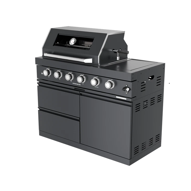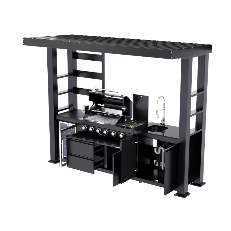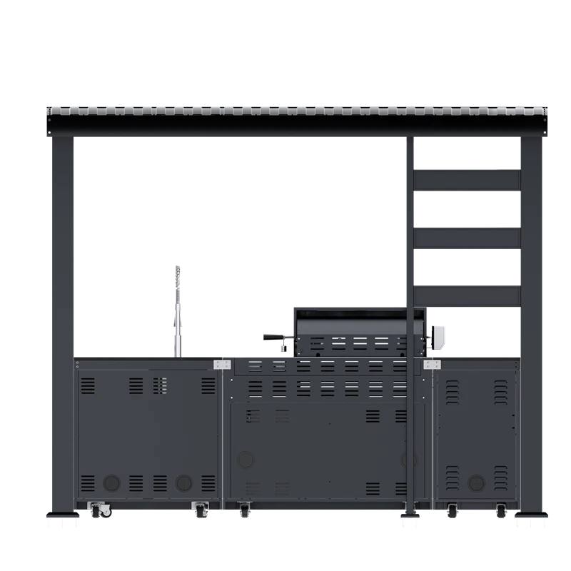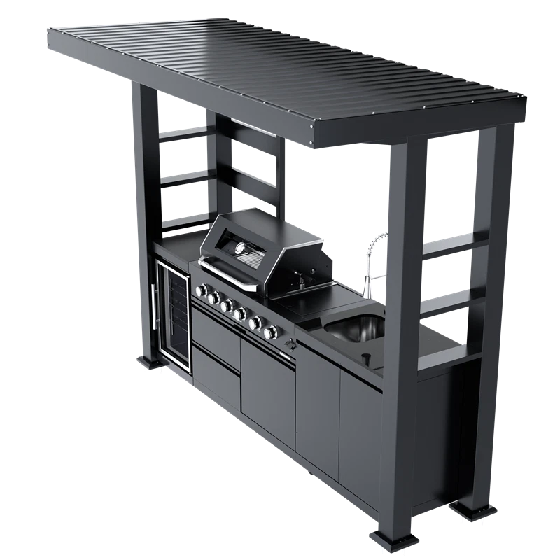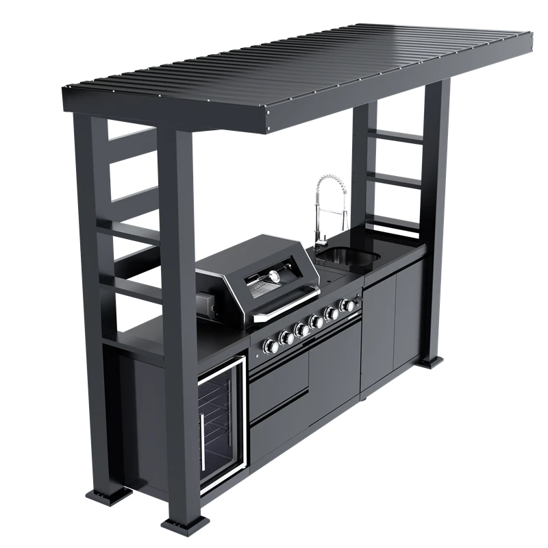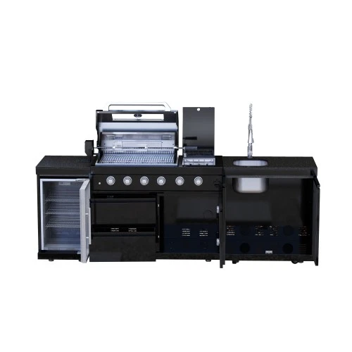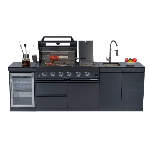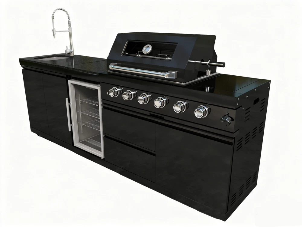 110-Inch 4-Burner 72000 BTU Deluxe S tainless Steel Gas Outdoor Kitchen Bar Barbecue Island Grill +Roof+ Wine Cooler Compact Refrigerator + Rotisserie + Granite Countertops + Storage Cabinets & Drawers Product Features ISLAND FEATURES -The SP2611A 94-inch island gas grill arrives almost fully assembled and features 6 tubular stainless steel high efficiency burners with a rear ceramic infrared rear burner and a standalone side burner that produce 85000 BTU’s of heat output. The grill also features a stainless steel warming rack, 8mm stainless steel cooking grids and a generous cooking area of 38-inches x 18-inches (684 square Inches of total cooking area). All-Weather Durability: Pro-Tect tested and proven to withstand up to 2,400 pounds or 32 inches of snow load, and winds up to 120 mph* with a full coverage galvanized steel roof . ADDITIONAL FEATURES - A double lined grill hood with temperature gauge is standard for maximum heat retention. The grill has two cooking surface halogen lights, On/off red/white changing control knob lights, a bottle opener, electronic ignition, easy access full front pull-out grease tray for easy cleaning, black granite countertops, plus storage drawers and cabinets. Your outdoor kitchen will also come with gliding castor wheels for smooth and easy-to-maneuver movement and increased stability. STAINLESS STEEL CONSTRUCTION - This modular outdoor kitchen is made of 304 marine grade stainless steel, a high-quality material that is known for its durability & resistance to corrosion & rust that also adds sleek, modern, and stylish addition to your backyard or patio. High consistent heat output are made possible by the stainless steel burners, allowing you to cook a variety of food and meals with ease. The stainless steel components also make the grill easy to clean and maintain. REFRIGERATOR FEATURES - The outdoor rated ONRUN refrigerator is made with heavy duty 304 stainless steel construction for durability and resistance to the elements. It comes with a stylish glass door for easy viewing of contents and interior blue lighting as well to improve visibility and overall user experience. Additional features include temperature control, adjustable shelves, and a lockable door to secure contents and prevent unauthorized access. Dimensions - 18 1/2” x 18” x 26 1/2” Description Fully Functions of Outdoor Kitchen Grill Double grill design offers a larger cooking area with 484 sq. in. of total space—perfect for grilling multiple dishes at once. Portable refrigerator with adjustable shelves holds up to 60 cans, offering flexible, spacious cooling for all your outdoor essentials. Black marble countertop offers oil resistance and easy cleaning, providing a sleek, durable surface for convenient food prep outdoors. Swivel faucet with 360° rotation and built-in stainless steel sink offers convenient, flexible cleaning for all your outdoor cooking needs. Six-burner with ceramic infrared rear burner provide 85,000 BTU total power—perfect for high-heat searing and rotisserie cooking. 120V 4W heavy-duty rotisserie kit supports slow roasting, holding up to 25 lbs for tender, evenly cooked meats every time. Built-in temperature gauge offers precise heat monitoring, helping you cook with accuracy for perfect grilling results every time. LED knobs glow red when ignited, paired with dual internal lights to ensure precise grilling visibility—even during nighttime cooking. Features a front-access grease tray for easy cleanup—just slide out, empty, and keep your grill clean with minimal effort. Independent round side burner offers flexible heat zones for side dishes or sauces, enhancing your outdoor kitchen island use. Built-in bottle opener adds instant convenience—pop open your favorite drinks without leaving your outdoor kitchen grill. 360° rotating caster wheels with adjustable leveling feet ensure smooth mobility and stable setup on uneven patio or backyard surfaces. Upgraded Parts Replacement Design Pin Connect Burner Our burners are installed using the Pin Connect method. If they are damaged, you can simply rotate the pin to replace them without the need for expensive repairs. Easy Disassemble knob If the knob becomes damaged, simple removal and reinstallation can be done quickly.