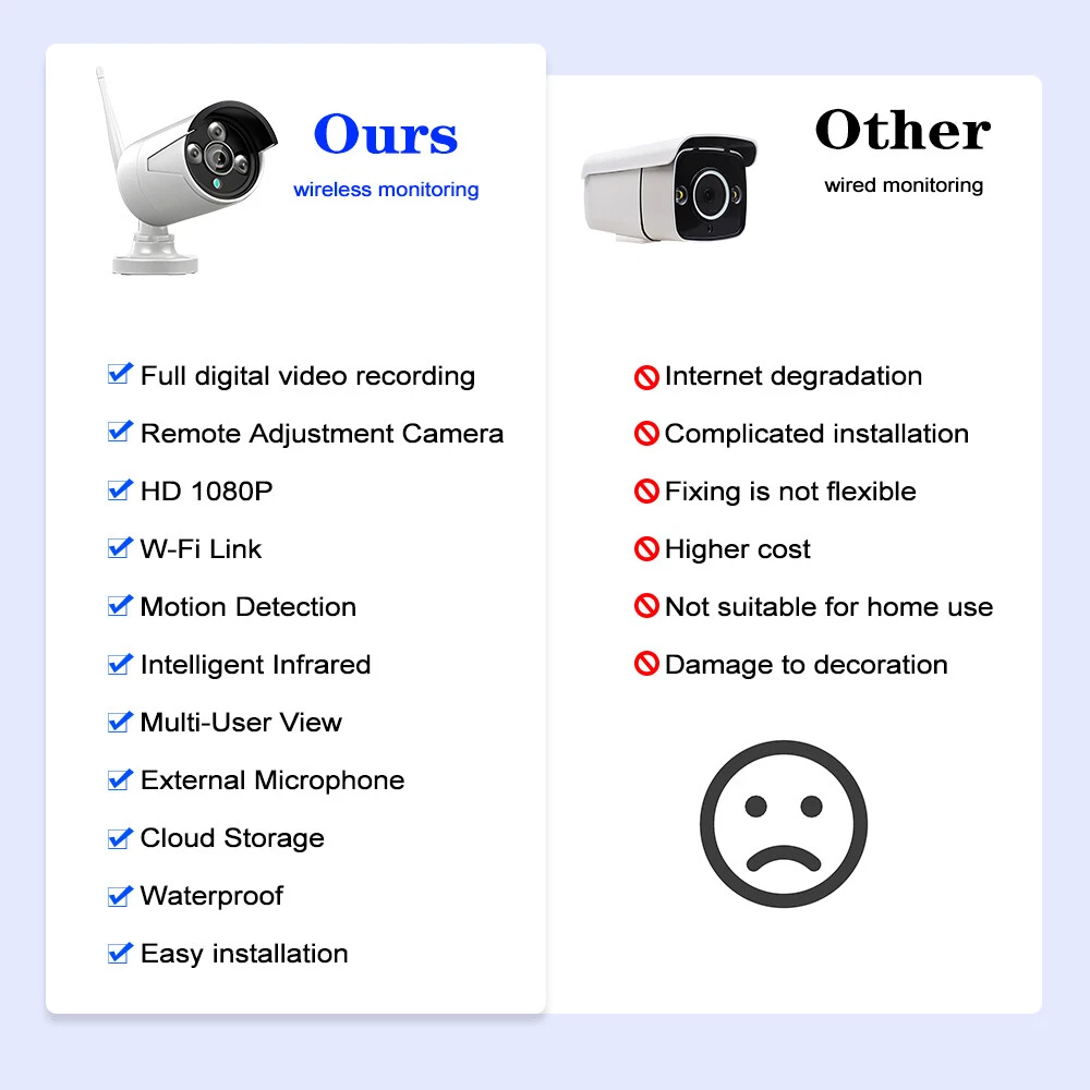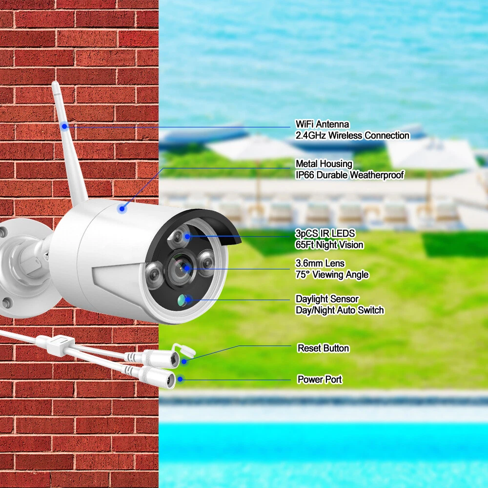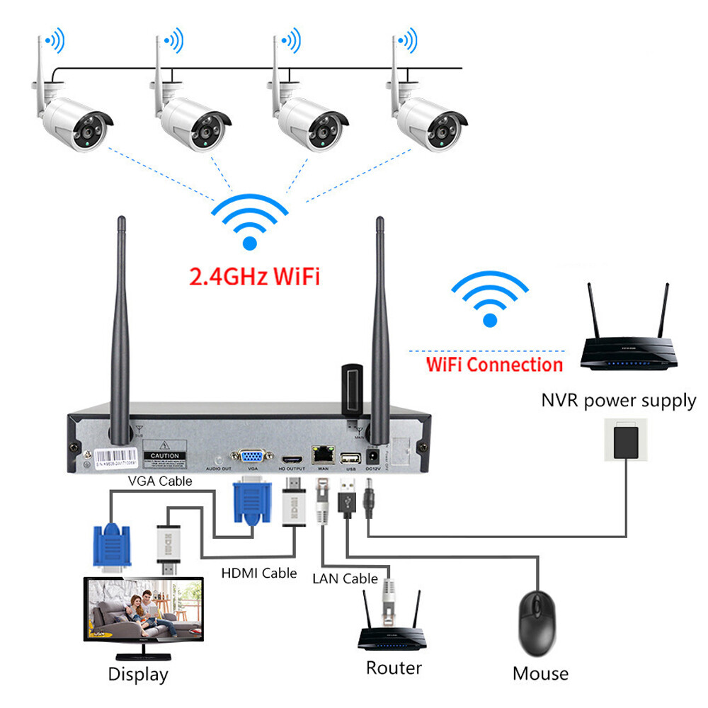 Features: Product List: Host * 1+Camera * 4+Camera Plug * 4+Host Plug * 1+Mouse * 1+Ethernet Cable (1 meter) * 1+Screw Pack * 4+Instruction Manual * 1 Procurement specification: 4CH 3mp (US standard) APP:xvreye Operating System: Embedded Linux Video compression: H.265 High Profile/ H.264 Main Profile Video output:720P60,XGA,1080P60 Video input(IP):4*1080P/4*960P/4*720P Audio compression: G.711 Intercom: None Recording mode: manual/alarm/video detection/continuous Local playback: 4 * 1080P Video storage: network Backup methods: network backup, USB hard drive agreement: TCP/IP,HTTP,DHCP,UDP,RTP,RTSP,FTP,NTP,ONVIF,SADP,P2P Frequency: 2.4G Antenna structure: 2 * 2MIMO Transmission distance: accessible for over 80 meters, wall penetration for over 30 meters, actual transmission distance depends on the situation Video output: 1 HDMI, 1 VGA output Audio input/output: none Alarm input/output: None Network interface: 1 * RJ45 10M/100M adaptive Ethernet port USB: 2 * USB 2.0 ports Hard drive: 1 SATA (maximum 4TB) Power Supply: DC+12V /2A Power consumption: 5W (excluding hard drive) Working environment: Temperature: -10 ℃ -+55 ℃, Humidity: 10% -90% RH Product features: 1. The Wi Fi camera uses built-in Wi Fi (100 feet) and HDMI cables to connect to the NVR and TV screen, without the need for an external network. It can be freely placed anywhere in the home. If you want to view remotely through a smartphone or computer, simply connect to 2.4G home Wi Fi; 2. Infrared and artificial intelligence human motion detection. This security camera system provides comprehensive protection through PIR motion detection and AI intelligent human detection, leading the way; 3. Designed specifically for outdoor use, suitable for homes, garages, backyards, offices, companies, living rooms, doorways, and other places; 4. Video playback and easy settings. This wireless surveillance camera system can easily view playback of 4 channels simultaneously without switching between recordings; 5. Multiple recording methods and one-way audio, the surveillance camera system can be connected to an external microphone for two-way communication with the camera itself, thereby enhancing security measures.