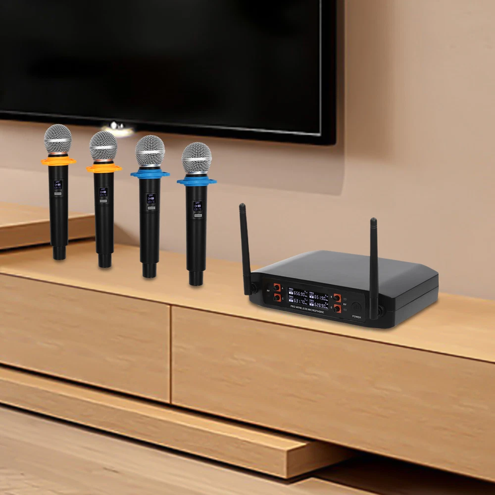 Package Included 4* Microphones 1* Receiver 1* Power Charger 1* Connecting Cable 4* Anti-slip Rings 1* English Manual Application This product is ideal for conferences, presentations, webcasts, karaoke, home, KTV, hotels, large parties, DJs, weddings, speeches, wedding, classes, and live performances. Specification Color: Black Material: ABS Process: Painting Plug: US Standard Battery Required: Yes Battery Type: AA Batteries Number of Microphones: 4 Power Source: Corded/Battery Powered Receive Distance: About 20m/65.62ft Each Microphone Size(L*D): 24*5cm/9.4*2inch Receiver Size: 20.8*13.7*3.5cm/8.2*5.4*1.4inch Package Size: 28*27.5*11cm/11.02*10.83*4.3in Microphone Weight(Each): 0.15kg/0.33lbs Wireless Microphone System 4 Channel Pro Audio UHF 4 Handheld Dynamic Mic Party Wireless Microphone System Four Handheld Mics Set 65.62ft Practical Receiver Description If you are looking for a high-quality microphone, our wireless microphone system will be your ideal choice. It uses advanced technology and high-quality material to ensure high-fidelity sound quality and stable signal transmission, making your voice clearer and more pleasant when recording music, speeches, live broadcasts, and more. Its lightweight and ergonomic grip makes it easy to carry for work or outdoor activities. Key Features Build to Last: The high-quality ABS, and painting process make the product resist fading, corrosion, wear, impact, and rust, thus it can withstand the test of time well. Signal Stability: Fixed frequency reception design can effectively prevent frequency breakage and crosstalk. Dual antenna reception can get rid of sound interruption and channel blocking issues with more accurate and stable signal transmission, achieving real-time transmission, and thus ensuring low latency. Practical Receiver: It can receive sound from the microphone and amplify it, with a receiving distance of about 65.62 ft. It can also support audio devices such as speakers, mixers, amplifiers, and more. Easy to Operate: Complete accessories, a simple operating panel with RF signal lights and volume knobs, and a detailed English manual allow you to quickly master it. A clear LED display shows frequency and channel in real-time, making it easy for you to make adjustments. High Portability: The microphone's lightweight( 0.33 lbs ) and compact size(9.4*2 inches) make it easy for you to carry around, allowing you to enjoy the beauty of music creation. Easy to Clean: It has a smooth surface and a simple structure, so you only need to wipe the dust or residue with a towel after use. Ideal Gift: This practical product will be a wonderful surprise for your family or friends who love singing, bringing them a more happy life. Customer Service: We aim to provide quality products and services. If you have any problems, please feel free to contact us. We will reply and solve the problem for you as soon as possible. Details Ergonomic Grip : The microphone grip fits well into the curve of your hand and can keep you comfortable after long hours of use. Anti-slip Ring : It allows you to avoid worrying about accidentally dropping off the microphone during use, providing you with a better experience. Application This product is ideal for conferences, presentations, webcasts, karaoke, home, KTV, hotels, large parties, DJs, weddings, speeches, wedding, classes, and live performances. Specification Color: Black Material: ABS Process: Painting Plug: US Standard Battery Required: Yes Battery Type: AA Batteries Number of Microphones : 4 Power Source: Corded/Battery Powered Receive Distance: About 20m/65.62ft Each Microphone Size(L*D): 24*5cm/9.4*2inch Receiver Size: 20.8*13.7*3.5cm/8.2*5.4*1.4inch Package Size: 28*27.5*11cm/11.02*10.83*4.3in Microphone Weight(Each): 0.15kg/0.33lbs Receiver Weight: 0.35kg/0.77lbs Gross Weight: 1.5kg/3.3lbs Package Included 4* Microphones 1* Receiver 1* Power Charger 1* Connecting Cable 4* Anti-slip Rings 1* English Manual Notes Please read the manual completely before installation and use, and pay particular attention to the safety instructions included. If there is no sound from the microphone, you need to reconnect it. This product should not be used for children under 5 years old, please use it under the supervision of an adult. Please avoid putting the main machine at a blind angle when it is used. This is for keeping signal receiving in good condition. It is noted that the overall sound effect depends on the stereo equipment. The better the equipment, the better the microphone. Please allow the slight color difference caused by the shooting light and 1-3cm error due to manual measurement, and make sure you do not mind before ordering. Payment Delivery details Terms of sales About us Contact us Payment We accept ebay payment 。 Fees such as import duties, taxes are not included in the item price or shipping costs. These charges are the buyer's responsibility. Delivery details Shipping: 2-9 working days to: USA Terms of sales We maintain high standards of excellence and strive for hundred percent customer satisfaction. Feedback is very important to us. We hope that you contact us immediately before you give neutral or negative feedback, so that we can address your concerns. It is impossible to address issues if we do not know about them! About us Your satis faction is our ultimate goal. We work hard to earn your trust and future business. Our certified technicians have tested each item before shipping. The unit comes with 1 year limited warranty on all manufacturing defects. a) If you receive a defective item, you may return it or ask for a discount. Please contact us within 14 days after you receive the package. b) What you returned must be intact and in its original packaging as re? u. Customer is responsible for shipping costs of the returned item. c) We will cover the cost of shipping back t with the shipping rate indicated in the registration page. We will send you a new unit or refund the full payment you paid. Tha