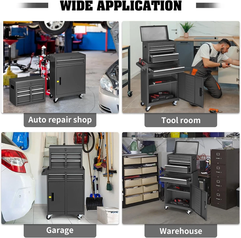 Product Description About this item Top Removable Tool Box - This Rolling Tool Chest has 1 rolling tool cabinet with 1 drawer on the bottom and 1 top box with 3 drawers on top. The whole tool box can be disassembled into two parts, and the top box can be put into the big bottom box, which saves space and is even convenient to carry 4 Drawer Storage - This tool cabinet is designed with a total of 4 drawers and 1 base cabinet for storing tools, small equipment or other items. The base cabinet has side hooks for hanging tools such as wrenches. There are holes on the side where tools can be placed for your convenience Easy to move - This tool storage chest & cabinet combo has 4 wheels, 2 of which are lockable and can be locked to prevent movement when it is not needed. The separate tool box on the top also has a handle design for easy movement Lock & Security - The top separate tool box of this product offers a locking bar to prevent the drawer from sliding out during movement, and the bottom rolling tool cabinet is also designed with a lock for added security Durable & Versatile - The tool chest with wheels is made of high quality steel for added durability and is powder coated for a smooth finish that is easy to maintain and clean. It can be used in various occasions such as garages, warehouses, workshops, repair shops and more Note: Please pay attention to product size when purchasing