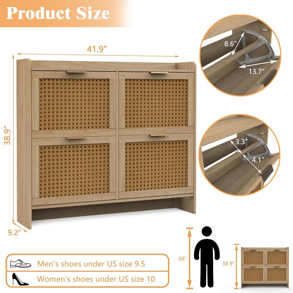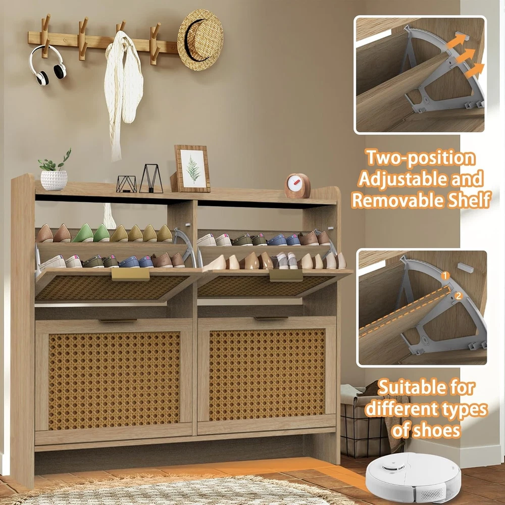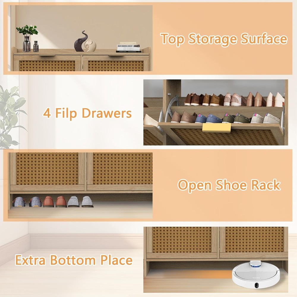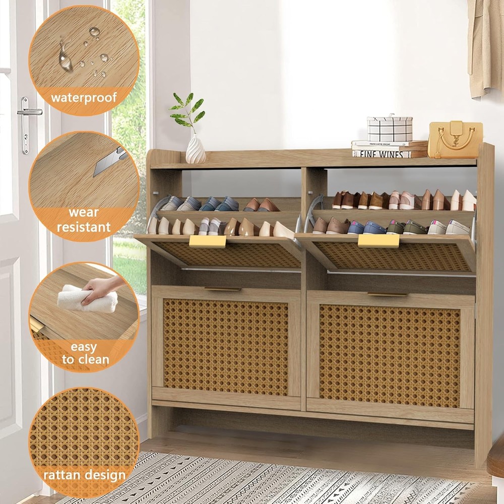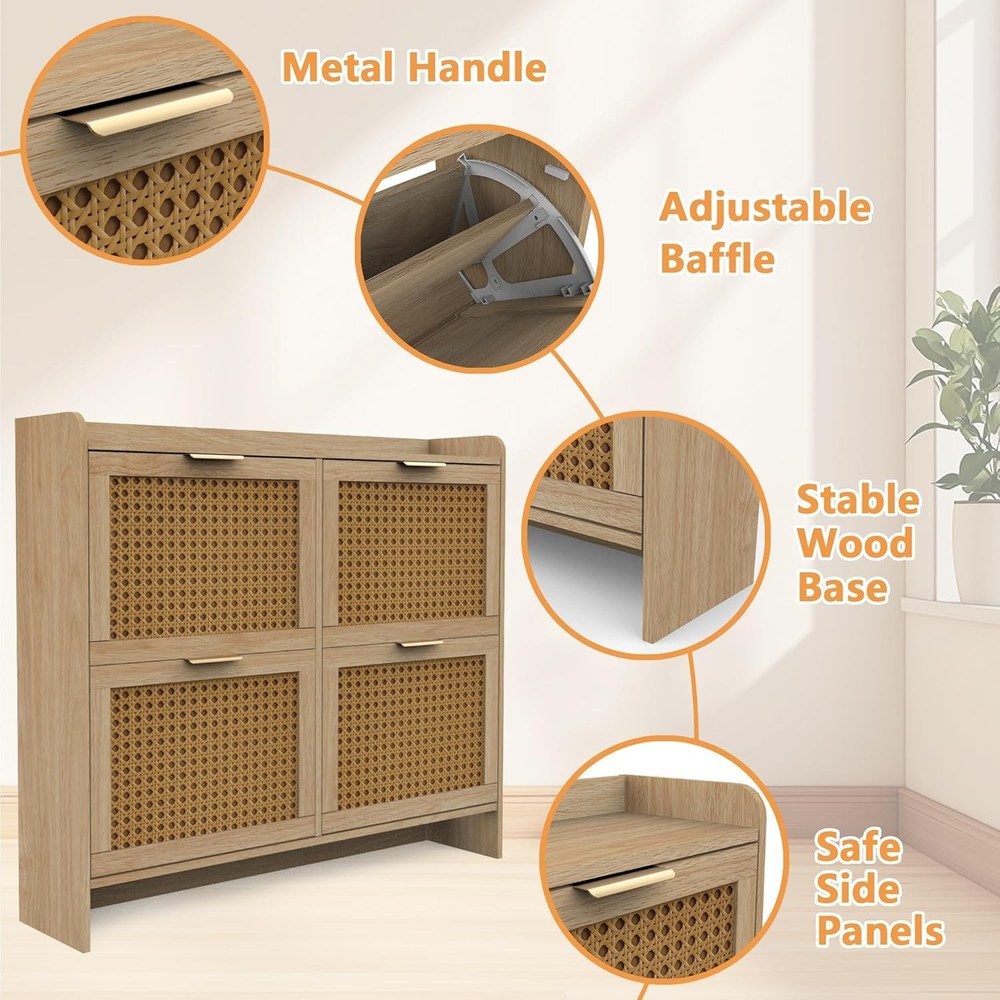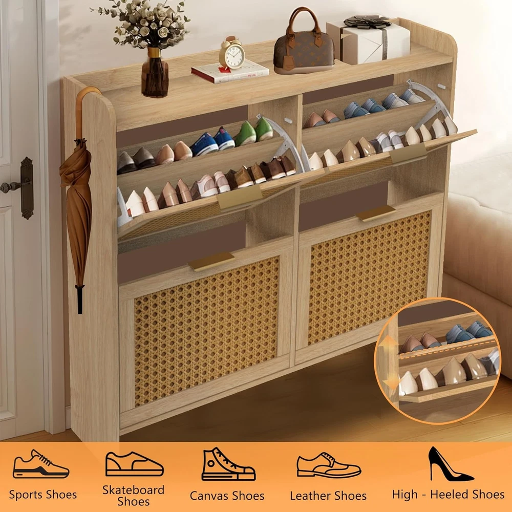1. This shoe cabinet is a game-changer for small spaces! The four rattan flip drawers look stylish and hold plenty of shoes while keeping them neatly organized. The light oak finish adds a warm, modern touch to any entryway or hallway. Sturdy yet slim enough to fit tight spots, it's both functional and beautiful. Love how easy it is to access shoes while keeping clutter out of sight!