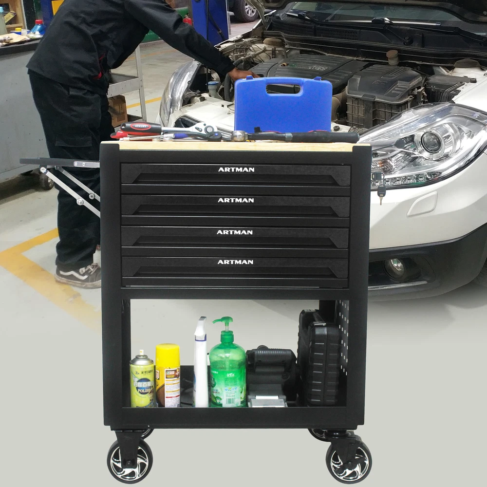4 Drawers Rolling Chest Tool Cart Garage Storage Cabinet Tool Box Wooden Top Features Garage Organizer Cart with 4 Drawers Tool Chest High Capacity Large Storage Cabinet Adjustable Shelf, for Warehouse, Workshop 4 drawer utility vehicle with wheels and wooden top Description Holding Panel both side have holding panel can handle hooks Five Inch Heavy Duty Wheels Two universal wheels with break, two fixed wheels Adjustable Shelf This shelfs can been folded Ball Bearing Slide 45 KG loading capacity ball bearing slide Product Information product Name 4 Drawers Heavy Duty Tool Trolley with Adjustable Shelf Material Metal Product Size 35.4*26.9*17.9 inch Side of the Drawer 20.9*15.7*2.2 inch Size of the Shelf 7.9*12.2*0.6 inch Weight of the Product 42.3KG Thickness of the Metrial 0.6~0.8MM Loadding Capacity 300KG Number of Carton 1