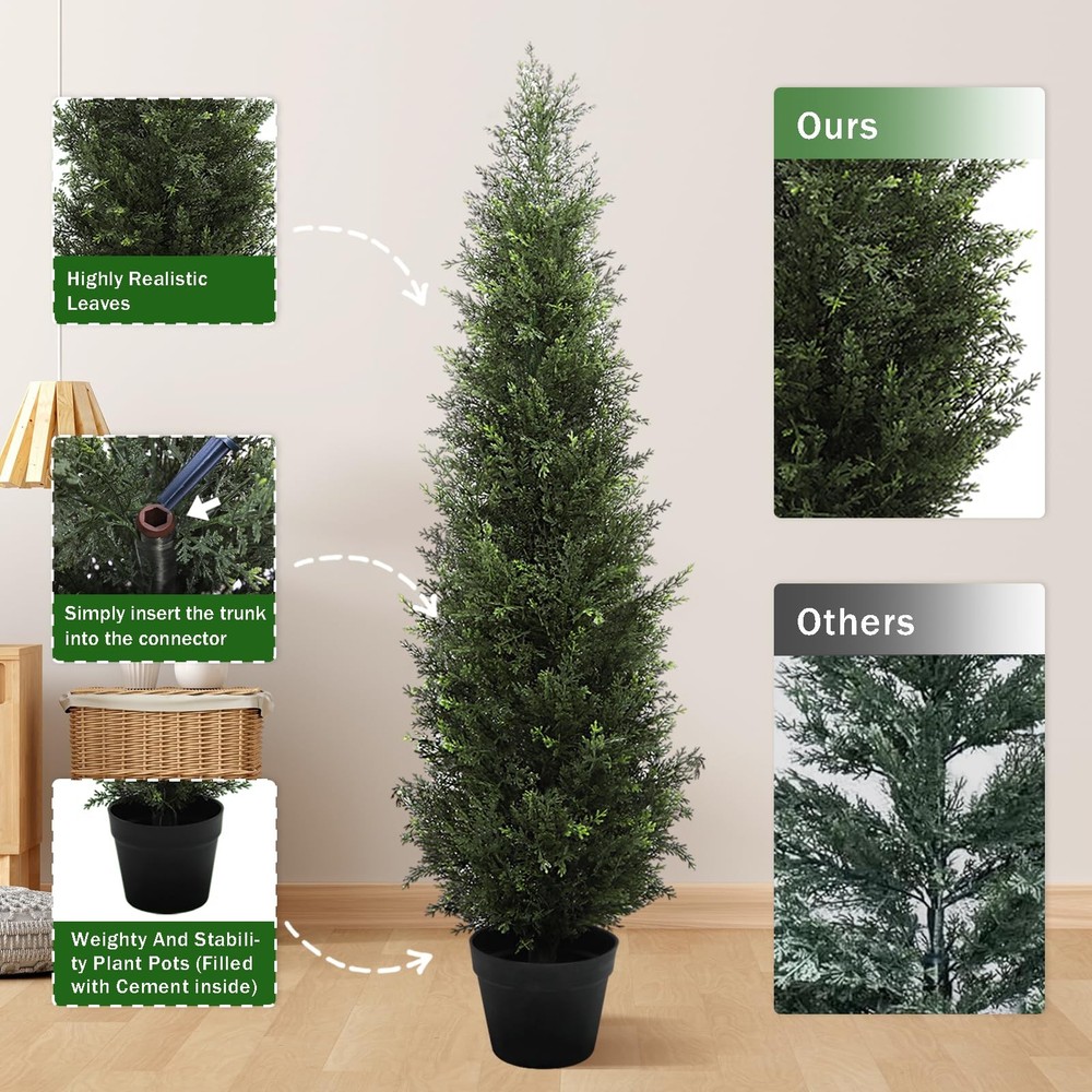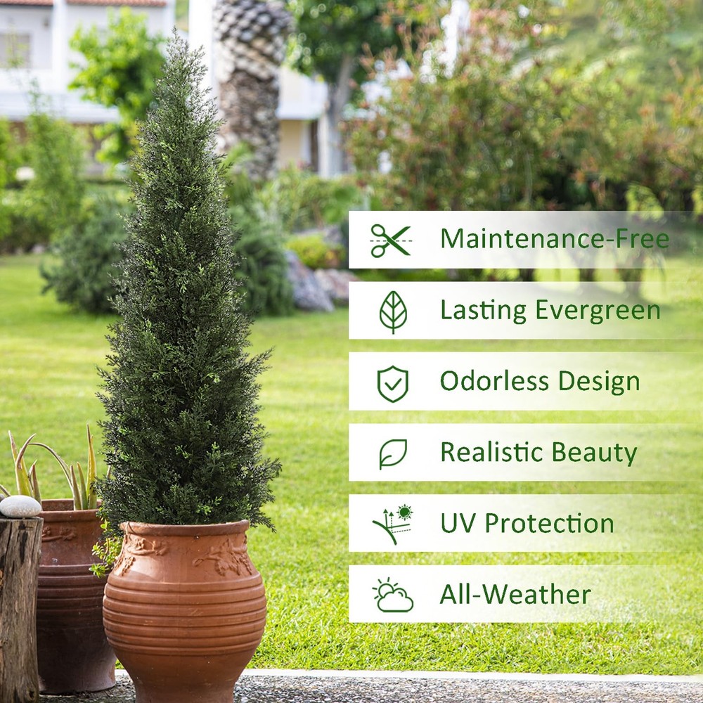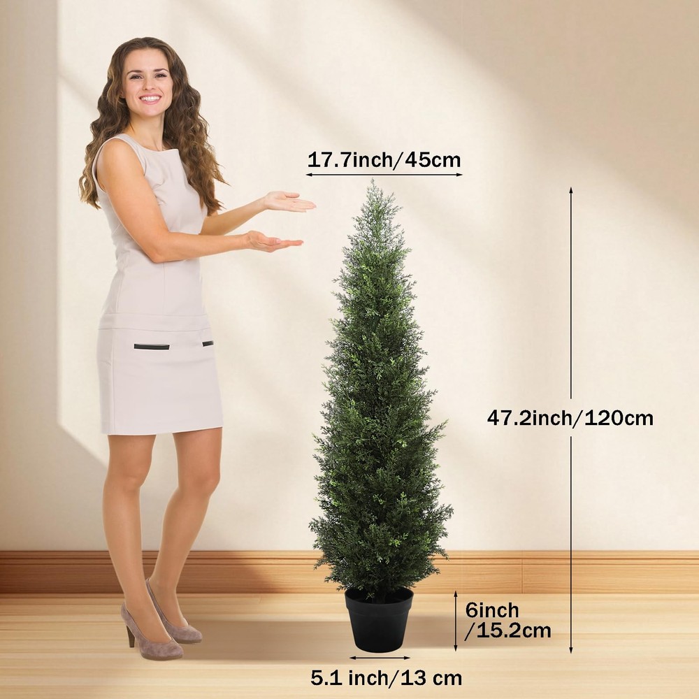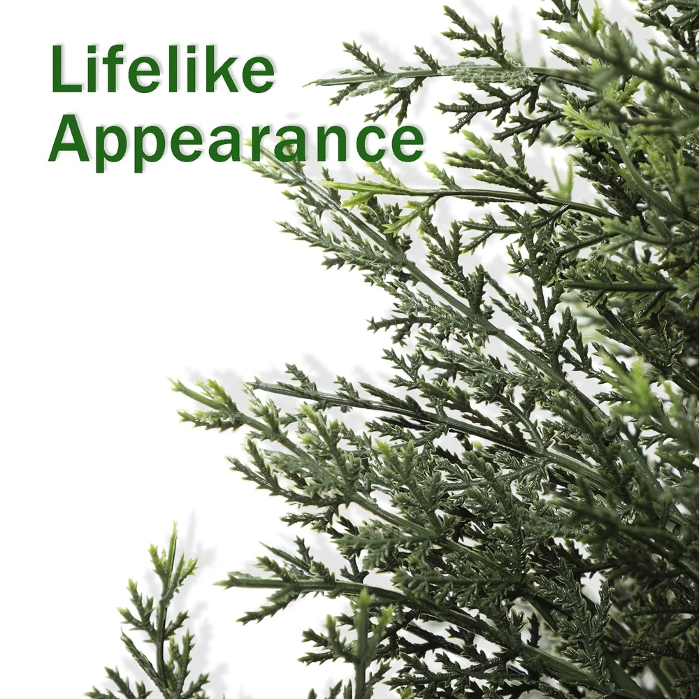 Transform your outdoor space with these stunning 3-foot or 4-foot artificial cedar topiary trees. This set of 2 potted cypress trees brings the timeless elegance of manicured landscaping without the maintenance. Each tree features meticulously detailed, UV-resistant foliage that maintains its rich green color throughout the seasons. The classic conical shape and dense branch arrangement create a sophisticated silhouette perfect for framing entrances, enhancing porches, or adding structure to garden designs. Arriving in sturdy black planters, these versatile decorative trees can be used straight away or transferred to decorative containers of your choice. Their realistic appearance and durable construction make them ideal for both indoor and outdoor use, offering year-round greenery without watering or pruning. At 3 feet or 4 feet tall, these topiaries provide the perfect scale for entryways, patios, or as accent pieces in your landscape design. ALL-WEATHER UV PROTECTION OUTDOOR TOPIARY TREES: Engineered with premium UV-resistant foliage that withstands intense sun exposure & heavy rainfall while maintaining true evergreen coloration. Perfect for permanent outdoor display on patios, porches, or garden landscapes without fading concerns ULTRA-REALISTIC ARTIFICIAL CEDAR TREES: Realistic textured cedar foliage and natural green coloring creates a convincing evergreen look; Two height options (3 ft and 4 ft) for versatile indoor/outdoor display coordination MULTI-FUNCTIONAL DECOR FOR EVERY SPACE: Creates effective visual barrier when placed in pairs; Use as windbreak partitions for pool areas, driveway border markers, or commercial property accents. Ideal for enhancing porches, front doors, gardens, patios, or indoor spaces with maintenance-free greenery, whether it is for home, office, commercial space, or holiday decorations, this cedar tree can easily create a different atmosphere and style ZERO MAINTENANCE ARTIFICIAL CEDAR TOPIARY TREES: Bring the beauty of nature into your space without the hassle of maintaining traditional plants. Special updated coating on the leaves helps maintain color and prevents fading when placed in outdoor settings. The premium construction makes them resistant to fading and weather damage. Perfect alternative for high-traffic commercial spaces or busy homeowners MULTI-LOCATION READY USE: Pre-potted in weighted planters for immediate placement stability, these topiary trees require no assembly and can be placed immediately for instant decoration. Weighted bases prevent tipping in windy conditions; Compatible with various outdoor surfaces (concrete deck gravel); Neutral planter complements modern and traditional decor schemes
