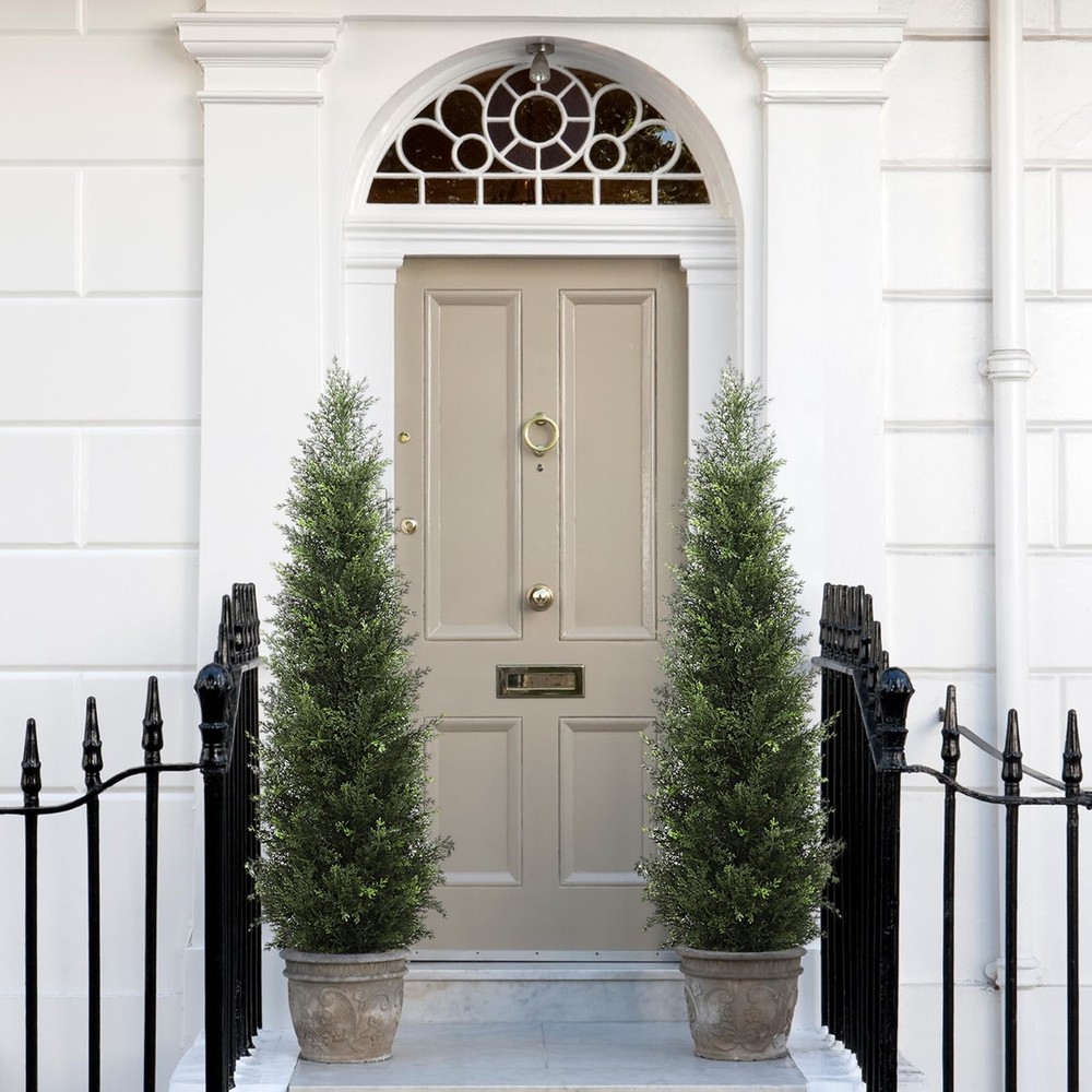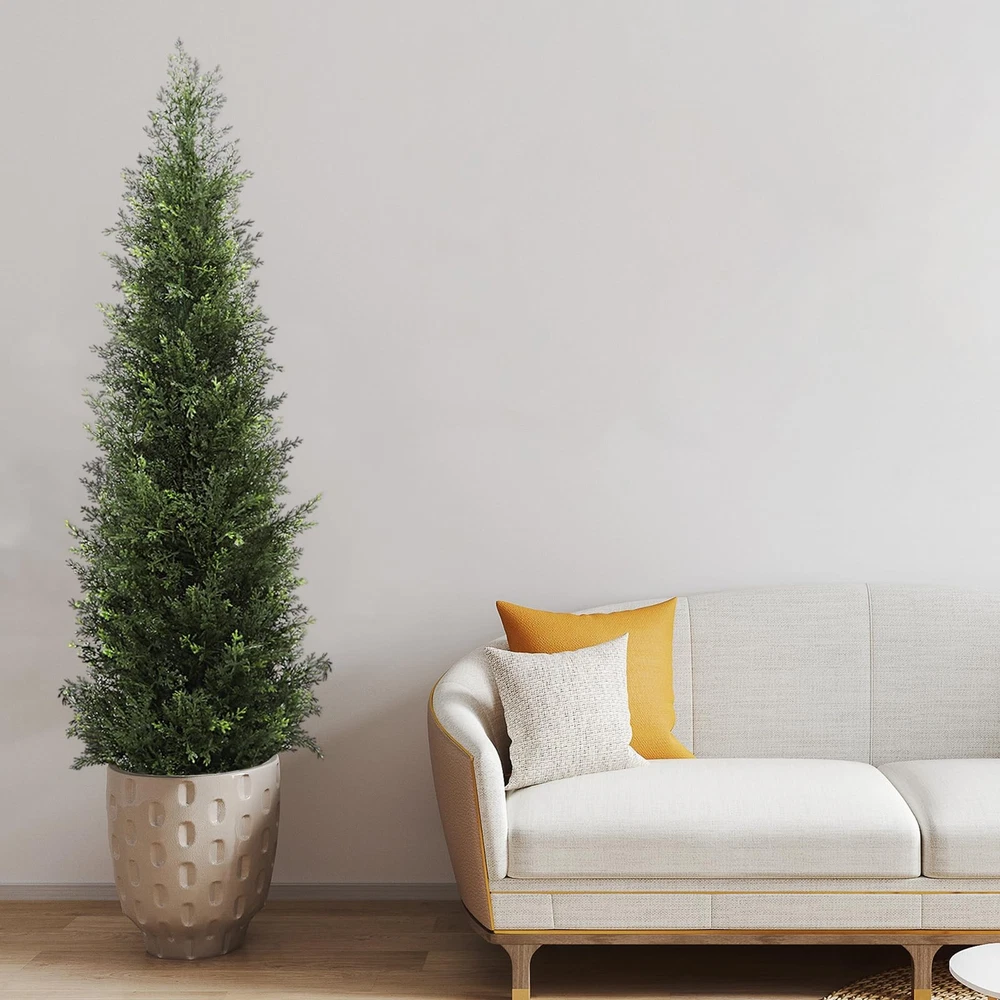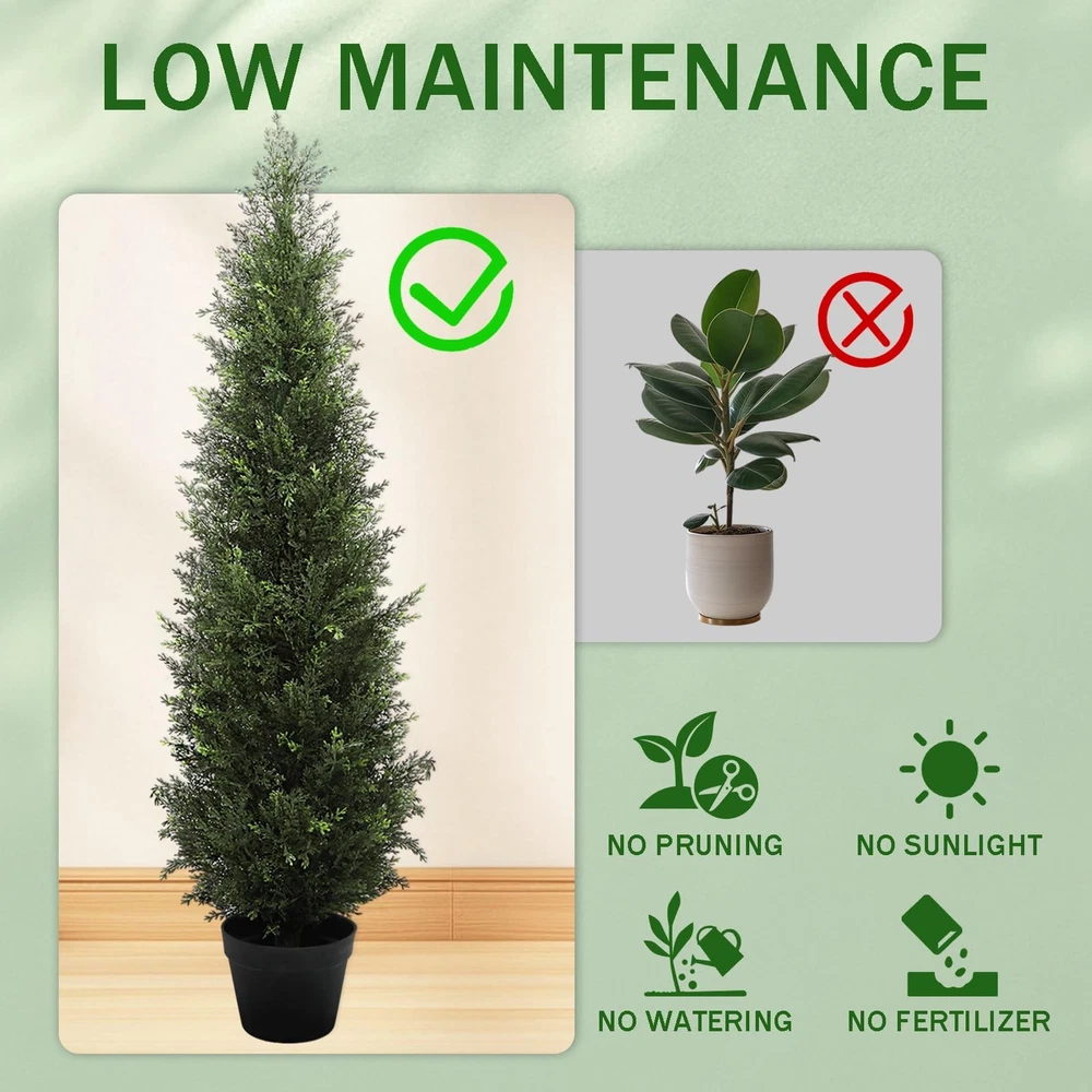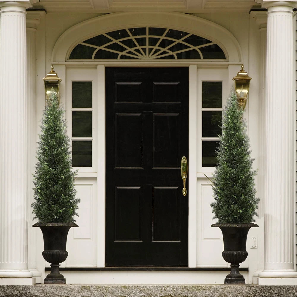 Transform your outdoor space with these stunning 3-foot or 4-foot artificial cedar topiary trees. This set of 2 potted cypress trees brings the timeless elegance of manicured landscaping without the maintenance. Each tree features meticulously detailed, UV-resistant foliage that maintains its rich green color throughout the seasons. The classic conical shape and dense branch arrangement create a sophisticated silhouette perfect for framing entrances, enhancing porches, or adding structure to garden designs. Arriving in sturdy black planters, these versatile decorative trees can be used straight away or transferred to decorative containers of your choice. Their realistic appearance and durable construction make them ideal for both indoor and outdoor use, offering year-round greenery without watering or pruning. At 3 feet or 4 feet tall, these topiaries provide the perfect scale for entryways, patios, or as accent pieces in your landscape design. ALL-WEATHER UV PROTECTION OUTDOOR TOPIARY TREES: Engineered with premium UV-resistant foliage that withstands intense sun exposure & heavy rainfall while maintaining true evergreen coloration. Perfect for permanent outdoor display on patios, porches, or garden landscapes without fading concerns ULTRA-REALISTIC ARTIFICIAL CEDAR TREES: Realistic textured cedar foliage and natural green coloring creates a convincing evergreen look; Two height options (3 ft and 4 ft) for versatile indoor/outdoor display coordination MULTI-FUNCTIONAL DECOR FOR EVERY SPACE: Creates effective visual barrier when placed in pairs; Use as windbreak partitions for pool areas, driveway border markers, or commercial property accents. Ideal for enhancing porches, front doors, gardens, patios, or indoor spaces with maintenance-free greenery, whether it is for home, office, commercial space, or holiday decorations, this cedar tree can easily create a different atmosphere and style ZERO MAINTENANCE ARTIFICIAL CEDAR TOPIARY TREES: Bring the beauty of nature into your space without the hassle of maintaining traditional plants. Special updated coating on the leaves helps maintain color and prevents fading when placed in outdoor settings. The premium construction makes them resistant to fading and weather damage. Perfect alternative for high-traffic commercial spaces or busy homeowners MULTI-LOCATION READY USE: Pre-potted in weighted planters for immediate placement stability, these topiary trees require no assembly and can be placed immediately for instant decoration. Weighted bases prevent tipping in windy conditions; Compatible with various outdoor surfaces (concrete deck gravel); Neutral planter complements modern and traditional decor schemes
