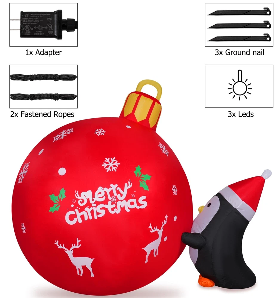 High Quality Durable Material: Made of high quality Polyester material, which is strong, secure and durable material, not easy to tear; The Penguin Push Christmas Bell inflatable is super easy to inflate, just zip it up and plug it in, you will see It go from laying down to fully inflated within a couple of minutes Build-In LED Light: This 4FT lighted Christmas Bell inflatable Decorations with 3 led lights inside, light up at night and make your home a new sight in your neighborhood; It adds a festive look to your holiday seasonal layout and welcome to your guests with warm wishes Stable and Steady Enough: Don't worry that the Penguins push Christmas Bell inflatables will fly away with the wind; It came with 3 stakes and 2 rope to hold in place if necessary; and built in sandbags; It is easy to stake down and seems fairly sturdy BLOW UP FAST: Setup is super simple; Just plug it in, everything pops up in a minute; The package comes with an extended cord, fan, ground stakes, fastened ropes, built-in sandbags, and a plug with UL certification Great for Festival: The Inflatables Christmas Bell fits harmoniously with the snow days in your garden in Christmas, creating a fun and memorable scene in your house or on your lawn during the holiday season; If used at outdoor, please make sure the Power plug away from water