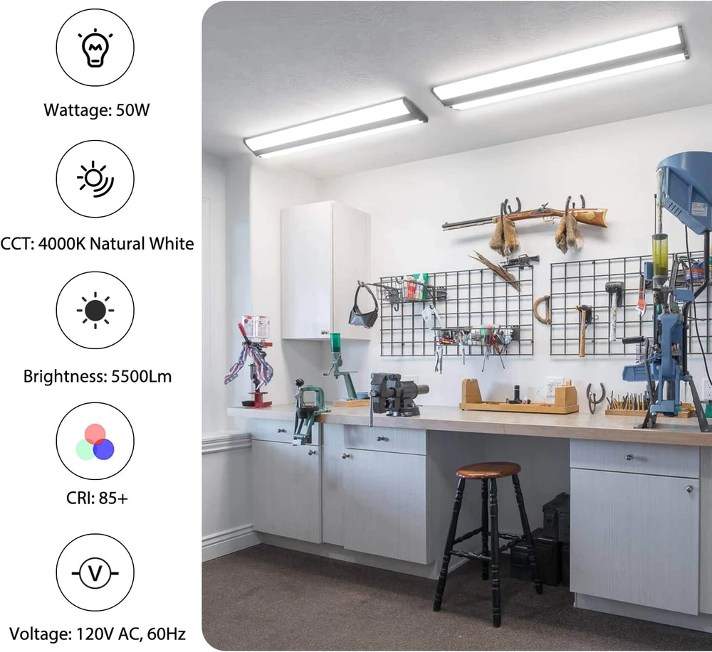 Store New Arrivals Add to Favorite View Feedback Contact 4FT LED Wraparound Light Fixture Ceiling Mount, Ultra Slim 50W LED Garage Light Flush Mount, 4000K Neutral White, 5500 Lumens Office Light, Fluorescent Fixtures , 4 Pack Description Light Source Type LED Style Modern Number of Items 4 Power Source Corded Electric Fixture Type Non Removable Number of Light Sources 4 Control Method App Switch Type Push Button Theme 4FT LED Lights for Garage Batteries Included? No Lighting Method Downlight Mounting Type Ceiling Mount Controller Type Push Button Unit Count 4.0 Count Room Type Storage Room, Laundry Room, Garage, Kitchen, Basement, Home Office, Hallway Assembly Required Yes Installation Type Flush Mount Product Dimensions 48"L x 6.53"W x 1.65"H Material Polycarbonate Efficiency 110lm/W Finish Type Sleek and smooth finish Specific Uses For Product Garage Bulb Features Not Dimmable Indoor/Outdoor Usage Indoor Brightness 5500 Lumen Country of Origin China Light Color White Water Resistance Level Not Water Resistant Batteries Required? No Item Weight 19.61 pounds Light fixture form Close to Ceiling Special Features Energy Efficient Special Feature Energy Efficient Part Number 4FT LED Lights 4 Pack Shade Color White Color Temperature 4000 Kelvin Color Black and White Wattage 50 watts Bulb Base GU10 Shape Rectangular Voltage 120 Volts Plug Format A- US style Recommended Uses For Product Garage, office, kitchen, laundry, closet, basement, workshop, entertainment rooms, storage rooms, school, meeting room, hallways, stairwells, warehouses, equipment rooms, industrial workstations, workplace, showrooms, industrial or commercial area, hallway, kitchen, storage room, laundry room, garage, home office Shade Material Aluminum, Alloy Steel Finish types Sleek and smooth finish Included Components Light kit inlcuded Size 4ft (4 Count) 👍 Ultra-Slim Profile and Lightweight - FaithSail 4FT led light fixtures are super slim, hugging the ceiling and putting out great amounts of beautiful white light. Lightweight construction is good for you to hang them from a ceiling easily. The height/thickness is 1.65 inches only. In addition to ultra-slim appearance, our fixtures are sleek, aluminum body with sealed lenses, which makes these particular wraparound lights look nicer and more stylish than many of the other types of wraparounds. 🔋 Energy Save and Economical - Energy saving up to 70%, 50 watts 4 foot led light fixture with 5500 lumens with less energy and significantly higher output, which is the perfect for the fluorescent fixtures. Super-bright but reduced electrical current draw. Ballasts and bulbs are not needed. Help you to reduce the cost for replace the ballasts and bulbs for your old fluorescent light fixtures. We provide you with 5-years of quality support so please buy it without any worries. ✨ Long and Eyes Care - Provides 50,000 hours of maintenance-free operation lifespan. Durable voltage and current make the light lit up without flickering and glaring. Very bright but easy on your eyes. Eye care design protects you from hurting, bring you comfortable lighting sight. With CRI 85+, our 4ft LED light fixtures will provide you with a higher color appearance for your stuff. 🔩 Super Easy Installation - The installation of the FaithSail 4FT garage light was pretty straightforward. The parcel will come with the installation instruction and all parts you needed to install. If anything missing, please just . We will get back to you with solution soon. 180°shining from two sides is very bright and there is not any noticeable delay when they come on. 📌 Wide Application - Good option to install this upgrade LED light fixture in your master closet and garage/carport, basement, laundry room, kitchen, office, shop, workshop, workbench, kitchen, laundry, closet, utility rooms, storage rooms, basement, barn, school, meeting room, hallways, stairwells, warehouse, equipment rooms, auto shops and replacing fluorescent light versions. Product Description FaithSail’s Ultra Slim 4FT Wraparound Led Light Fixture This 4ft LED light fixture is our best recommend led wrap light that will light up your garage in the most efficient and cost-effective way. The light will give you brighter, healthier and cheaper lighting than any other fluorescent light. Advantage of 4FT LED Wrap Light High performance: Super bright. 4ft led shop lights with 5500 lumens at 4000K neutral white, providing a super brightness but low energy, saving your electricity bill. Durable: Durable steel construction and outstanding thermal. The usage lifespan more than 50,000 hours. Unique Design: This 4 led light fixture not in high performance but also in good looking. 180° shining from two sides. Healthy and Comfortable: 4ft led light provides soft and comfortable light, no dazzle, uniform illumination. No flickering and glare-free. Linkable: knock out the end hole for linkable. Connect the wire correctly. End to end connection up to 4 led fixtures. Easy installation: Fast and no effort to install the 4ft led strip lighting according to the user manual. Technical Specifications Wattage: 50W; Voltage: 100-227V AC, 60Hz; Lumen: 5500lm; Color Temperature: 4000K; Power factor: 0.95 Average; Product domenation: 48*6.53*1.65 inch; Color rendering index (CRI): RA>85; : Lasting more than 50,000 hours. Widely Usage: 4 foot led lights is an excellent for warehouses, garages, basements, workshops, entertainment rooms, workbench, storage rooms, supermarket, industrial workstations, shop, retail shops, workplaces, showrooms and any other industrial or commercial area, etc. Package Include: 4 X Led Wraparound; 4 X Hardware; 4 X User Manual ABOUT US We offer the best prices around on high quality products. Our E-store includes media such as books, movies, music and games while offering electronics, toys, sporting apparel, clothing, tools, general home, garden items and more. SHIPPING We are always working hard to ensure your package arrives as soon as