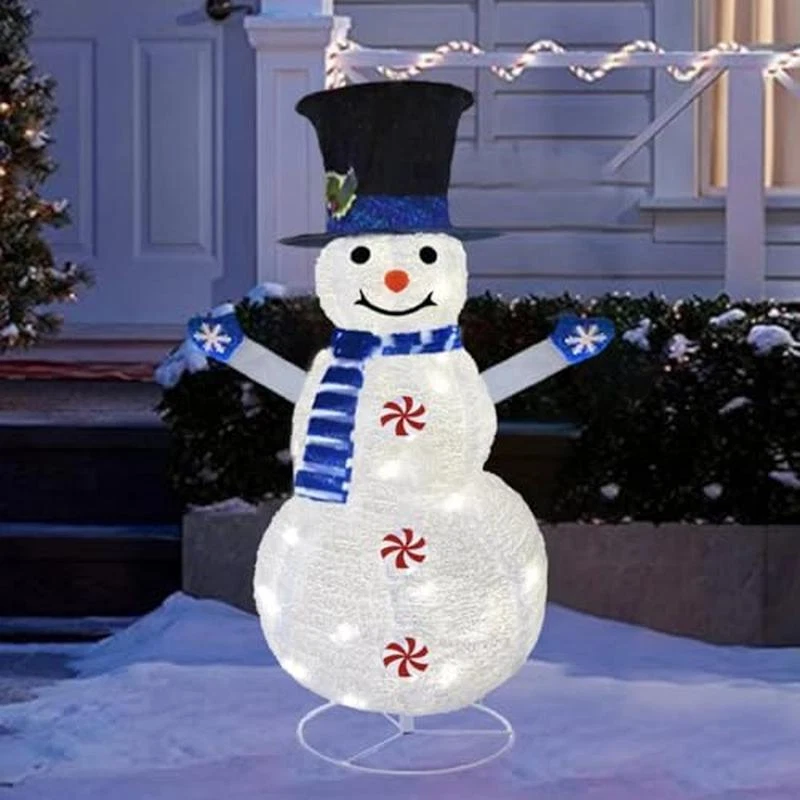 About this item Attractive Christmas Decor:Our lighted snowman is 4 ft tall, which is perfect decoration in Christmas season. With pre-lit lights,the outdoor snowman brings rich Christmas atmosphere. The Lighted hands say hello to everyone who visit your family. Lighted Collapsible Christmas Decoration - The 4FT snowman decorations with 120LT white light bulbs, wearing black top hat,Blue and white stripes scarf, carrot nose, bring warmth to families, creating a warm Christmas atmosphere Easy to Install - Collapsible structure makes easy assembly and storage. Christmas collapsible decoration no tools or specialized skills are required, you can use the ground stake to fix firmly if displaying outdoors in fine weather. (Please refer to the instructions for more details) Great Christmas Decoration - Suit for Christmas outdoor yard garden decorations, Christmas themed party, indoor & outdoor decorations, Christmas event decoration, Christmas Eve night décor, pop-up Christmas decor, winter decoration, party favor Christmas prop, classroom decorations and more. It is also an ideal and considerable Christmas gift for friends, family or relatives Safe and Durable - Pre-lit pop up Xmas decor Certified plug with built-in fuses meet US electricity standard, Low voltage provides the steady current during for steady and long-term operation. The stand is made of durable and high quality metal, and the surface is made of soft and thickened fabric, not easy to damage and can be used for years. ractical Application – Light up Christmas decoration are suitable for home, patio, lawn, garden, bistro, pub, cafe, restaurant, shopping center, supermarket, New Year, birthday, gathering, disco ball party, dinner party, evening party and wedding.
