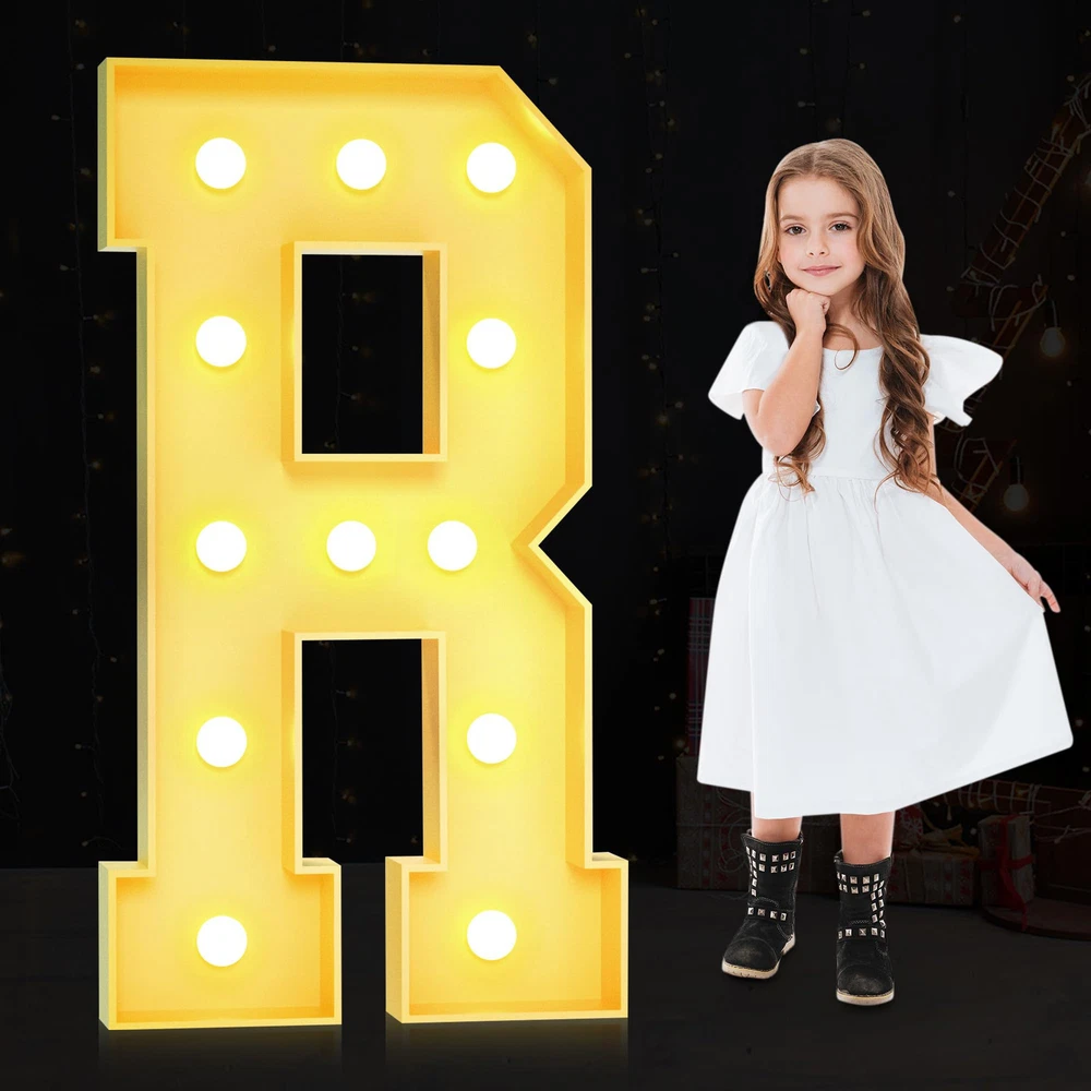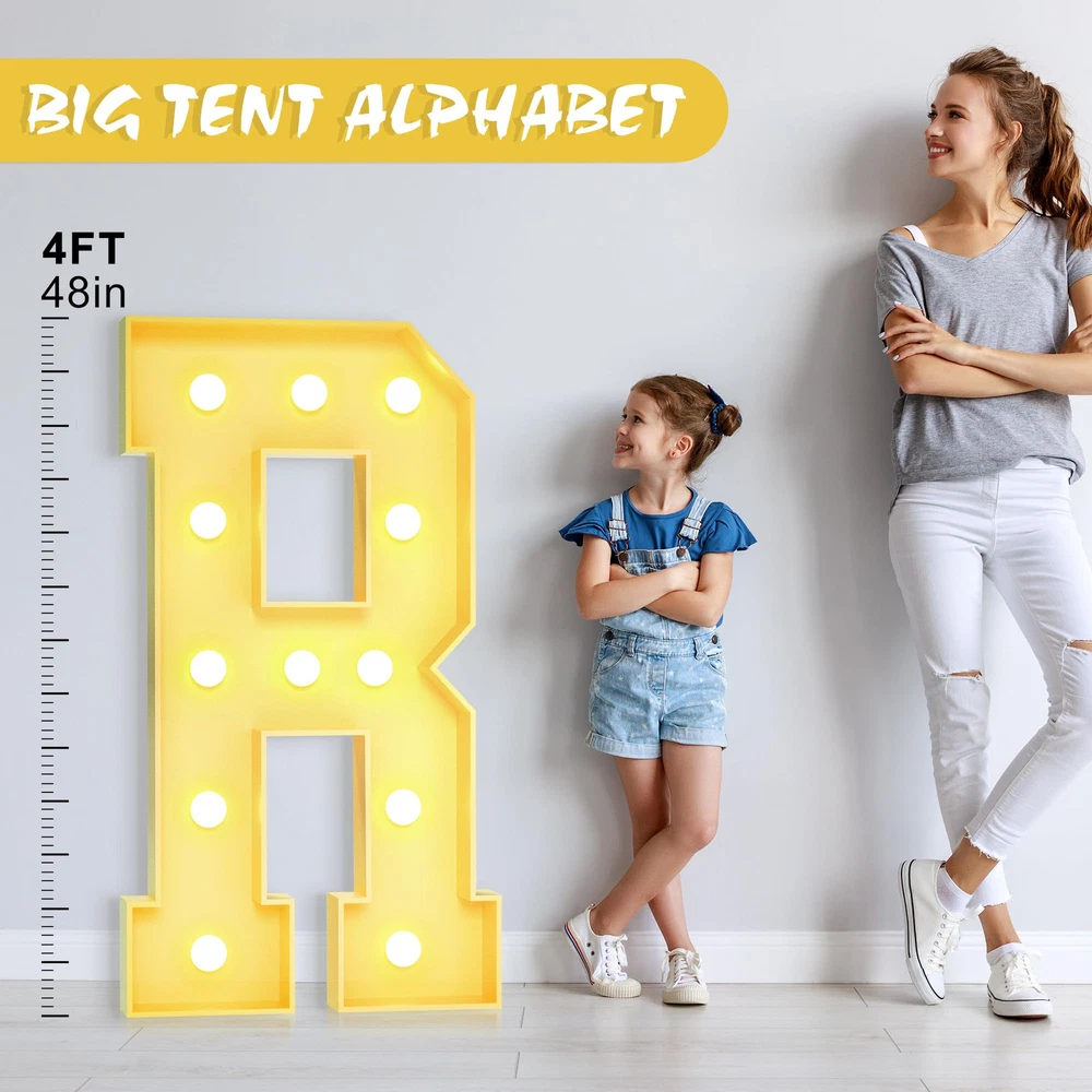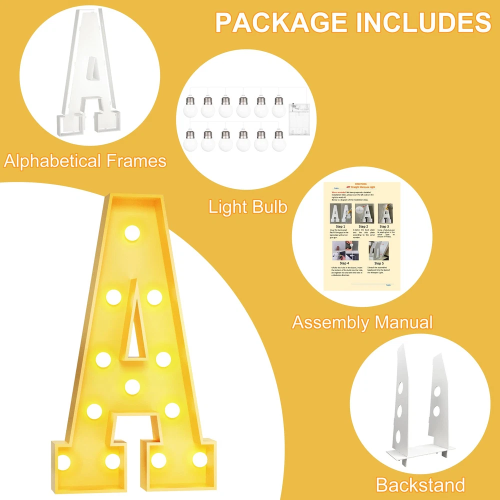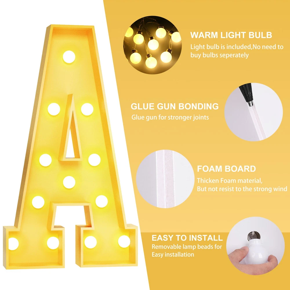1 Packaging: You will get marquee letters pre cut foam boards, operating instructions, light string.The light needs to be equipped with 3xAA batteries.(Noted: Glue and batteries are not included) Marquee letters 4 feet tall: 4FT giant marquee letters is an attractive decoration for your birthday party decorations, wedding, and creating personalized activities. Easy to assemble: The pre cut marquee letters group has been set. According to the detailed operation instructions, it only takes 15 minutes to build the marquee letters. Stability and firmness: The 4FT giant mosaic balloon frame is made of solid foam board, with a fixed plate at the bottom, so you don't have to worry about it turning over. Satisfaction commitment: we will provide high-quality after-sales service, and we will be happy to help you set up the marquee letters!