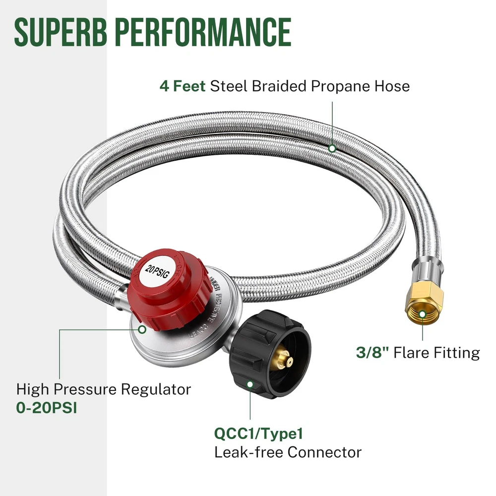 【Unsurpassed Gas Regulation & Stability of Gas Flow】 As ’s propane hose is equipped with an adjustable high-pressure propane regulator ranging from 0-20PSI, you can easily manage the flame depth and the heat degree of your grills, turkey fryers, fish fryers, burners, outdoor cookers & stoves, smokers, heaters, fire pits and propane forges. 【Built to Enjoy Durability & Longevity】 Featuring 4-layer hose construction, propane hose with high-pressure regulator is constructed from superb flame-retardant PVC and stainless-steel braid, which strengthens the propane hose’s sturdiness and its resistance to weather, tear and wear. 【100% Solid Brass Connections & Leak Proofness】 propane hose with regulator is at 4ft long and has a secure fitting with QCC1/Type1 propane tank connections. The other end of the hose is sealed with 3/8” flare fitting with an outside diameter of ⅝ inches, which fits for most propane appliances. Both ends of the propane regulator hose are accurately manufactured from high-quality brass to against corrosion and to provide an air-tight connection, ensuring 100% SAFETY! 【quality & CSA Certification】 Certified by CSA, the high pressure propane regulator with hose has a built-in protection device to automatically shut off to protect its users. What’s more, the propane hose is also known by its non-clogging inner tube to double the smooth delivery of gas flow from propane tanks to your fryers or griddles. 【1-Year 】hose regulator for propane tank are under 1-Year . As we value every customer’s voice and experience with our products and service, we provide 24hrs/7days non-stop customer support to you. Pls feel free to us whenever you are concerned about the product or after-sales service.