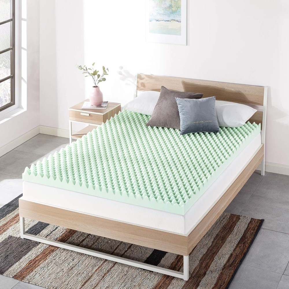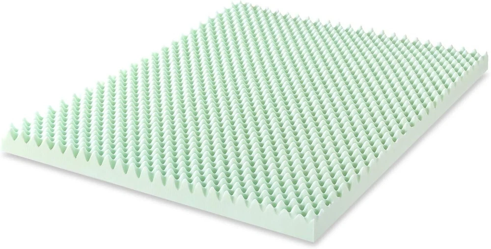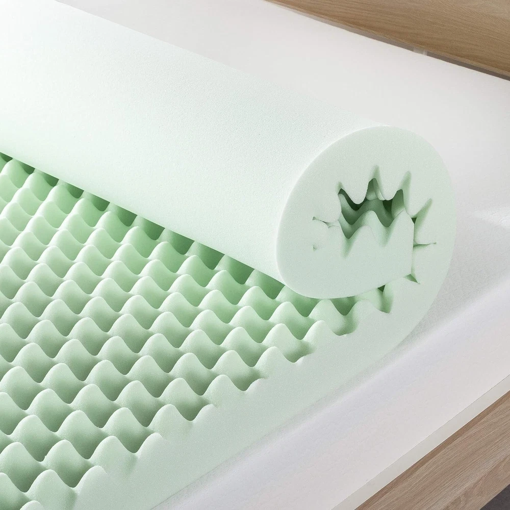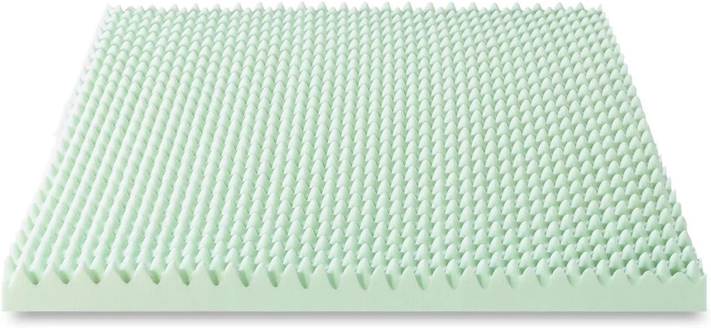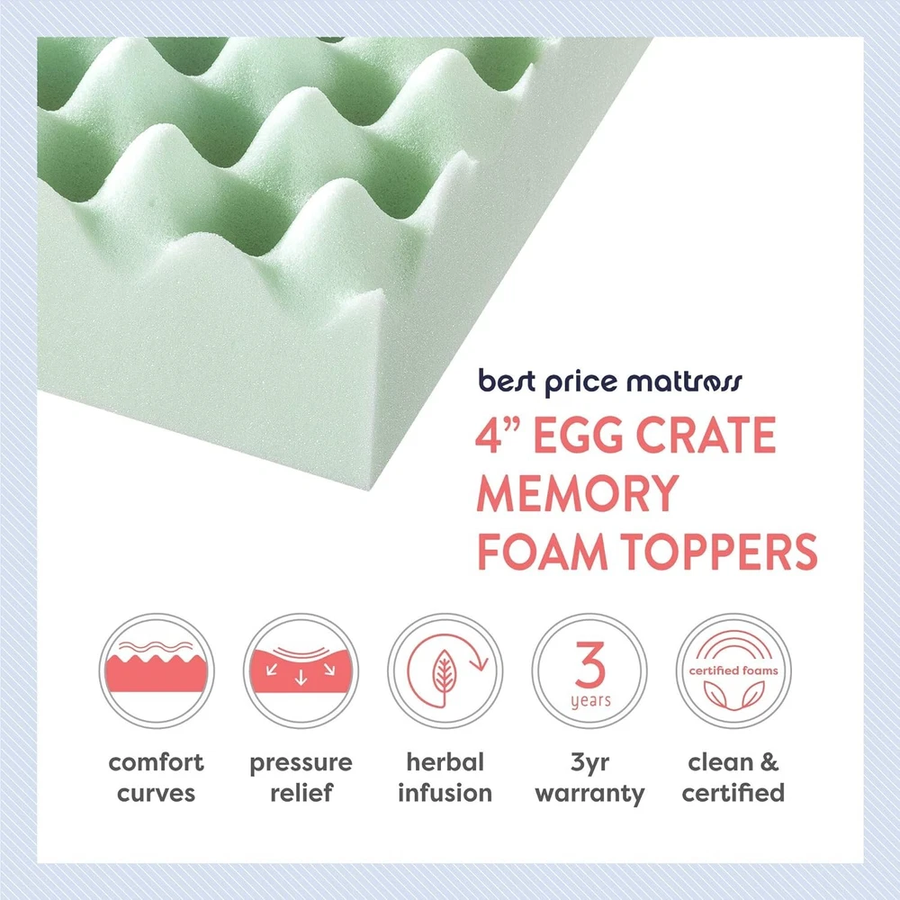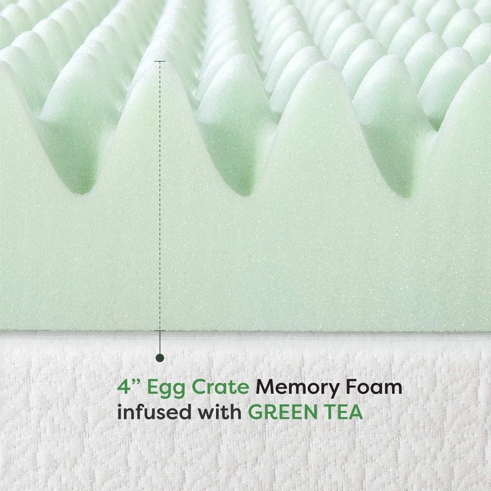 4 Inch Egg Crate Memory Foam Mattress Topper with Calming Green Tea Infusion, CertiPUR- Certified, Twin XL Memory Foam Please allow up to 72 hours for the topper to rise and any odors to dissipate 4-inch egg crate memory foam mattress topper designed for increased airflow Green tea infusion helps both you and your mattress stay refreshed with its calming effects and odor control Amazing comfort with body-conforming memory foam Responsive active suspension isolates motion to provide undisturbed sleep for you and your partner Made with CertiPUR-US certified foam for performance, emissions and environmental stewardship; 3- manufacturer's satisfaction green tea egg crate memory foam mattress toppers will ease you into a calming night's sleep with its green tea infusion. It's the memory foam you love infused with green tea to help both you and your mattress stay refreshed with its naturally calming and odor control benefits. Memory foam is well known for its body contouring features and pressure relief comfort throughout your whole body. Once you lay down, our memory foam toppers will start reacting to the temperature of your body and begin to mold itself to your shape, evenly distributing your weight. The egg crate memory foam structure is designed for better airflow while providing a customized level of support. Combined with our pressure relief system, you will enjoy total relaxation with ultimate support in key areas including the head, shoulders and hips.