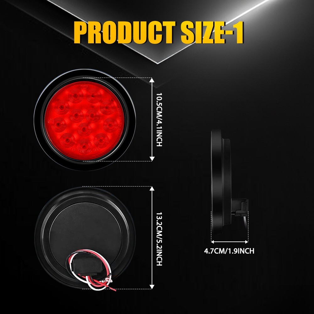 Specification: Light color: Red Shell diameter: 4 inches Material: ABS+PC+Rubber+Metal LED quantity: 12LED Voltage: 12v Waterproof grade: IP67 Service life: 50000h+ Features: *Upgraded LED: Each lamp consists of 3030 SMD LED chips with wider lighting angle and better heat dissipation. It is 3 times brighter than other products. *Waterproof: The tail light is highly silicon sealed with an IP67 waterproof rating, which works even under extreme conditions such as rain and snow. *Easy to install: Easy installation with direct replacement, other modifications are not required. *Unique design 4Inch Round Tail Lights w/ Mounting Bracket Red 2X Waterproof Universal Lights M Specification: Light color: Red Shell diameter: 4 inches Material: ABS+PC+Rubber+Metal LED quantity: 12LED Voltage: 12v Waterproof grade: IP67 Service life: 50000h+ Features: *Upgraded LED: Each lamp consists of 3030 SMD LED chips with wider lighting angle and better heat dissipation. It is 3 times brighter than other products. *Waterproof: The tail light is highly silicon sealed with an IP67 waterproof rating, which works even under extreme conditions such as rain and snow. *Easy to install: Easy installation with direct replacement, other modifications are not required. *Unique design The groove inside the ring has been upgarded, adding three bumps to make the connection between the ring and the taillight tightly.These help the tailights not to fall out and can be firmly fixed the seal ring installed on the mounting bracket.You don't need to worry about the loose lights or wires anymore! *Connection White wire connects to negative. Red wire connects to white light with high brightness Black wire connects to white light with low brightness *Functions It can be used as running lights, brake lights, taillights and so on .*Wide application: Universal Fits All vehicles with 12V Power Supply such as car, truck, trailer, Semi Trailer, Semi Trucks, boat, flatbed, bus, lorry, van, caravan, camper, RV Jeep etc. Note: Please check the detail information carefully before purchasing. Your satisfaction is our utmost concern, please feel free to contact us for any questions and concerns. Package Include: 4Inch Tail Lights w/ Mounting Bracket*2 ABOUT US 4Inch Round Tail Lights w/ Mounting Bracket Red 2X Waterproof Universal Lights M Specification: Light color: Red Shell diameter: 4 inches Material: ABS+PC+Rubber+Metal LED quantity: 12LED Voltage: 12v Waterproof grade: IP67 Service life: 50000h+ Features: *Upgraded LED: Each lamp consists of 3030 SMD LED chips with wider lighting angle and better heat dissipation. It is 3 times brighter than other products. *Waterproof: The tail light is highly silicon sealed with an IP67 waterproof rating, which works even under extreme conditions such as rain and snow. *Easy to install: Easy installation with direct replacement, other modifications are not required. *Unique design The groove inside the ring has been upgarded, adding three bumps to make the connection between the ring and the taillight tightly.These help the tailights not to fall out and can be firmly fixed the seal ring installed on the mounting bracket.You don't need to worry about the loose lights or wires anymore! *Connection White wire connects to negative. Red wire connects to white light with high brightness Black wire connects to white light with low brightness *Functions It can be used as running lights, brake lights, taillights and so on .*Wide application: Universal Fits All vehicles with 12V Power Supply such as car, truck, trailer, Semi Trailer, Semi Trucks, boat, flatbed, bus, lorry, van, caravan, camper, RV Jeep etc. Note: Please check the detail information carefully before purchasing. Your satisfaction is our utmost concern, please feel free to contact us for any questions and concerns. Package Include: 4Inch Tail Lights w/ Mounting Bracket*2 FAQ Shipping Returns Contact Us Payment Why swith to LED? LEDs not only give your vehicle a clean, modern look but, with proper use, will outlast any halogen bulb and HID bulb! Low energy draw, high lumen output, and instant on/off LED technology out shines stock bulbs in every way. Which bulbs are used in my vehicle? Check Sylvania automotive lamp replacemnt guide , you can select the year, make, and model of your vehicle, then select the application you want to replace or upgrade from stock. What does CAN Bus mean? CAN Bus means Controller Area Network Bus. This system monitors your vehicle and reports operating conditions. CAN Bus systems are commonly found in European vehicles such as BMW, Audi, Mercedes, Volkswagen, Porsche, and in many American vehicles. While most late model American vehicles have CAN Bus systems, it is always good to check with your vehicle dealer to see which system your vehicle has before purchasing electrical products. When do you need Warning Canceller? Some vehicles with cmplex internal computers(such as Audi,BMW,Jaguar,Mercedes,etc.) might report on-dash errors or flickering on the headlights. The warning canceller fixes the dashboard warning and flickering effect. Bulb Out Dashboard Error: On some vehicles, the dashboard will report as if you have a headlight bulb missing or burnt. It does not affect the headlights functioning, but the light on-dash will be on. The warning canceller fixes the issue. Flickering Issue: This happens when your vehicle does not recognize the new headlights installed. When turning the headlights on, the vehicle's computer does not understand the signal back from the headlights hence thinking they are still off. This triggers the headlight flickering effect. The warning canceller solves this issue. LED Advantages: Very low and efficient energy consumption than halogen bulbs & HID Bulbs Compared with HID bulbs, LED bulbs Light up instantly, no warm up period Low voltage protection, high precision constant current driver chip Longer lifespan than HID and halogen bulbs Light can be controlled easily in color and intensity Easy to