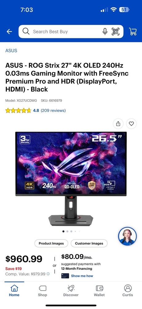 Very good condition 4K QD OLED 240 HZ Asus XG27UCDMG 27 inch monitor $750 OBO Brand new monitor goes for over $1,000 with tax - Normal usage and no pixels issues at all - No burn-in and no dirty screen effect - you can test it if you would like. - Perfect deep blacks with infinite contrast ratio featuring over 1,000 bits of peak HDR brightness - 0.03 ms response time - All the beauty of an OLED panel
