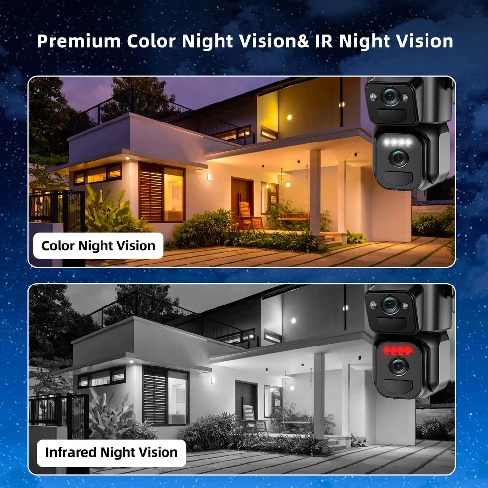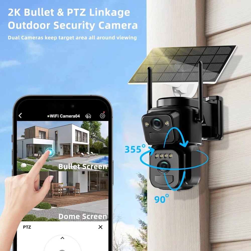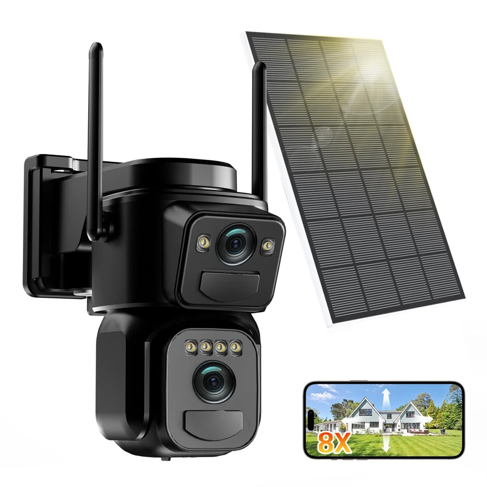 【4K HD Image & Color Night Vision】Outdoor solar security camera gives you 4K (3840 x 2160) Full HD, 8MP images and videos, sharper than other 2K or 1080P security cameras,You can Choose from 3 night vision modes. This outdoor camera was built-in CMOS sensor and IR lamp automatically detect ambient light and switch to color night vision mode for sharper detail and color images, even up to 65 feet of darkness. 【Dual Lens & 360°Coverage】This wireless outdoor wifi surveillance camera is equipped with two lenses that support 360° horizontal and vertical 90° PTZ rotation, providing you with 360° full protection with few blind spots. You can also manually rotate the security camera to see in different directions and remotely monitor any corner via the app to protect your belongings and family! 【2.4Ghz WiFi & Solar/Battery Powered】solar security cameras wireless outdoor supports 2.4Ghz Wi-Fi connection (5GHz not supported). With the solar panel, just connect the camera to the solar panel for continuous power supply. Built-in high-capacity battery allows continuous power supply through the battery even in bad weather or low sunlight, providing uninterrupted protection for your home for 365 days. 【2 PIR Motion Detection & Auto Tracking】Built-in sensitive PIR motion sensor effectively distinguishes human from other things and reduces false alarms. Once any abnormality occurs in the monitored area, you can receive a real-time push on your mobile phone. The solar camera outdoor wireless automatically tracks the movement of intruders and activates the alarm sound and spotlight to deter unwanted visitors.Support custom detection areas, only focus on key areas. 【2 Way Talk & IP66 Waterproof】With the latest IP66 waterproof rating, the outdoor camera can be used in extreme weather with a temperature range of (-4°F~122°F) without worrying about extreme cold and heat. In addition, solar camera also supports multi-user connection and multi-person sharing, just share the sharing QR code to your family and friends, then you can realize multi-person sharing to protect your home together.