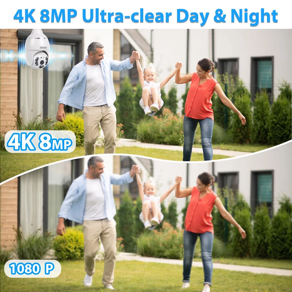 Please note that this camera is larger than a regular light bulb. Its height is 8.3 inches and its diameter is 3.9 inches. Please confirm that the size of this camera is suitable for the size of your light fixture before purchasing. [4K 8MP Ultra HD Video Resolution] : This surveillance camera produces 4K Ultra HD Video Resolution, it is built-in 4pcs IR LEDs+4pcs white LEDs with 31ft w/b and 65.6ft FULL-COLOR night vision, providing you with a super clear viewing experience. All captured by this camera will be presented to you via fluent and stunning videos. With 355˚ pan, 110˚ tilt, 4x digital zoom, you can remotely control the pan-tilt-zoom feature via the App anytime anywhere. [Wireless & 2.4Ghz and 5Ghz Wifi]: Compatible with E26 / E27 light socket makes it quite easy to install this security camera, screw this camera into a light socket(110V~240V), NO DRILL, NO WIRING, NO POWER CABLE, NO HARD SETUP, then open the free app to set up the camera within minutes. Perfect for Outdoor and indoor use! [ONVlF Conformant]: This IP camera is compatible with most other 3rd party software & Most NVR. Set a Password on the O-KAM App to Enable Onvif, RTSP address: rtsp://[username]:[password]@[ip]:10554, the username is admin. [Motion Detection & Auto Tracking & Real-time Alerts]: this PTZ dome surveillance camera adopts a highly sensitive motion sensor. If some people invade your home, this security camera will track the motion and record every single move, together with a VOICE ALERT if needed [Multiple View & Double Storage With Privacy Protection]: You could share your camera with friends and family to view simultaneously on your phone. Save videos to SD card ( Not included ) or cloud storage (3 days free trial every month ). With high-level encryption, your videos can be only viewed by you even if this wifi camera was stolen or broken, no one can access your videos