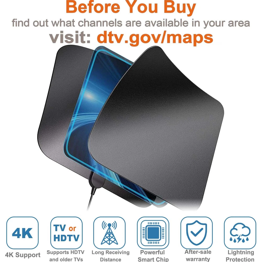 ✔️【Note 1】: Always remember to re-scan for channels after moving the Antenna. Before you buy, visit - "dtv gov maps" information is useful. ✔️【Note 2】: Please switch the amplifier to "short range" if your house is very close to the broadcast tower (within 35 Miles). ✔️【A MUST-HAVE FOR CUTTING DOWN MONTHLY BILLS TO RECEIVE THE CHANNEL WITHOUT MONTHLY BILLS! & FULL HD CHANNELS】: Our HD antenna can receive FULL HD Channels like ABC, CBS, NBC, PBC, Fox and so much more. With amplified TV antenna start to access all of the news, sitcoms, kids, and sports programs! A MUST-HAVE FOR CUTTING DOWN MONTHLY BILLS TO RECEIVE THE CHANNEL WITHOUT MONTHLY BILL! ✔️【UP TO 1000 MILES RANGE】: The indoor HDTV antenna can reach up to 1000 miles and can be placed almost anywhere in your Home. Digital antenna constantly scans for new channels as they're made available for broadcast. Hang the indoor antenna on a window or wall, or better position where it has a better reception of your house. ✔️【FULL HD CRYSTAL-CLEAR TV & HD SOUND QUALITY】: Our smart TV antenna has been upgraded with a new type of Smart Switch control Powerful 2023 Amplifier Signal Booster with built-in Smart IC Chip Next generation & Crystal Clear Filter Technology to pick up signals within 250 miles range. The new technology filters out cellular and FM signals resulting in clearer picture, low noise, and access to more free broadcast TV signals with enhanced gain, range, and frequency performance.