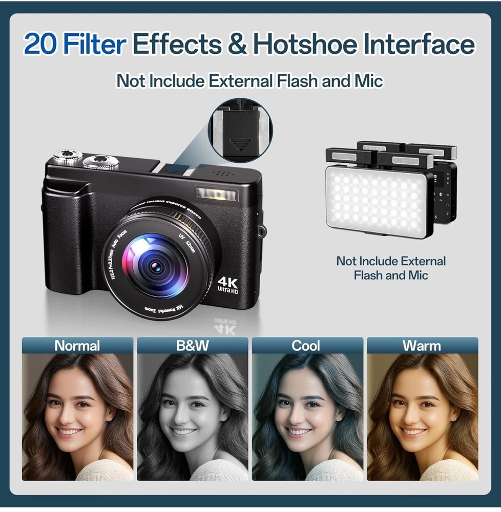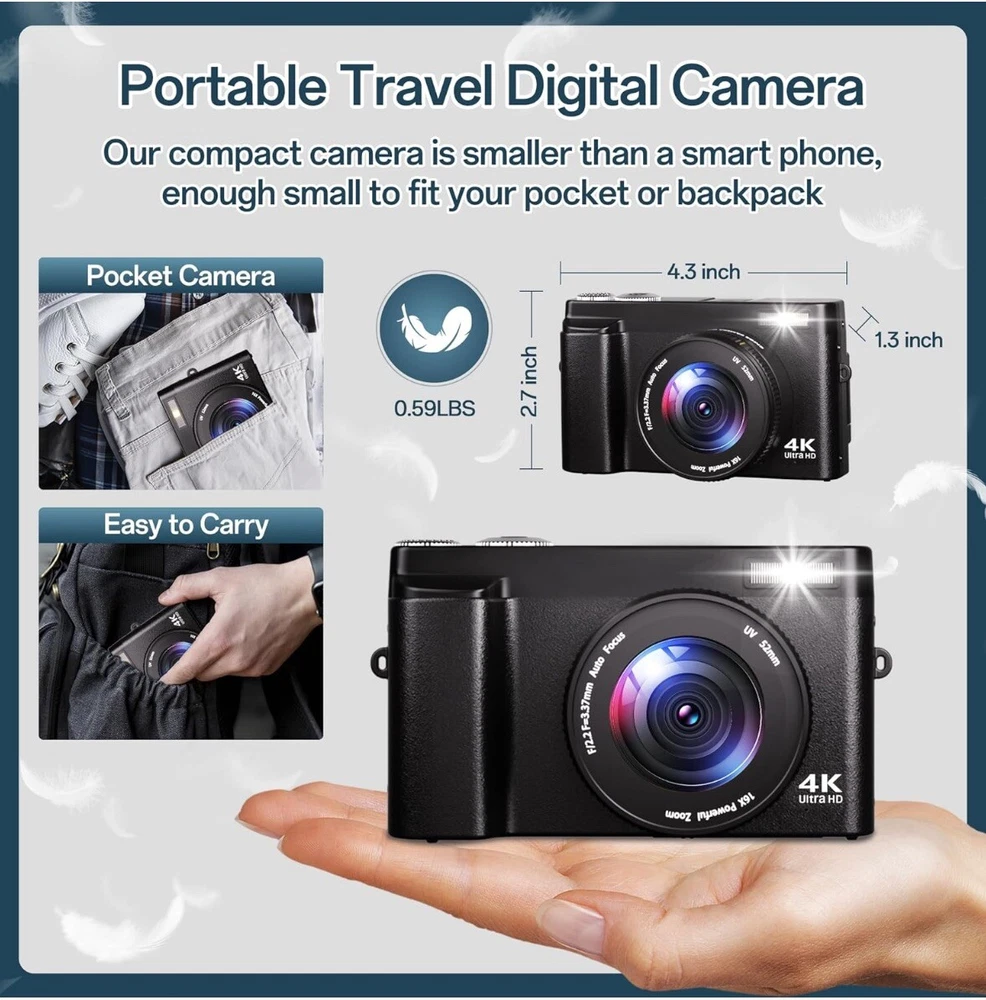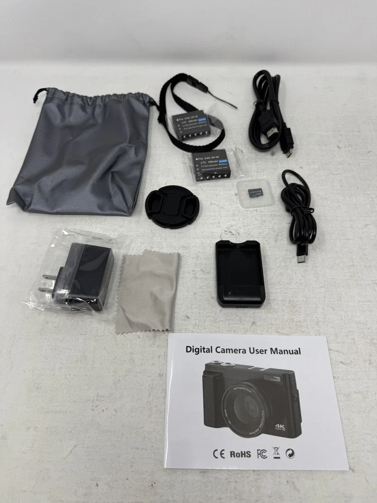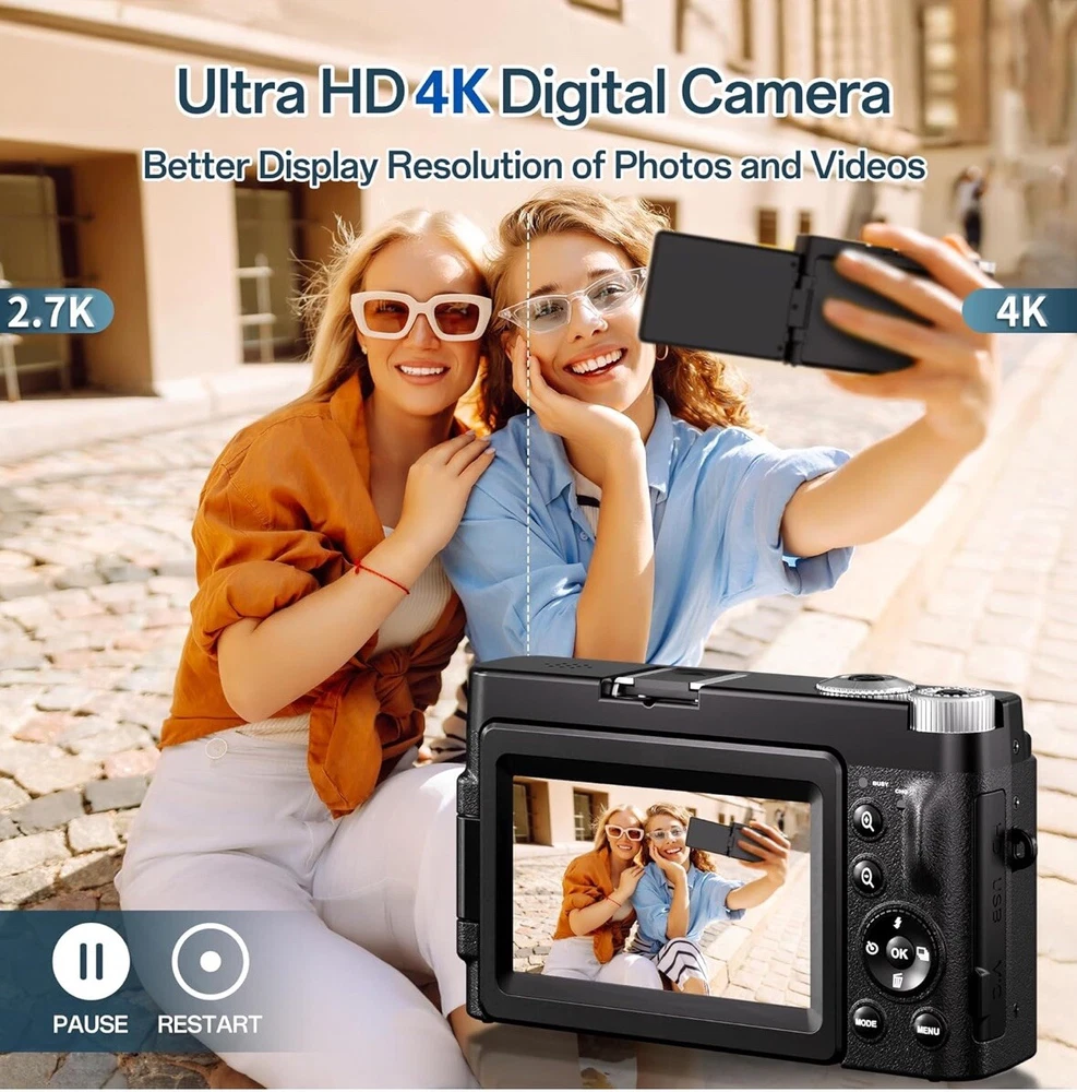 Brand new Capture Stunning Images: With a 48MP sensor and 4K video recording capability, this digital camera delivers sharp, vibrant photos and clear, high-definition footage, perfect for both photography and videography. User-Friendly Design: The autofocus system ensures blur-free shots, while the 3-inch 180-degree flip screen makes framing selfies and vlogs effortless. Connect via HDMI for easy file transfer or use as a webcam. Compact and Travel-Ready: Weighing just 0.59lbs, this lightweight camera fits easily in your pocket or purse. The included dual batteries and charging stand ensure extended shooting time, ideal for travel or extended events. Versatile Features: Enjoy a range of creative options like 16x digital zoom, continuous shooting, slow motion, 20 filter effects, smile and face detection, and time-lapse, making this camera suitable for beginners and experienced creators alike. 30 days free returns: Item must be returned in exact SAME condition, with all accessories, components and original packaging in order to receive a full refund, otherwise a deduction will be applied based on the condition of your return.