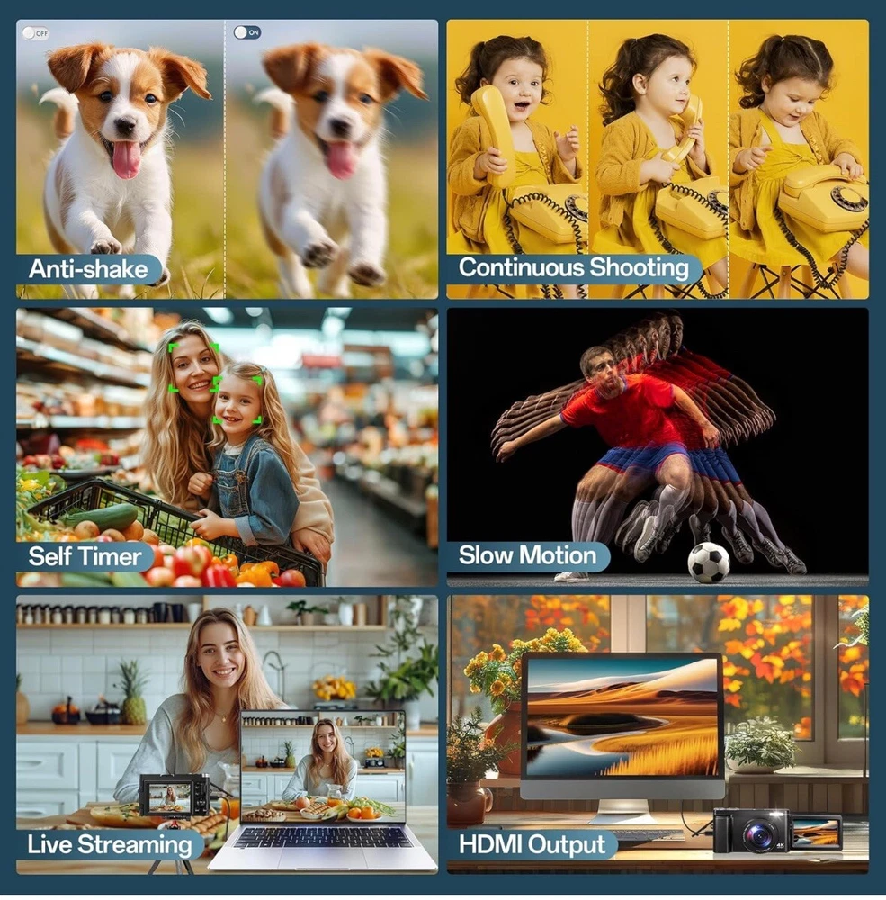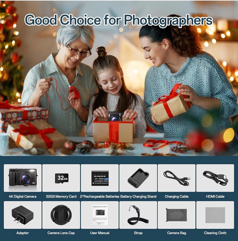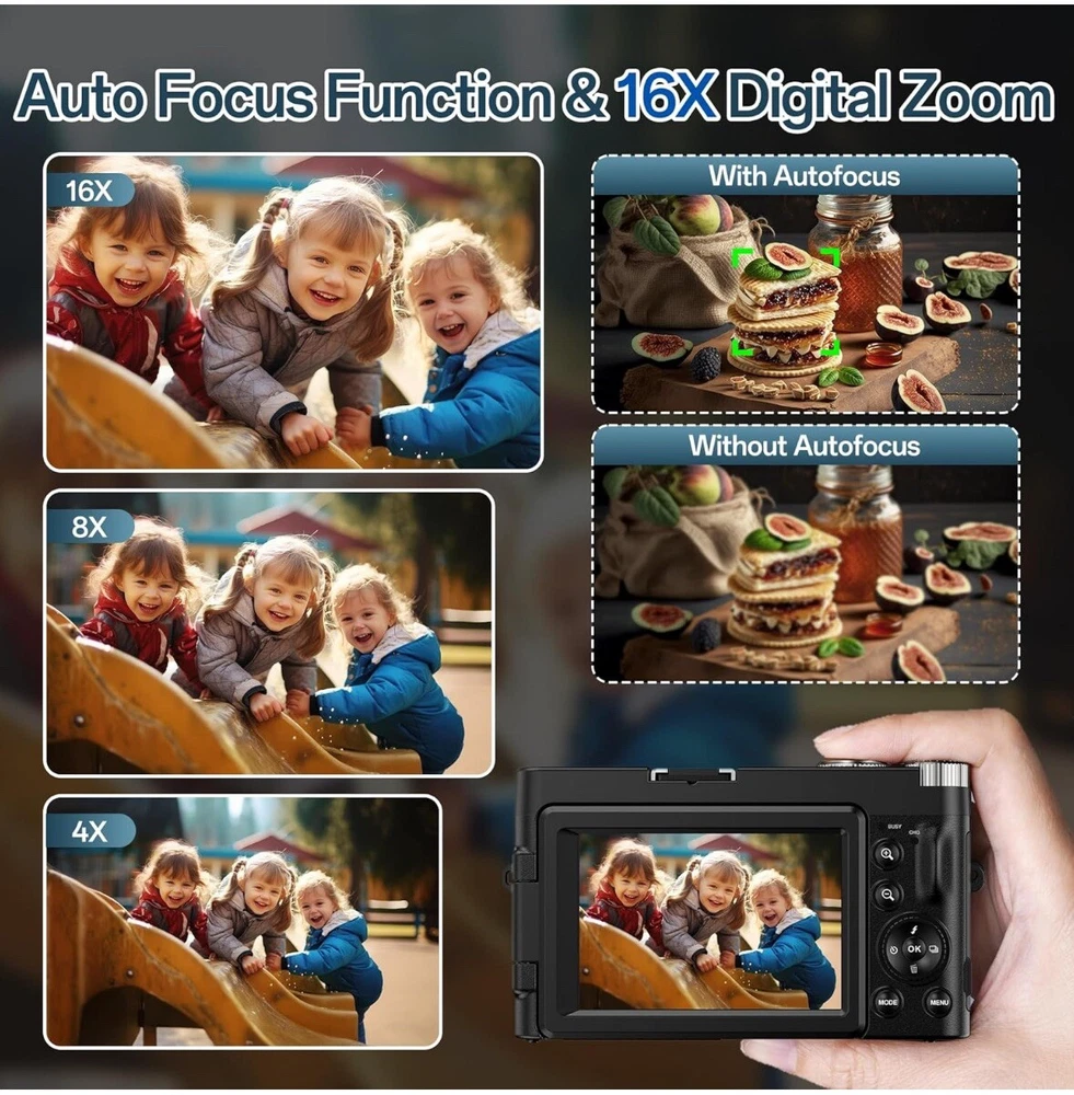 Brand new Capture Stunning Images: With a 48MP sensor and 4K video recording capability, this digital camera delivers sharp, vibrant photos and clear, high-definition footage, perfect for both photography and videography. User-Friendly Design: The autofocus system ensures blur-free shots, while the 3-inch 180-degree flip screen makes framing selfies and vlogs effortless. Connect via HDMI for easy file transfer or use as a webcam. Compact and Travel-Ready: Weighing just 0.59lbs, this lightweight camera fits easily in your pocket or purse. The included dual batteries and charging stand ensure extended shooting time, ideal for travel or extended events. Versatile Features: Enjoy a range of creative options like 16x digital zoom, continuous shooting, slow motion, 20 filter effects, smile and face detection, and time-lapse, making this camera suitable for beginners and experienced creators alike. 30 days free returns: Item must be returned in exact SAME condition, with all accessories, components and original packaging in order to receive a full refund, otherwise a deduction will be applied based on the condition of your return.