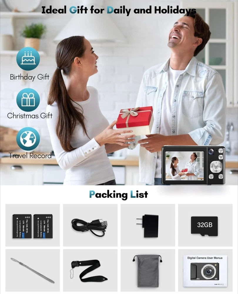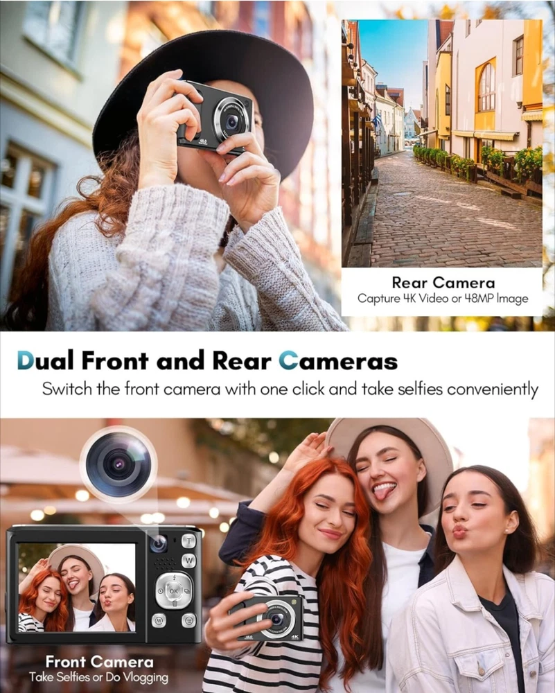 4K Digital Camera, 48MP Autofocus Cameras for Photography,Vlogging Compact Camera with Front and Rear Camera, 16X Zoom Protable Point and Shoot Cameras with 32GB SD Card,Anti-Shake,2 Batteries