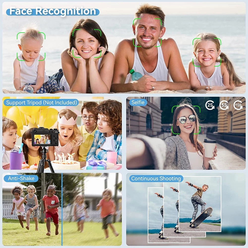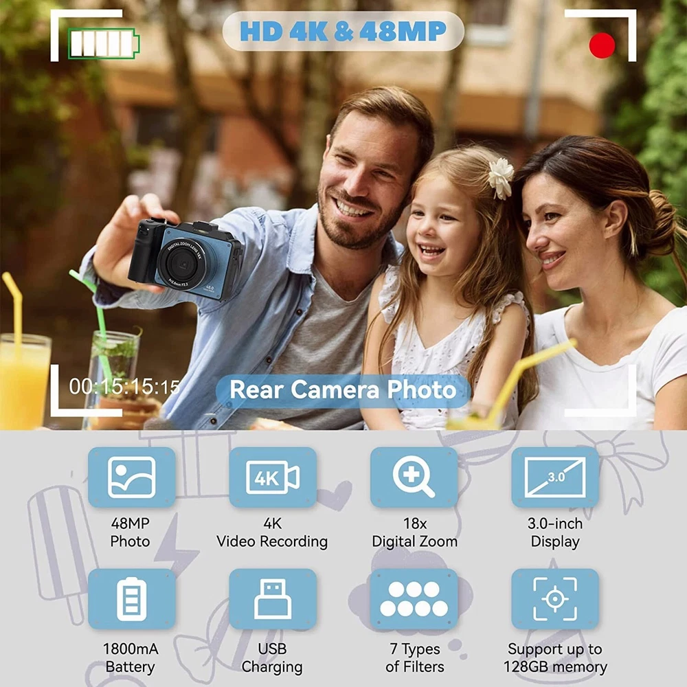 About this item Dual cameras: This cameras for photography with the newest unique design, dual cameras. Switch the front and back cameras at any time, as convenient as you use your phone. Jiugongge design 4k digital camera : With Jiugongge photography composition design, you can use this setting to help improve the composition of your photos. 8 Camera filters: There are 8 camera filters on this 4k camera for photography, and one button to get more personalized pictures. Long battery life: This vlogging camera for youtube comes with a large-capacity battery, and the working time is about 150 minutes. Real Auto Focus: You don't need to press any buttons when shooting, just wait about 2 seconds, and this 4k vlogging camera will automatically focus on the subject. Wifi Function and Upgraded Mic: This digital camera for teens with wifi function and an upgrade mic. You can not only record the smile, but also the most beautiful sound. No Adapter: Considering that everyone has an adapter for their smartphone and to reduce waste, this package does not include the adapter. Product Description OIEXI's Digital Camera For Photography - Flexible Capture Of The Subject Friendly Tips: Please format the memory card through this camera when using the camera for the first time. (Including 32GB TF card) Due to long time transportation, the digital camera battery will be in a low battery state, please charge before use. Charging is complete, the green light goes out. The battery is installed in the camera can not be turned on, the light will not light. Please be careful to keep the camera away from water or other liquids. This camera is not waterproof. The rear camera is covered with a lens protective film, please remove the protective film when using. Portable And Easy To Operate The digital camera weighs only 0.48 pounds, is compact and lightweight, and can be used with a wrist strap that hangs from your hand and is easy to carry anywhere. Important Parameters Image Sensor: CMOS 13-megapixel sensor, up to 48-megapixe Digital Zoom: 18 x digital zoom Aperture/Focal Length: Fixed lens F/2.2, f=2.0mm Focusing Range: 3.93 inches~infinity Sensitivity: AUTO/ISO100/ISO200/ISO400 Photo Resolution: 48MP(9344*5256), 30MP(7296*4104), 24MP(6528*3672), 20MP(6144*3456), 16MP(5376*3024), 12MP(4608*2592), 8MP(3840*2160), 7MPHD(3648*2048), 5MP(3072*1728), 3MP(2304*1296), 2MPHD(1920*1080) Video/Photo Format: AVI/JPG Video Resolution: 4K(3840*2160), 2.7K(2688*1520), FHD(1920*1080), HD(1280*720) Display screen: 3.0 - inch TFT screen Storage Media: External TF card (up to 128G) Battery: one NP-120/1800 mAh lithium-ion battery can work 170 minutes