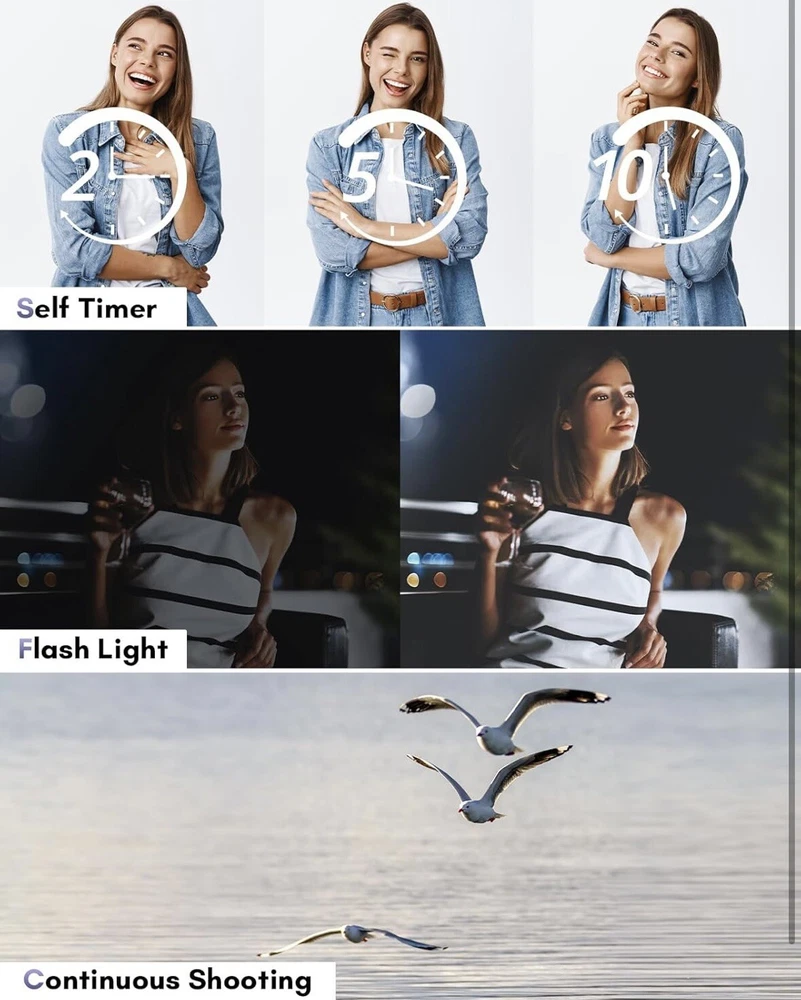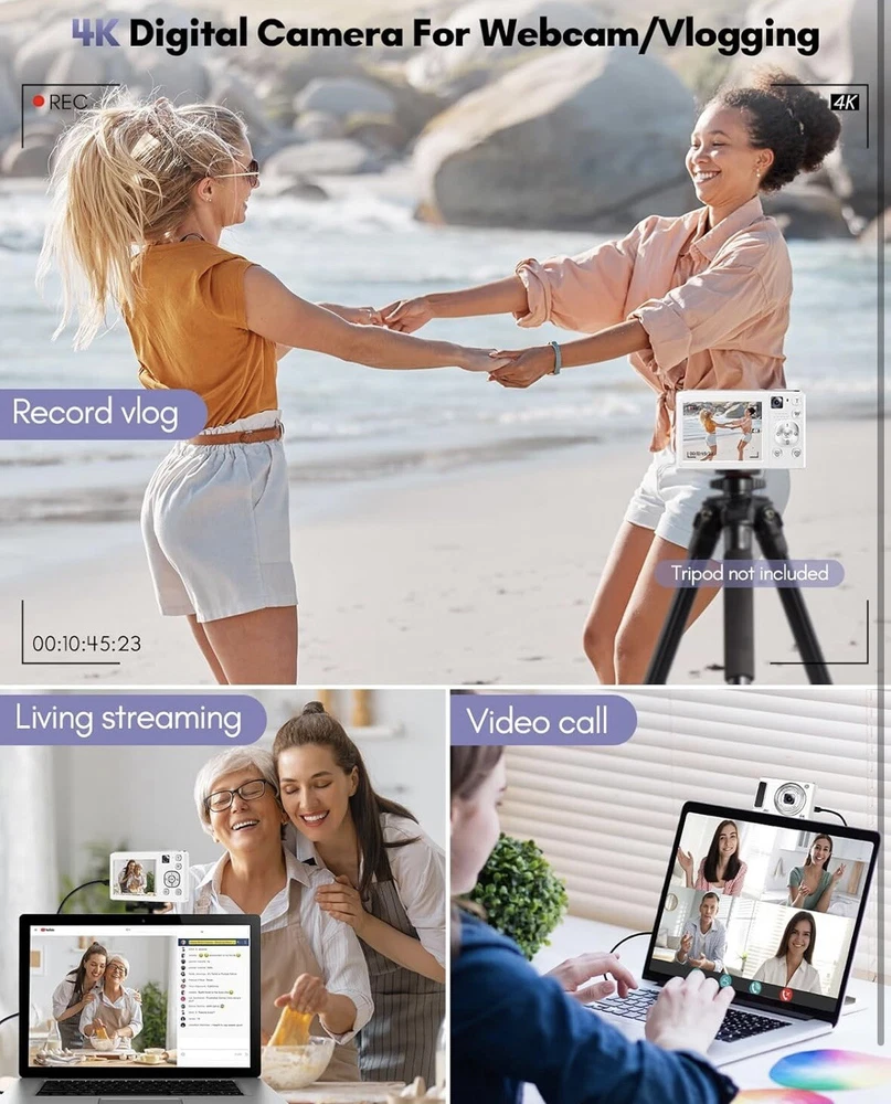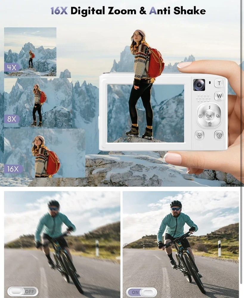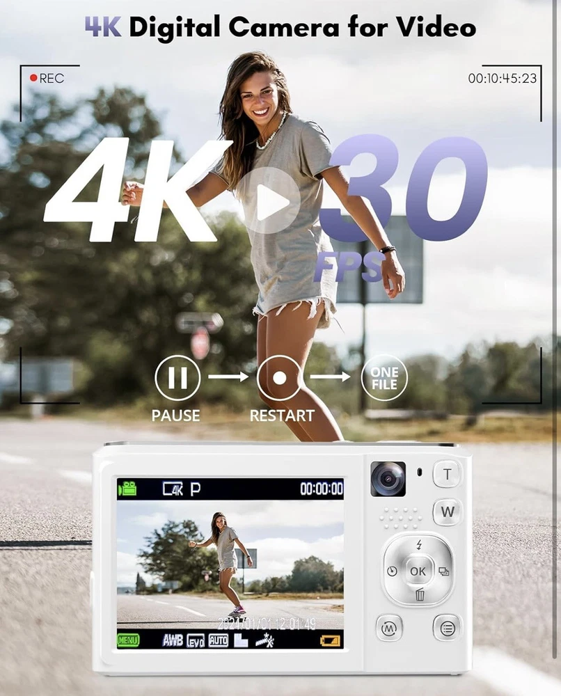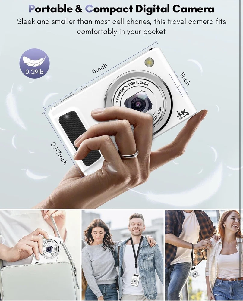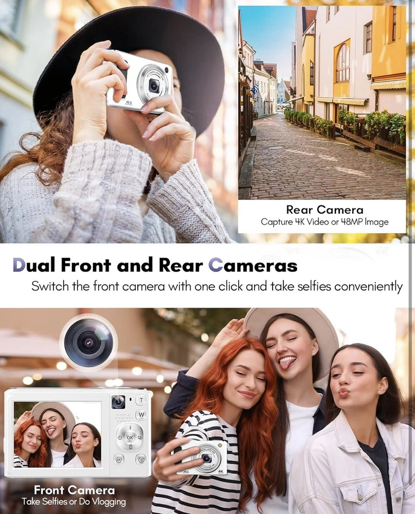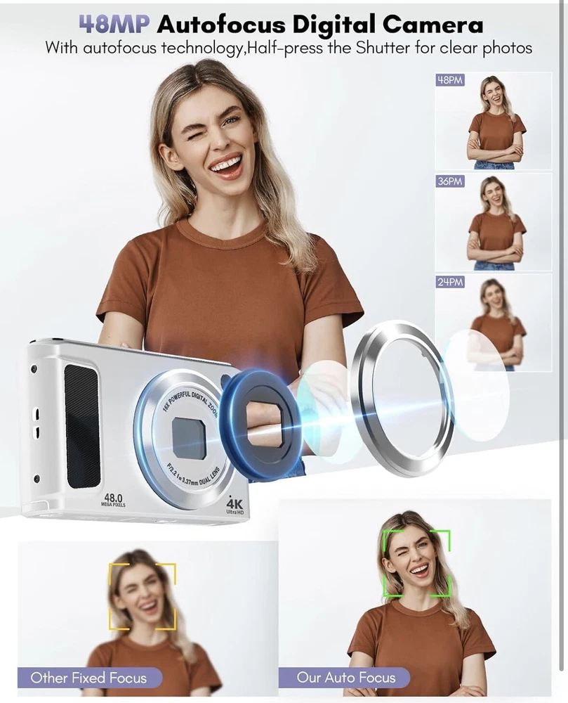 【48MP Dual-Lens Digital Camera, Easily Record Your Travels!】This digital camera uses the latest CMOS image sensor system, allowing you to easily capture stunning 48MP HD images. Equipped with dual lenses, it enables one-touch switching between selfies and landscape photos without the need for assistance. Even beginners can take amazing photos of people, scenery, selfies, and more during their travels! 【Autofocus 4K Digital Camera for Photography】This compact digital camera features an innovative autofocus system. In photo mode, lightly tap the capture button to keep the camera steady to activate autofocus. When you see the focus frame on the screen change from yellow to green, the focus is complete. Fully press the capture button to take the clearest and most vivid photos. The W/T button allows you to adjust the 16x digital zoom, making it easy to capture distant scenery. 【4K Video Blog Camera with Pause Function】This video blog camera supports 4K video mode, and the dual cameras can switch the content and composition perspective as you wish. Press the "OK" button to pause while recording or playing back video, making use of the pause function. The camera also supports mounting on a tripod for use as a webcam. Equipped with two rechargeable batteries and the ability to record while charging, you never have to worry about running out of power during shooting. 【Portable and Versatile Features】This portable small digital camera is equipped with a 2.8-inch IPS screen and is extremely lightweight, making it perfect for your pocket when you want to travel light without carrying a ton of lenses. This digital camera also offers a variety of image styles, self-timer(2/5/10S), 3-continuous shooting, face recognition, anti-shake can make the picture stable and clear, and fill light allows you to take high-quality photos in low-light conditions.