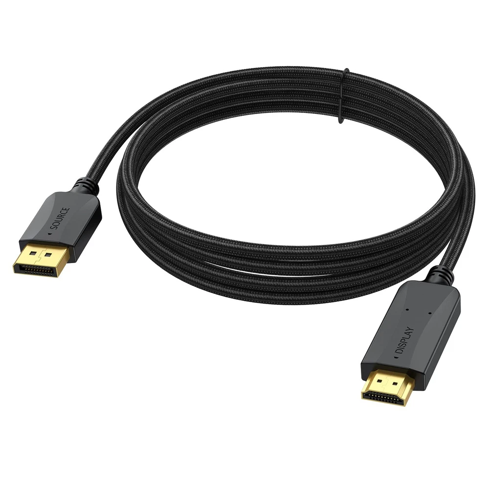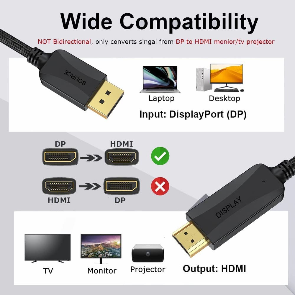 DisplayPort to HDMI Cable 10 Feet 【Compact Structure】Exclusive design, compact, simple and fashionable, perfect for use with multi interface laptop and desktops. With its extra-long 10ft reach, you get the freedom to organize your space without compromising signal quality 【4K Universal Display Compatibility】Extended Desktop mode and Mirrored Display mode are make you better entertainment experiences from a small or old computer. Support high video industry-leading 4K UHD (3840×2160) @30Hz clarity with multi-format support, including QHD (2560×1440) @60Hz and Full HD (1920×1080) @120Hz for universal display compatibility. 【Attribute】Convenient DisplayPort to HDMI cable directly connects a DisplayPort (DP, DP++, DisplayPort++) output equipped computer to an HDTV, monitor, or projector with HDMI input(This is unidirectional,Only convert signal from DP to HDMI, but can't HDMI to DP) 【Premium Material & Durable and Flexible】No Flicker. No Blackouts. Just Flawless Visuals: By engineering a premium cotton-braided jacket (more durable and flexible than standard nylon), alongside UL 20276-certified construction, gold-plated contacts, pure bare copper conductors, and layered foil+braid shielding, we guarantee superior cable stability and interference-free transmission. For silky-smooth gaming, razor-sharp work, or cinematic depth—this is HD without limits. 【Support Advanced System】Windows7, 8, 8.1, 10, Chrome OS, MacOS High Sierra 10.13.4 or higher and backward compatible 【Please Note 】This DisplayPort to HDMI Cable not HDMI to DisplayPort Cable. Can only transmit signal from DisplayPort Computer to HDMI Monitor. Keep your Computer with DP Port not HDMI Port.