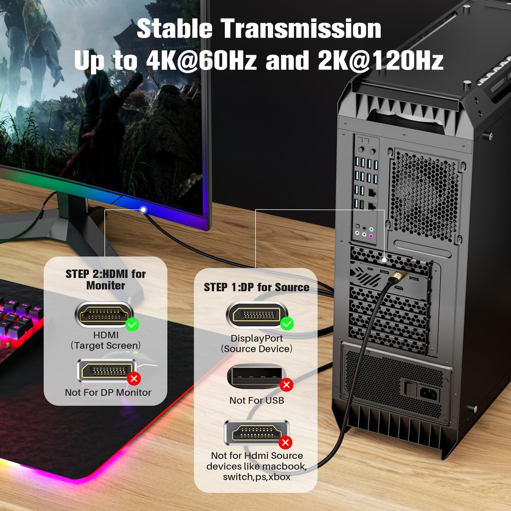 【4K Ultra HD & 60Hz Lossless Transmission】Supports 4K@60Hz ultra-clear resolution, perfectly presenting the details of HDR images. Through the one-way compatibility technology of DisplayPort to HDMI , it ensures zero-delay transmission. Compatible with high-definition devices such as Xbox/PS5/Blu-ray players, it creates an immersive home theater experience. 【Signal Stable Transmission】Utilizing Uni-Directional transmission technology, it supports stable conversion from DisplayPort output port to HDMI input port. With an internal signal amplifier, it ensures no attenuation and perfectly matches Windows/MacOS/Linux systems. 【Plug and Play】The DisplayPort to HDMI cable is fully plug and play, without the need for drivers, power, or wasting time. It supports high-definition audio and video streaming directly from a computer to an HDMI monitor, suitable for video streaming or gaming. 【Multi-brand Fully Compatible Solution】The intelligent identification chip supports plug-and-play, perfectly adapting to Dell/Alienware, Lenovo Legion, ASUS ROG, Acer Predator and other brand devices. At the same time, it is compatible with NVIDIA GeForce/AMD Radeon graphics cards, and seamlessly connects to monitors, TVs and projectors. 【What You Will Receive】DisplayPort to HDMI Cable, a 12-month warranty and friendly customer service. We aim to provide our customers with high-quality products and services. If you have any questions, please let us know and we will solve the problems for you as soon as possible.