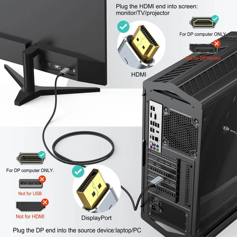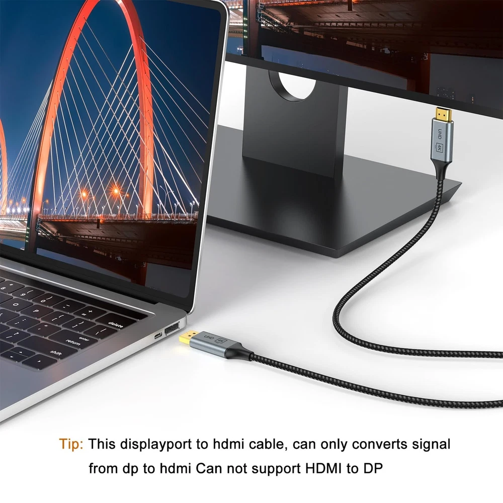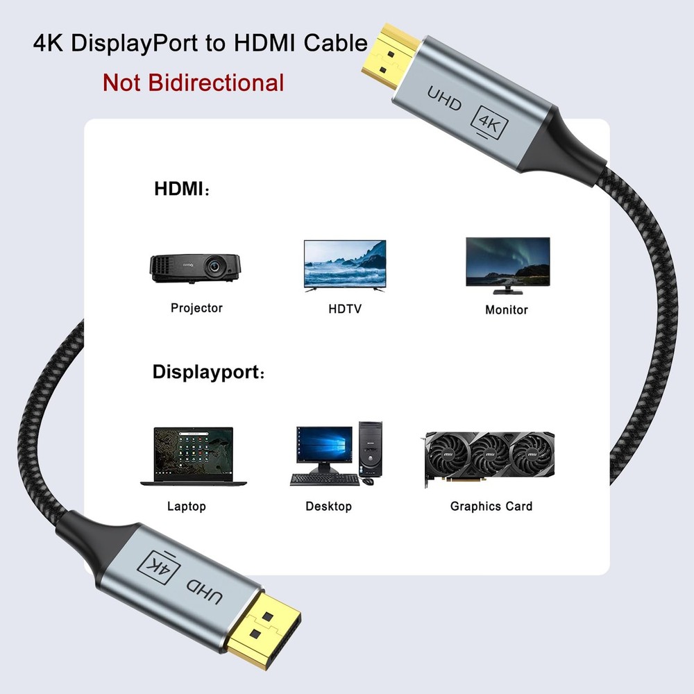 DisplayPort to HDMI 【4K Visual Feast】4K DisplayPort to HDMI Cable Supports 4K Video, Backward backward compatible with 2560 160060Hz and 1920 1080P120Hz , and HD 720P. Also supports HDR, Audio Return Channel (ARC), Dolby TrueHD 7.1 audio, 3D video. You can enjoy Ultra-high-definition audio-visual experience 【Immersive HD Video Streaming Experience】Delivers high-definition audio and video from your DP computer to HDMI, supporting extended or mirrored modes. Handles resolutions up to 4K30Hz, 2K60Hz, and 1080P120Hz for any 4K game and ultra HD video streaming. High refresh rate (2K 60Hz, 3D, HDR) let you enjoy the immersive family entertainment and gaming experience. This is a one-way cable for DP to HDMI, not work for HDMI to DP. 【Universal Compatibility】Perfect works with laptops (HP ProBook, Lenovo ThinkPad), desktops (HP, Dell, Lenovo), and graphics cards (AMD, NVIDIA). Note: This is a one-way cable for converting DisplayPort to HDMI and does not work with HDMI source devices 【No Flicker,No Black】4k dp to hdmi has 24K gold-plated connectors, 100% copper wire, triple tin shielded, with a new smart IC chip, so that the ensuring stable signal transmission and more durable. It reduces flickering, providing a comfortable gaming experience without motion blur, screen tearing, or flickering. 【Mini Size, Easy to USE】Twice Forming Die Casting and fabric braided nylon cable provides you with a heavy-duty Display Port to DisplayPort to HDMI adapter and effectively prevents cracking. Slim shell size frees you from the worry of getting in the way of nearby ports. 【】We should always provide the customer with good service after .