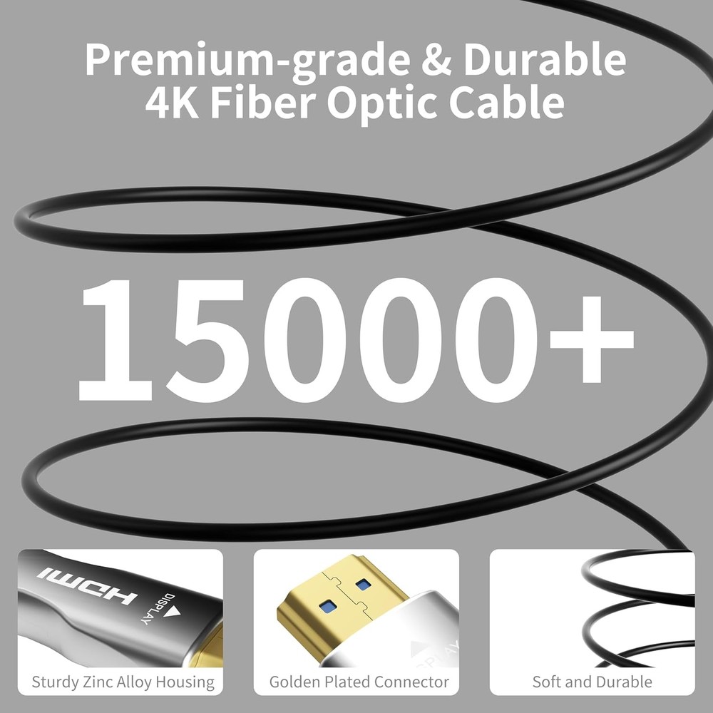 4K Fiber Optic HDMI Cable 35ft, High Speed 2.0 Cable, 35FT, Silver Product Details Product Dimensions : 5.51 x 3.94 x 2.36 inches; 2.12 ounces Item model number : SilverV2-FBA Manufacturer : MavisLink Brand: MavisLink Connector Type: HDMI Cable Type: HDMI Compatible Devices: DVD Player, Laptop, Projector, Television, Xbox Special Feature: High Speed ⚡️【High Speed HDMI Cable】This upgraded HDMI 2.0 cable adopts the latest fiber optic technology chip, supports bandwidth up to 18Gbps, transmits audio, video and photos at lightning speed without waiting for buffering. Fiber optic HDMI cable also supports Ultra HD 4K 2160p, ARC, HDR, HDCP 2.2, Dolby Vision. As a result, this HDMI cable provides enhanced depth, brightness, detail, contrast and wider color gamut for Ultra HD movies, giving users a smoother and clearer viewing experience. ⚡️【Immersive Cinema-like Sound Effect】The ARC feature of the Ultra HD Fiber Optic HDMI cable enables more advanced audio signal control. With Dolby Atmos and Dolby Vision enhancing audio details, you'll have an immersive multi-dimensional experience, giving you the best visual experience of Ultra High Definition while you would enjoy the movie theater quality sound. Plug and play, it is an essential HDMI cable for your home theater, friend gatherings and office equipment. ⚡️【Premium Construction for Durability】Our fiber optic HDMI cable features 24K gold-plated plugs for enhanced durability and resistance to oxidation. The high-quality metal shell design improves heat dissipation, while the lightweight PVC material allows flexible bending of the HDMI cord angle for long-term durability. The HDMI cables enable uncompressed and lossless signal transmission over long distances thanks to the natural resistance of optical fiber to electromagnetic interference. ⚡️【Suitable for Various Devices】Fiber optic HDMI cable is HDMI to HDMI interface and is compatible with all HDMI devices. Such as Apple TV, HDTV, XBox One, PS5, PS4, Blu-ray player, computer, laptop, monitor, projector, etc. It's also backward compatible with earlier versions of HDMI cable 1.4/1.3/1.2.