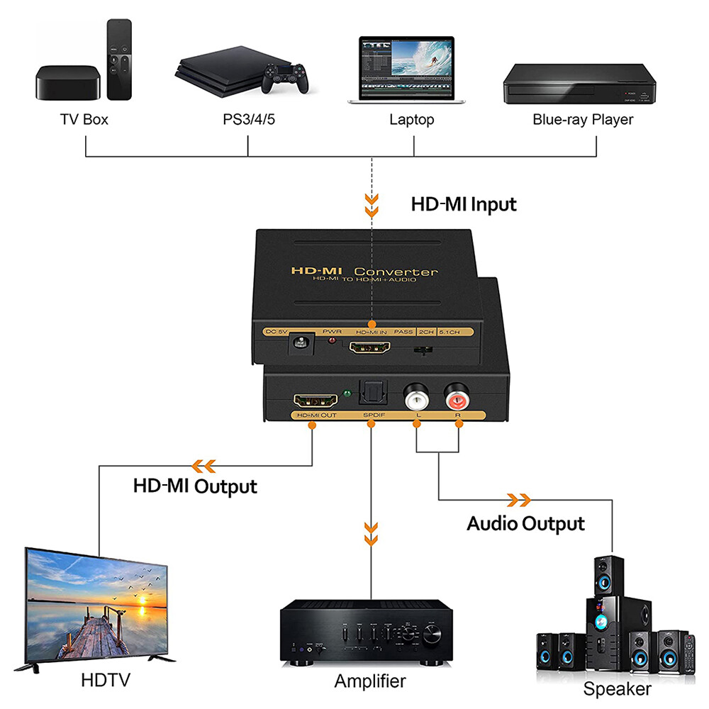 Home Arduino Module Sensor Chips About Us Features The 2-port HDMI Audio Extractor analyzes two HD Display/TVs connected to one HDMI source and also extracts the audio signal from the HDMI source. You can convert the original HDMI audio signal to digital optical or 2-channel analog audio output. This product supports Dolby Digital AC-3, DTS, LPCM and other digital audio formats output, which is a perfect audio extractor. HDMI Audio Splitter Extractor: [Upgraded 4K@60HZ version] avedio Link HDMI to HDMI Audio Extractor Converter can extract audio from digital HDMI signals to amplifiers, Soundbar, speakers, etc. via optical SPDIF or RCA L/R stereo audio output. It allows separate output to an audio receiver without powering up the HDTV/monitor. 4K 60Hz High Resolution: HDMI 2.0 Sound Insertion Extractor supports up to 4Kx2K@60Hz, HDR 10, HDCP 2.2, YUV 4:4:4, 3D, 36-bit deep color and 18 Gbps bandwidth. Gold-plated eco-friendly interface adds audio stability.HDMI audio splitter adapter delivers impressive high quality HD video for a stunning visual experience. Three audio output modes: HDMI audio extractor adapter has three audio modes to choose from PASS, 2.0CH, 5.1CH. RCA L/R output supports PASS, 2CH PCM, LPCM stereo audio; optical SPDIF output supports PASS, 2CH PCM, 5.1CH Dobly Digital, Dobly True HD, DTS-HD, DTS. note: this HDMI sound extractor is not supported. Widely compatible: HDMI to HDMI audio converter works with various HDMI source devices. HDMI input: Blu-ray player, DVD, HD player, cable/satellite box, Apple TV, PS3/PS4/PS5, Xbox, PC/laptop, HD camera, Fire Stick, Roku, HD DVR, etc. HDMI output: Full HD TV, monitor, projector. Audio output: speakers, amplifiers, loudspeakers or other sound systems. Specifications Product name: HDMI Audio Splitter Resolution: 4K 60Hz Interface type: HDM| interface / optical interface / double lotus interface Power input: DC 5V2A Product Size: 8.45*6.18*2.1cm Product material: metal Product Color: Black Packing list 1*HDMI audio splitter 1*USB cable 1*User manual Payment Shipping Refund Payment We accept PayPal only. But we only Accept your Ebay Address ,Please Make sure it's 100% right. Payment must be received in 5 business days of auction closing. Please leave note for your special request (e.g. Colors or Size) in PayPal when you pay the order. Any special request cannot be accepted after 24 hours of payment, because most of orders will be processed instantly and same day dispatched. Shipping Fill your shipping info Refund All package need to wait 30 days (US only n eed 7-10 days) , Please take care it.Less than 30 days,we can't take a refund . If the item is defect when you receive it or you are not satisfied with it, please return it within 14 days for a replacement or money back. But the items must be back in factory condition. Please contact us and double check the return address before you return it. If is item is defective in 12 months, you can return it to us. We will send you a new replacement after receiving the defective item.